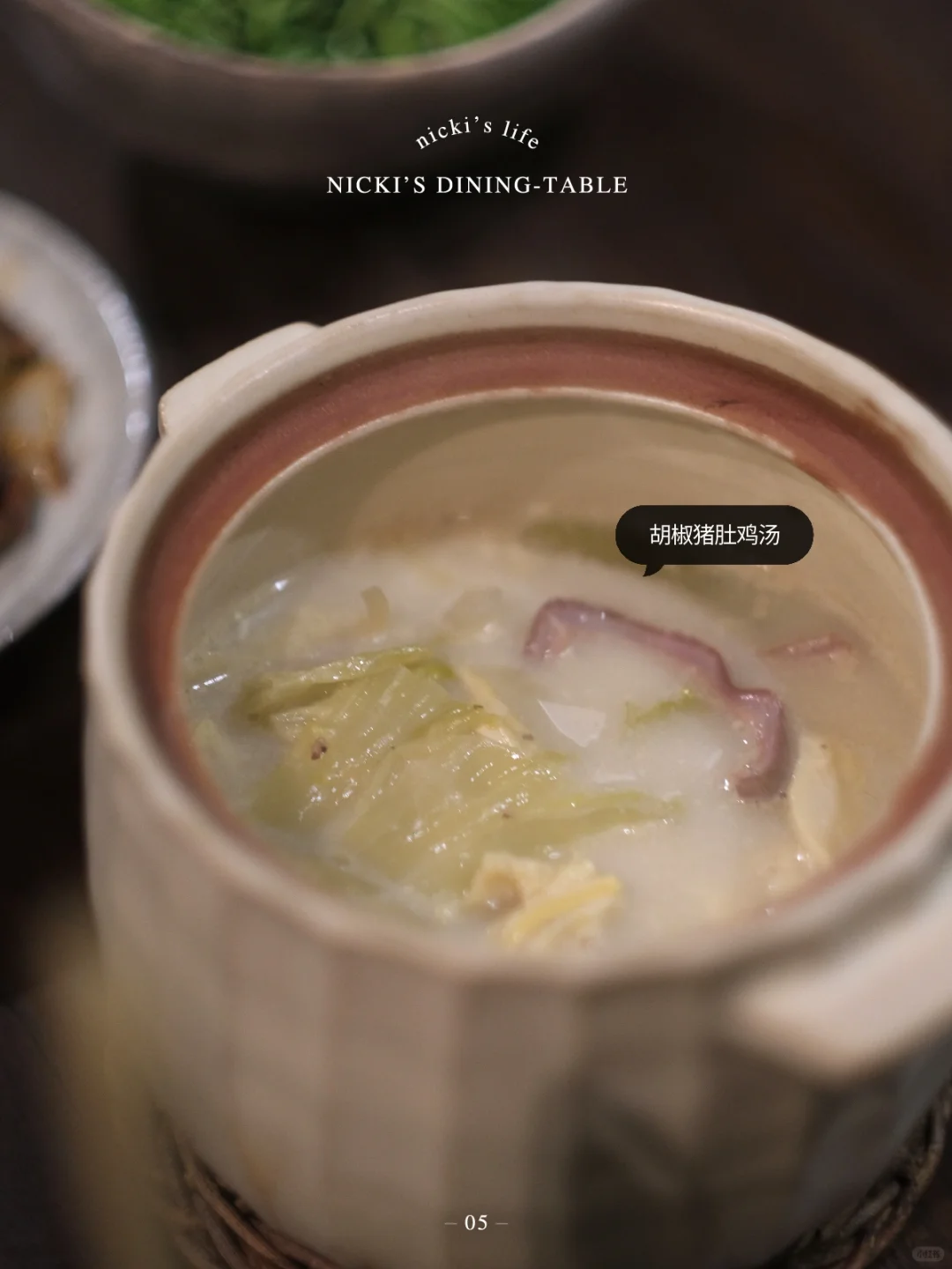 五一之前结束了牙套生活,虽然还要带保持器,但也很满足,终于可以安心吃咖喱、啃脆苹果、吃长韭菜….… - 节假日里,路上的车没见少反而比平日里更多了,别说去旅游,连出门吃顿饭都不太愿意。 - 不知道是不是被深圳4月的天气热到,回到上海觉得温度很舒服,晚上竟然还有一丝凉意。胡椒猪肚鸡汤没想到5月喝也挺合适,如果怕味道太浓郁,推荐大家可以放酸菜一起炖煮。 🥗 菜单: -避风塘烤鸡 -豆豉炒牛肉 -清炒豆苗 -胡椒猪肚鸡汤 🥣 作家器: -木盘:村上圭一 -土锅:城進 -盘:八田亨 -碗: 北岡幸士