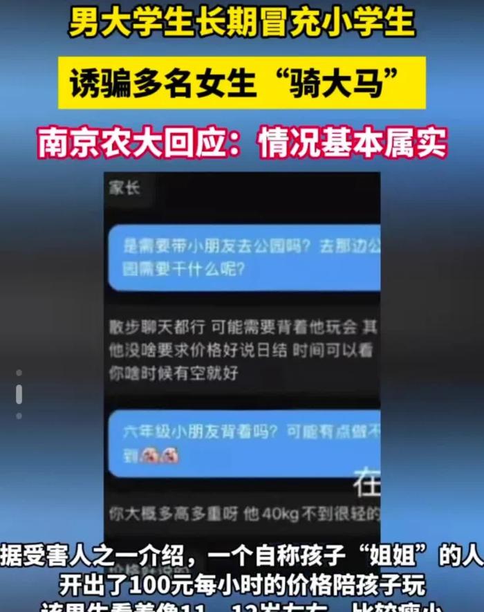 太奇葩了!江苏南京,一男大学生谎称自己是6年级小学生,以100元/小时的价格,雇佣女大学生陪自己玩,在过程中,他要求坐在女生脖子上,骑大马。一女生发现情况不对,把此事曝光,没想到接下来发生的事情,却让她傻眼了。 (案例来源:新京报 热榜) 小苏在网上看到一份兼职信息,工作内容是陪小学生玩耍,她觉得这份工作既轻松又能挣点生活费,就满怀期待地联系了对方。 对方告诉她主要任务是陪伴一个六年级的小朋友去公园玩玩,聊聊天,30元/小时,一周大概三次左右,时间随意。 小苏说自己可以考虑看看,可对方却又提出了一个让人匪夷所思的要求:可能需要背着小男生玩会。 “背着玩?”小苏一脸震惊的提出了自己的疑惑。 对方解释说:“就是背着他坐肩膀玩一会会就好。” 小苏有些不安,急忙询问了孩子的身体情况,并表示自己背一个男生有些吃力。 对方回答说孩子160cm、40公斤,很轻的,一般比他重的都没问题,几分钟就行。 小苏直接拒绝,说自己接受不了。 可对方还没有死心,依旧劝小苏试一试,并提出价格好说。 小苏依然觉得不妥,她直接拒绝了对方的要求,表示这样的工作内容超出了她的接受范围。 对方似乎并不放弃,一直在强调小朋友很轻。 小苏建议对方去体育学院找找,体育学院的人可能背得起小朋友。 对方却劝小苏先试试,小苏问对方100元一个小时,ok吗? 对方说先试一下看看行不行,反正是按照时间算的。 小苏思来想去,还是觉得男生比较适合这份工作,她跟对方说自己可以推荐一个男生过来。 可对方坚持只要女生,双方并未谈拢。 之后,小苏越想越不对劲,把两人的聊天记录发在网上,瞬间引发其他女生的爆料。 2023年11月,一个叫小影的女孩和同学接了这种单。 她们去到约定地点,见到了一名11、12岁的瘦小男性,当时对方穿着很像小学生,言行举止也很幼稚。 对方提出要坐到小影和同学的肩膀上,虽然非常抗拒,但是小影还是让对方试了一下,当时她和同学轮流试着背了两下。 半个小时后两人离开,对方倒是没说什么。 回去的路上,小影感觉自己的脖子被性侵,很难受。 男子的事情被曝光,小影才知道自己受骗了。 随着不同女生的爆料,这名男子的真实身份也浮出水面。 原来跟小苏聊天的朱某其实是一名男大学生,他经常冒充6年级小学生家长或者姐姐,诱骗女大学生背自己玩。 因为朱某身材矮小,许多人都没有意识到,那名小学生竟然就是朱某冒充的。 早就2021年,就有人曝光了朱某的这一行为。 受害女生们意识到:朱某的“骑大马”是一种特殊的癖好。 此事引发热议,男子所在的大学回应:情况基本属实,目前学院仍在核实中,未来将依规依据作出合理处罚。 有人说,朱某的行为违背了公序良俗,也构成了对他人的猥亵行为。 猥亵指性交以外的淫秽性的下流行为,具体表现为行为人为了追求性的刺激,以满足其变态性欲,对他人的身体进行抠摸、搂抱、鸡奸等等。 朱某编造身份,冒充小学生,骑在女生脖子上玩赏,在女生不知情的情况下,与女生进行身体接触。 这个行为或已涉嫌违法。 《治安管理处罚法》第四十四条规定:猥亵他人或在公共场所故意裸露身体,情节恶劣的,可处五日以上十日以下拘留。 如果女生们发现情况不对,当即报警,朱某或被治安处罚。 《民法典》第一千零一十条规定:违背他人意愿,以言语、文字、图像、肢体行为等方式对他人实施性骚扰的,受害人有权依法请求行为人承担民事责任。 女生们可以要求朱某给予相应的赔偿,并赔礼道歉。 朱某的行为更像是一种心理疾病,除了相应的惩罚外,还应当进行心理干预,给予相应的正确引导。 对于此事,你有什么样的看法?律觀法说 ,从法律角度看世界。 文中人物均为化名。 男生涉嫌违法吗