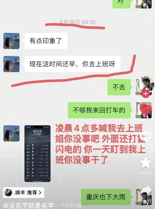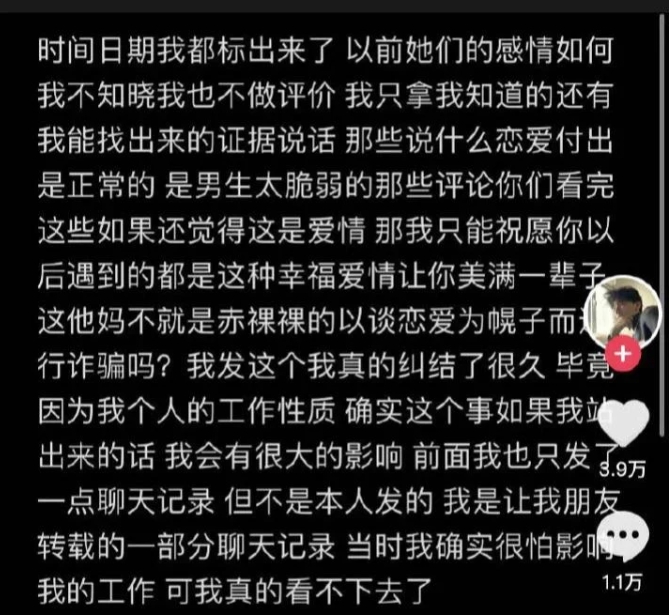 谭竹那个t的朋友都出来锤她了,还有什么可说的。谭要钱和收钱的记录一个不发,说那么多道貌岸然废话,最后花店的6万6还秒收款[泪奔]一边在这跟闺蜜说好可怕,然而男方那边发消息,女的不回,男的转账,女的收款但仍不回消息 她自己的钱她自己存的定期,花的全是男生的,存的也是男生的工资,各种节日要钱,平日要手链包黄金,还骗男生5月结婚存钱[赞]谁家好人恋爱两年就见面两次啊