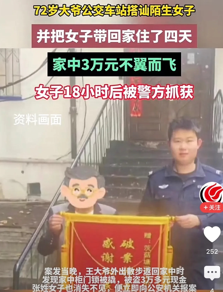湖南株洲,一72岁大爷等公交车时,见到一女子也在等待公交车,于是,大爷上去攀谈了几句,随后将女子带回了家中住了4天,结果,女子却突然不辞而别,大爷寻找无果后,直接选择了报警,女子结果被刑事拘留了。