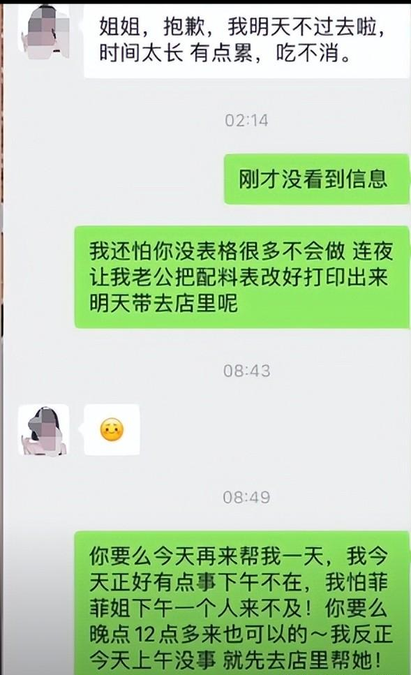 而这名新员工可能也担心自己“暴露”了,就对老板提出了辞职,但是老板以“已经更新好配方,请求她再留一天帮忙”挽留了这名新员工。