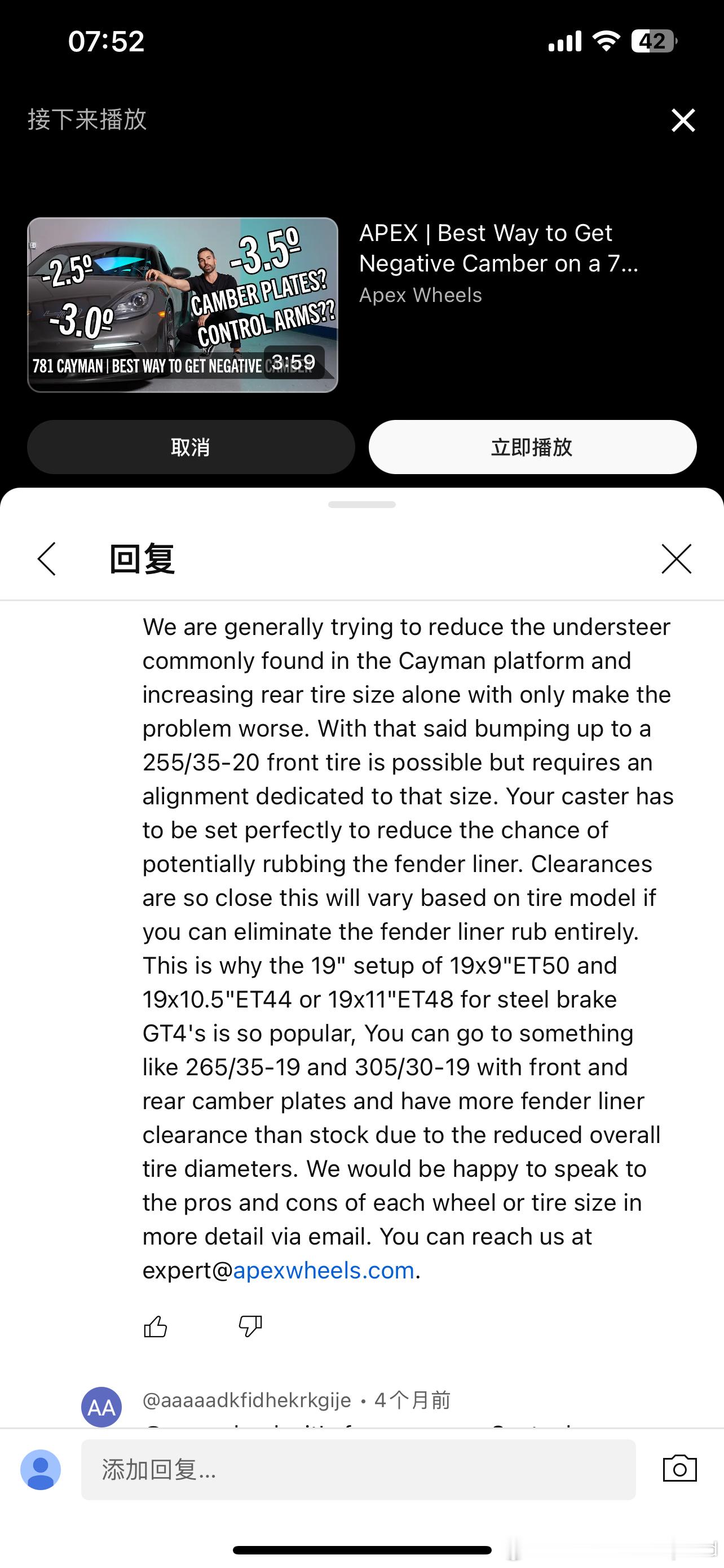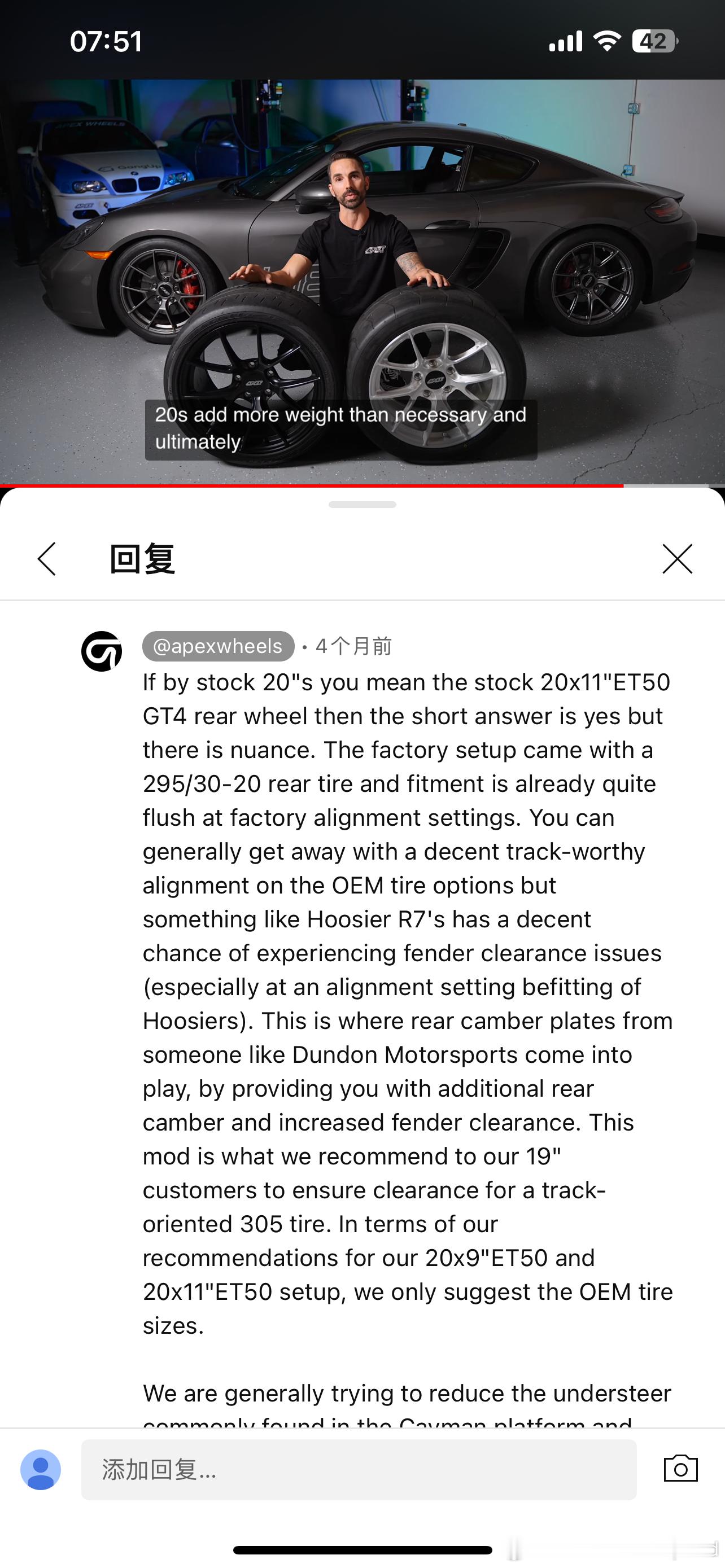 轮毂和轮胎的选择也很屮,全网大牌找不到18寸,Apex官方推荐19寸,因为20寸即便调了倾角还是有可能蹭叶子板,但查了下国内19寸的选择… A052、RE71RS、Eagle F1 3R等热门半热熔都没尺寸,米胖子Cup2R前轮19的只有235 35 R19,后轮295 30 R19还没来。18更是没有什么选择,除了光头,F430上已经吐过一次血。