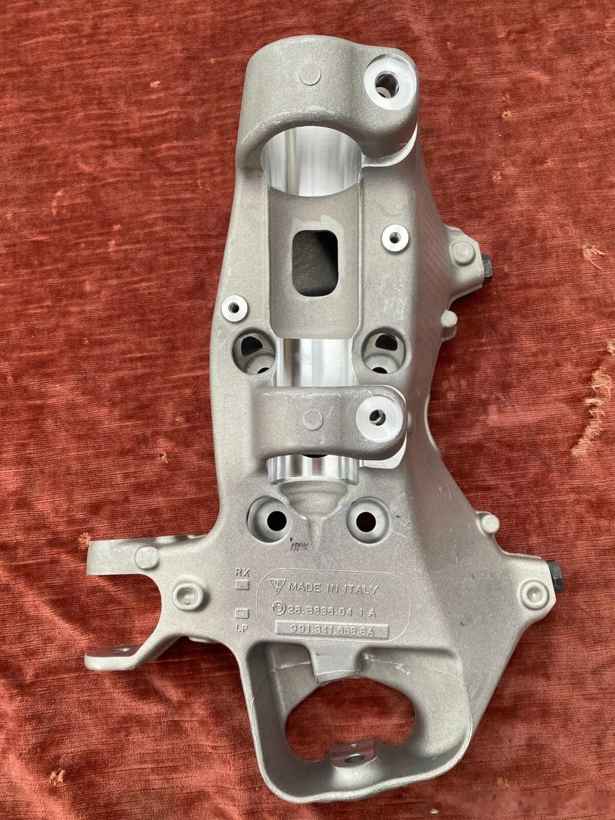 赛版叫ZR68/69,带“PORSCHE” logo。以前991 Cup赛车和现在982 GT4 RS CS赛车使用的卡钳,这个非常宽,只能换轮毂,可以吃28mm的PFC 11赛皮,而且想直装的话需要更换CS前轮羊角(图6),原厂4RS前羊角使用光头胎有风险,CS和991 Cup是同款羊角,多一根加强筋。一本红颜色的本子HRUI大佬就已经做过测试,他换了这个羊角+赛版PFC,而且还改了五孔,只是当时为了省米用了祖国盘,结果发现是辣鸡,又订了原装盘+合头。(姚帝绿毛龟上早年就测试过,PFC赛皮几圈干裂了祖国竞技盘,目前宝马M6上他已经把划线都磨没了)