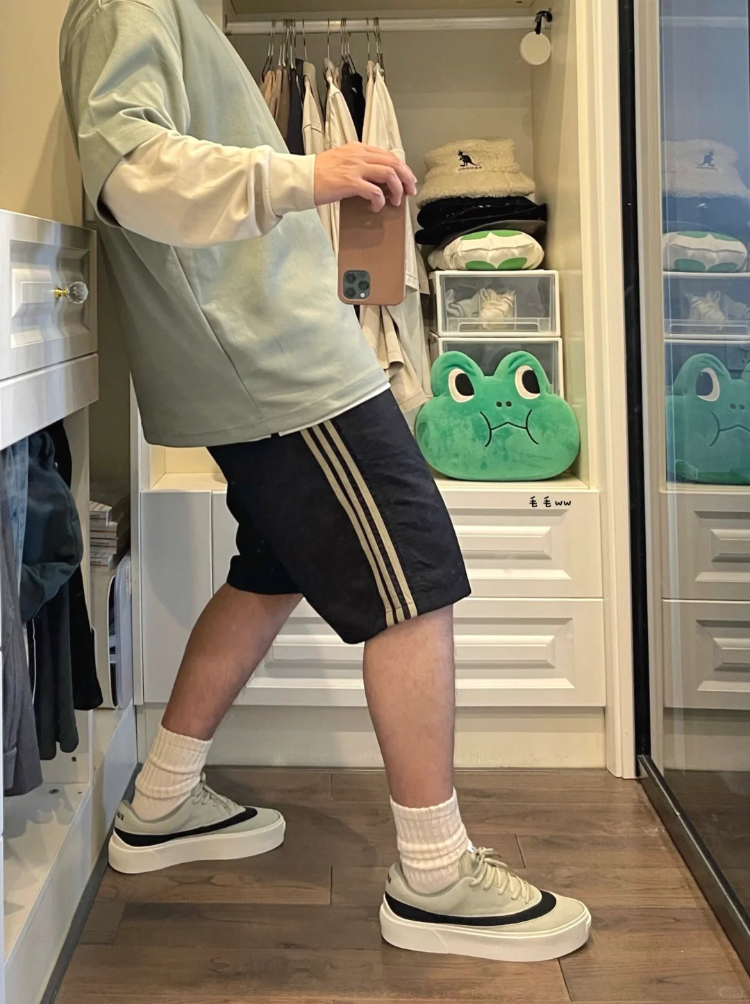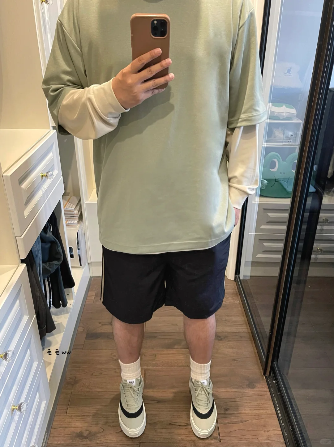 -U家本季两抹绿色都很满意,之前青绿偏棕,这次翠绿偏灰,这是正儿八经的绿色 . -低饱和度色系,淡淡地很好搭配,轻便的短裤加帆布鞋,单穿叠穿&长袜短袜都没问题 . —————— . ✏️本人178cm75kg 球鞋尺码265mm(正常EU42) . 💭以上均为我个人观点,不喜勿喷,欢迎讨论。