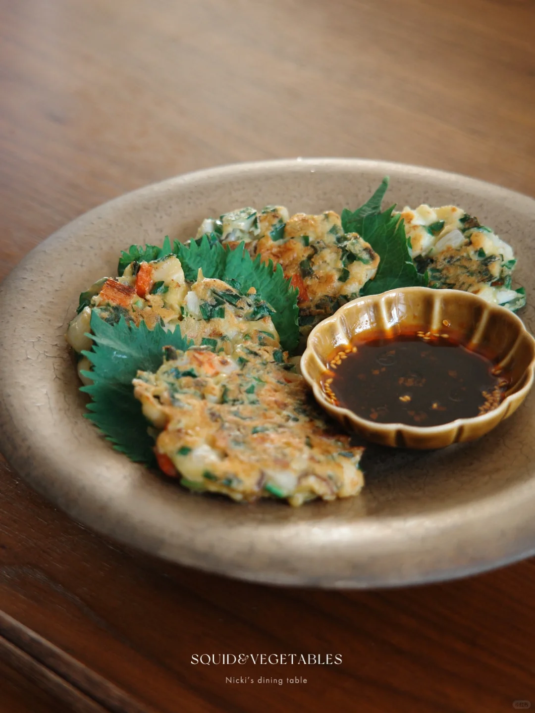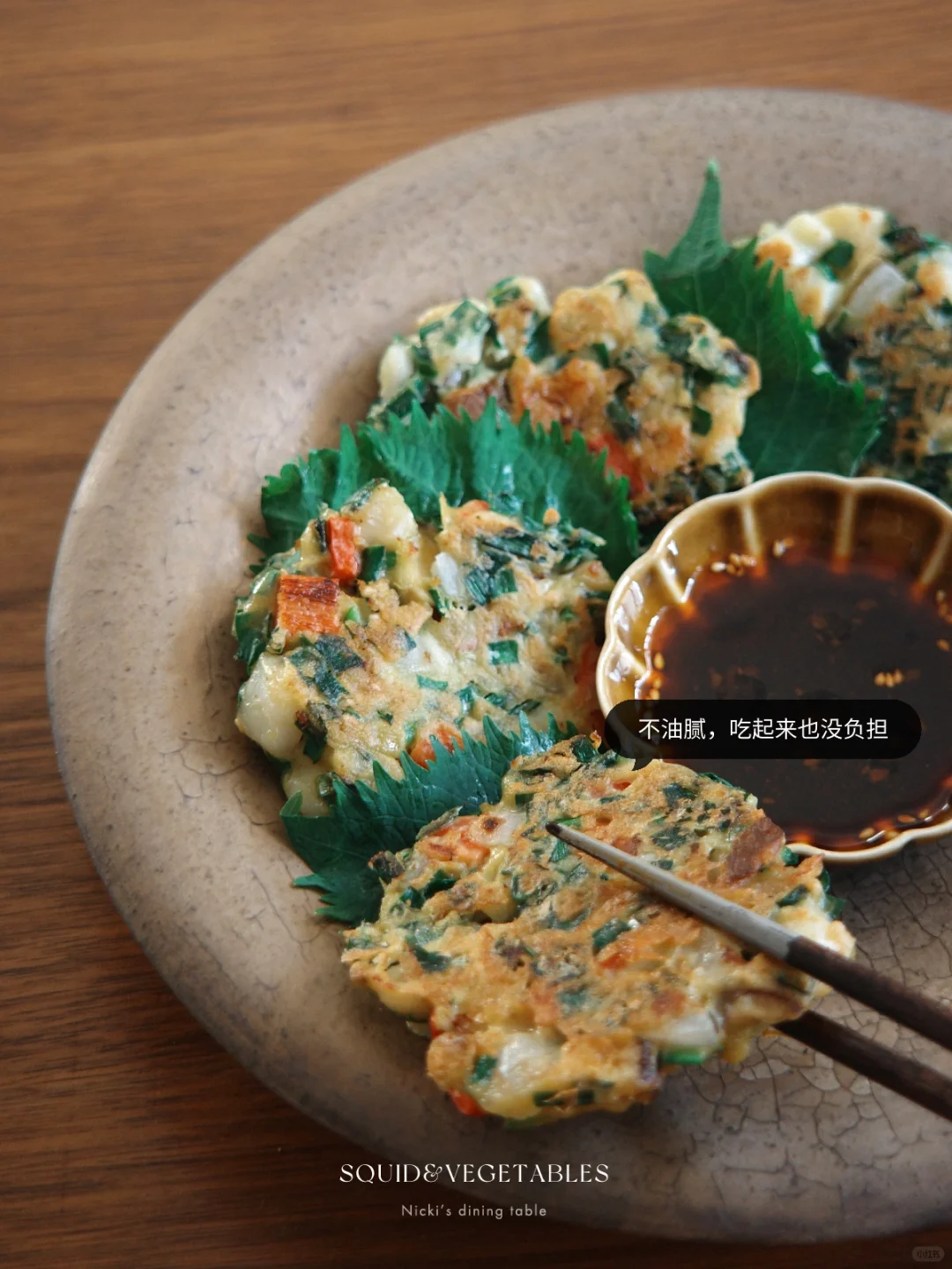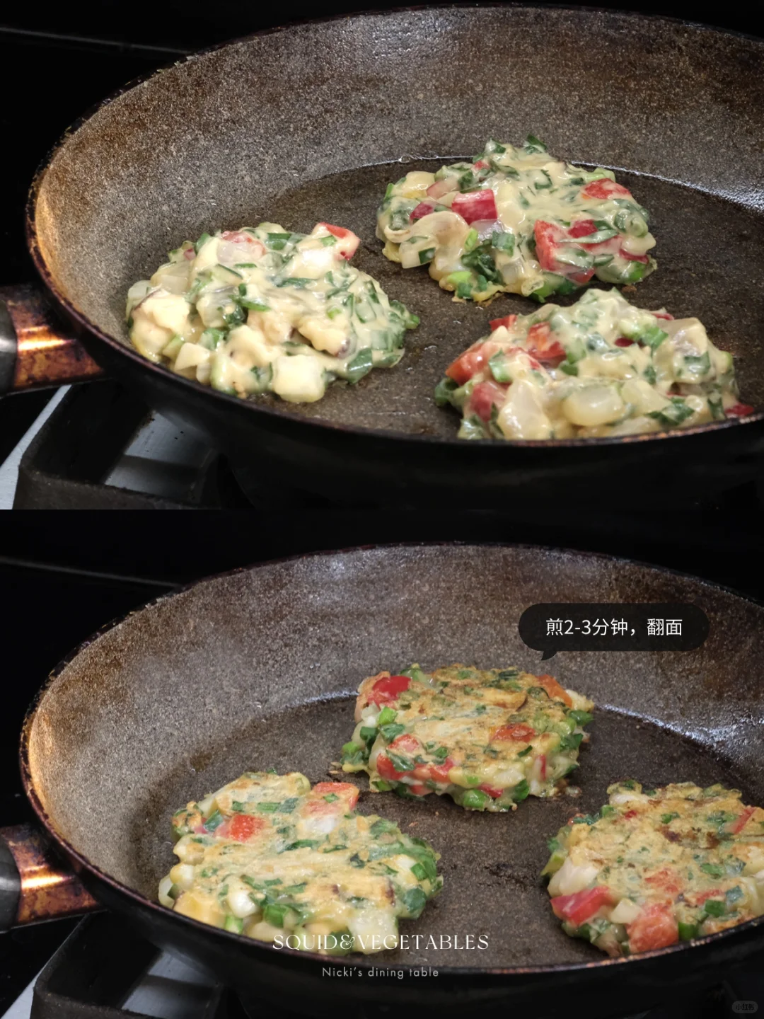 •平底锅中倒油,中小火加热,用勺子将拌匀的食材挖入锅中,调整成圆形,可以稍稍压一下,煎2-3分钟,翻面,同样再煎2-3分钟即可。。