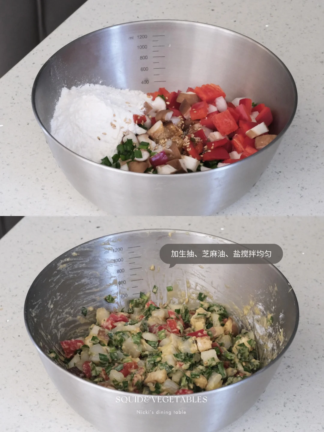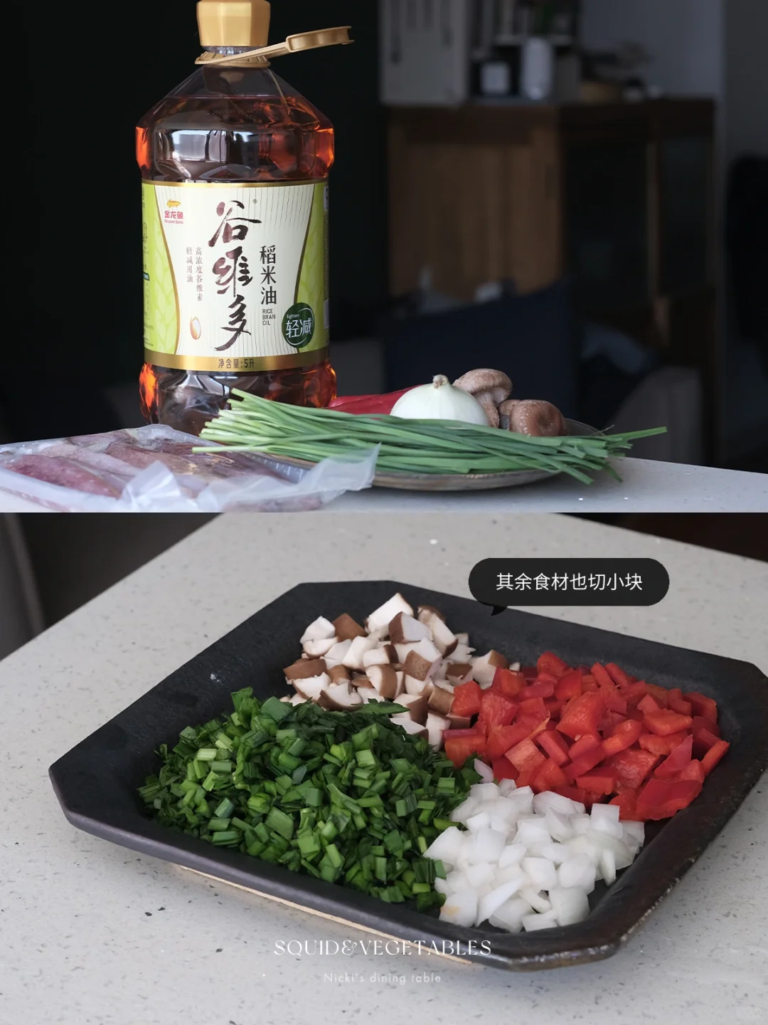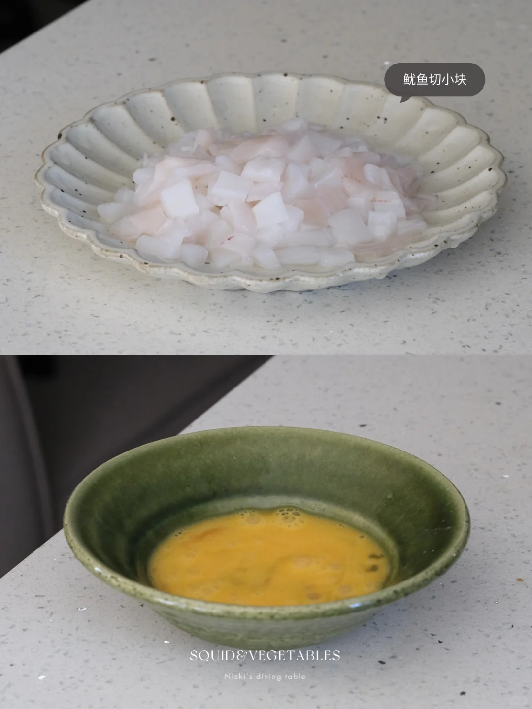 🥬食材:鱿鱼、红椒、白洋葱、香菇、韭菜、面粉、鸡蛋