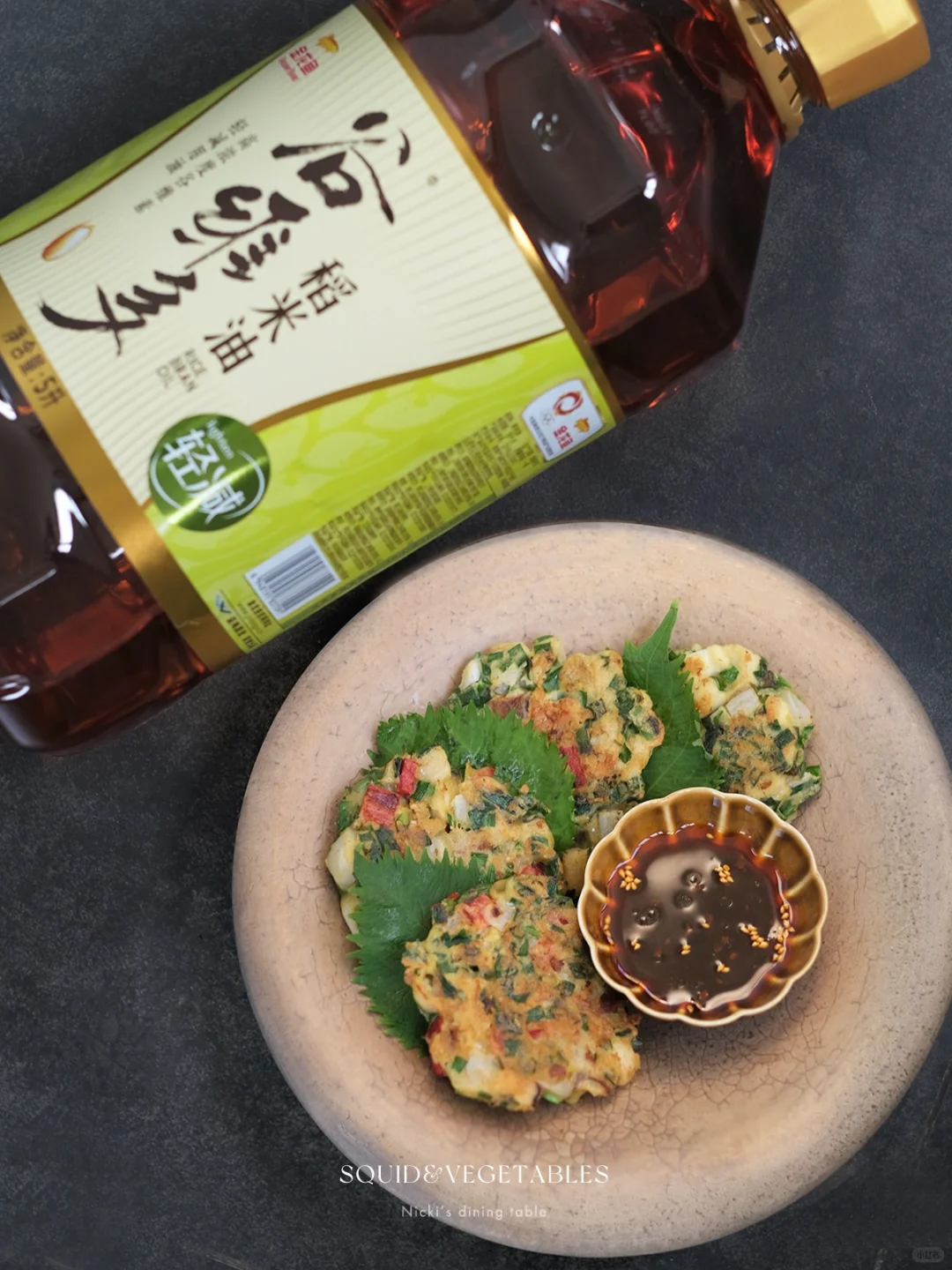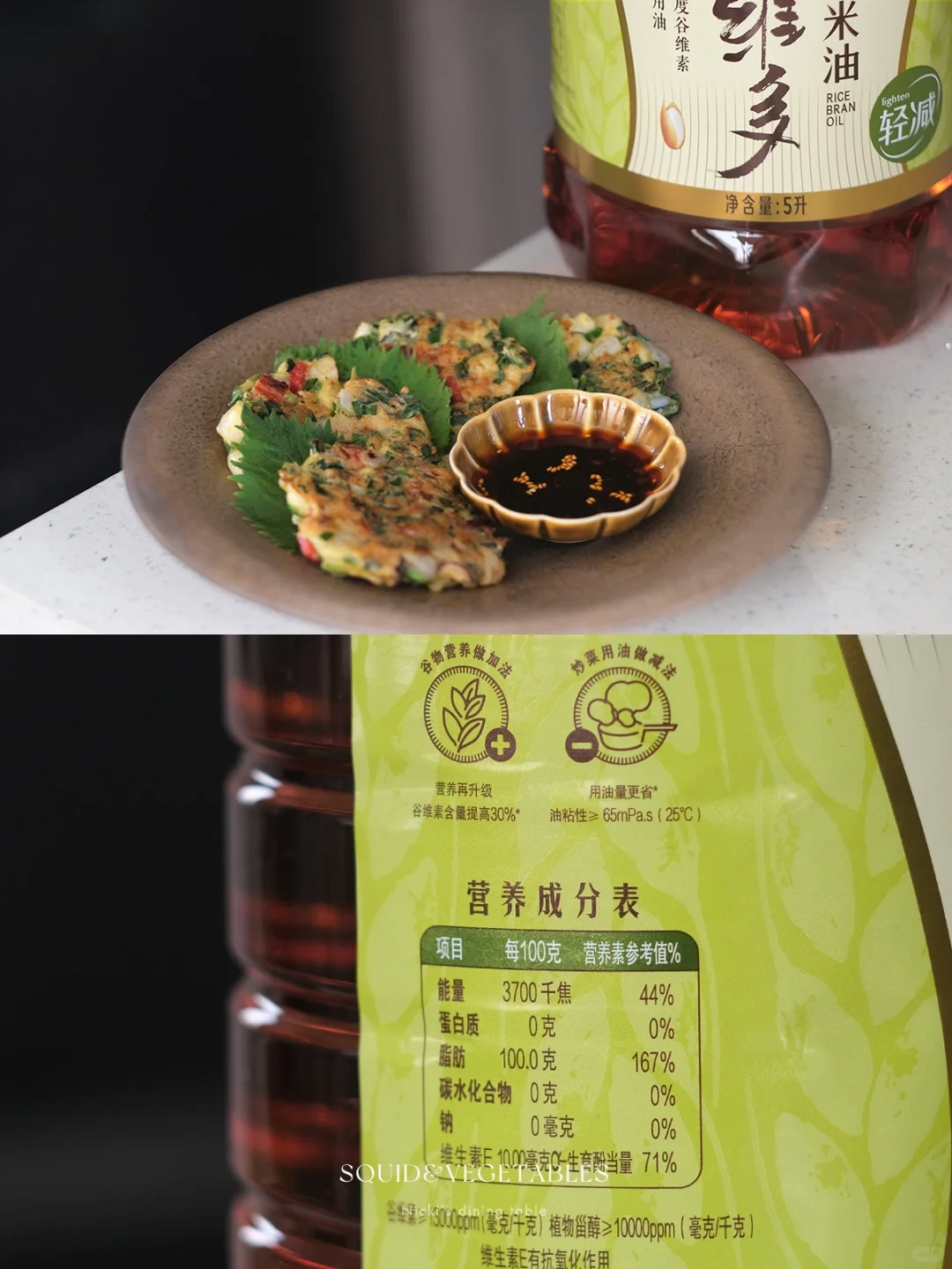 煎饼不做面糊,用小限度的粉和打散的鸡蛋液裹在食材上,搭配谷维多轻减稻米油下锅煎,就能做出轻盈的口感,还有股淡淡的稻米香,吃起来不会有负担。鱿鱼与香菇、彩椒、洋葱融为一体,不油腻,忍不住一口接着一口。