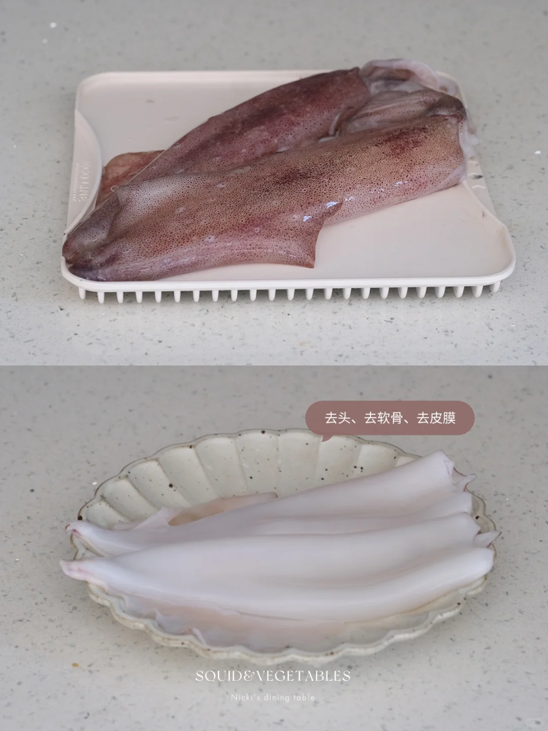 •鱿鱼去头、去软骨、去皮膜,切小块。