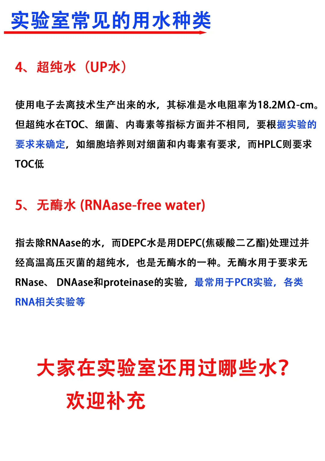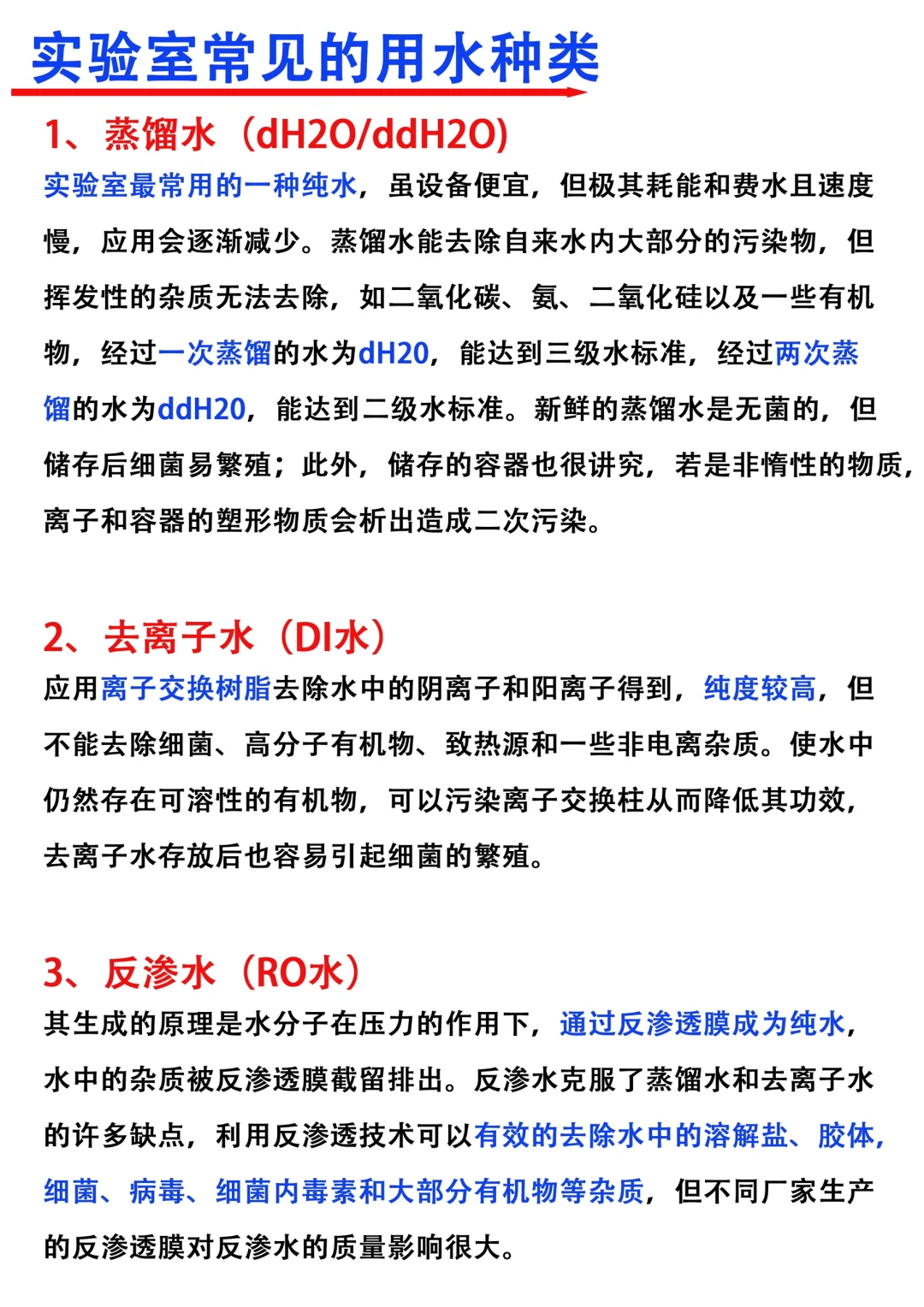 关于实验室用水,科研小伙伴们知道多少呢? [同款R]实验室用水种类这么多,你真的用对了吗? [种草R]本期跟大家分享几种实验室常见的用水种类 1⃣️蒸馏水 2⃣️去离子水 3⃣️反渗透水 4⃣️超纯水 5⃣️无酶水 满满的干货,欢迎大家👍收藏,一起讨论交流呀!