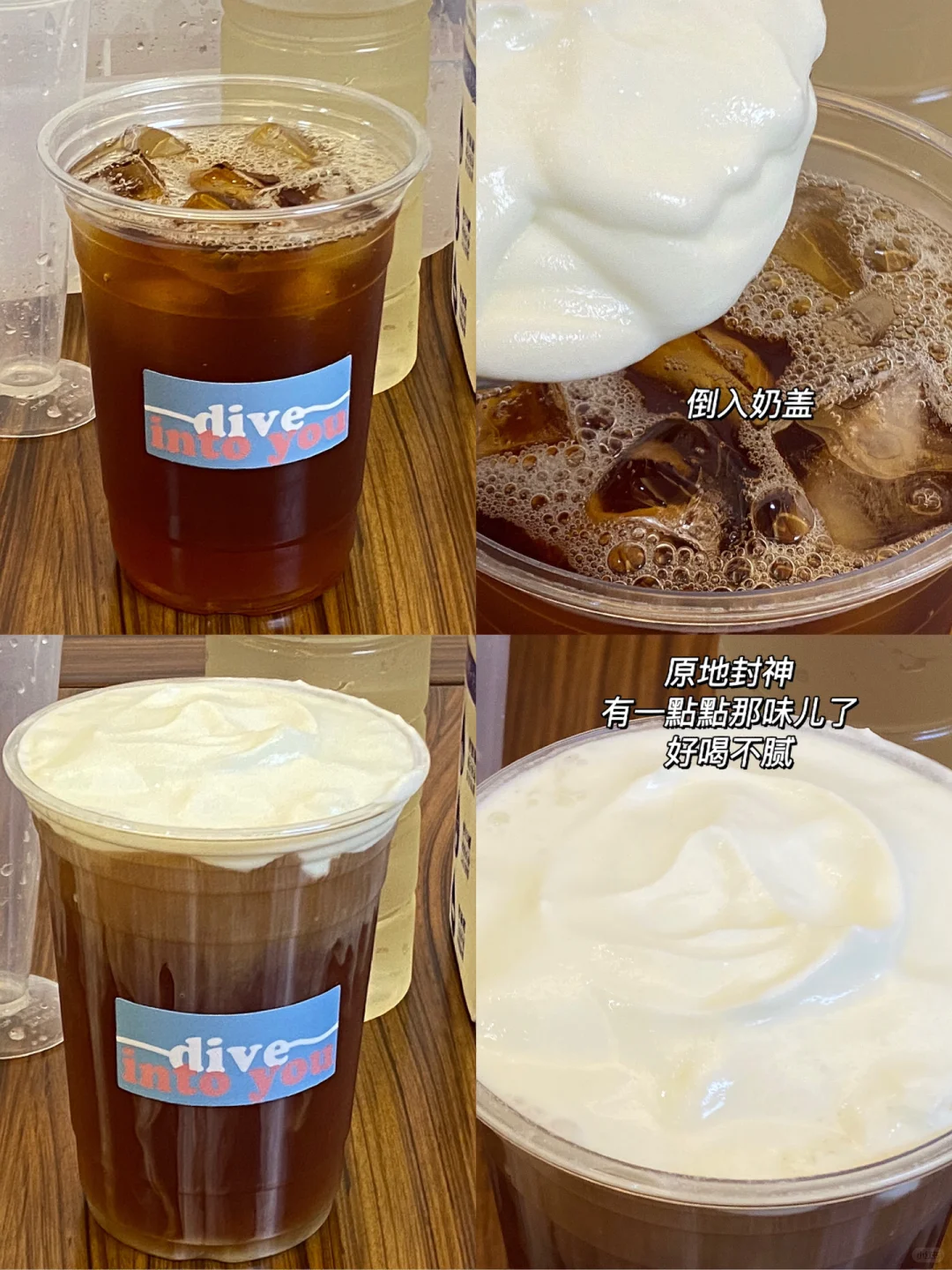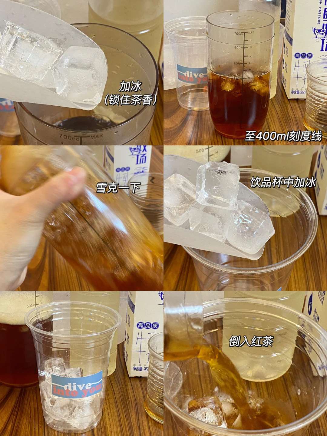 3.饮品杯中加冰,倒入红茶,倒入奶盖,完成✅