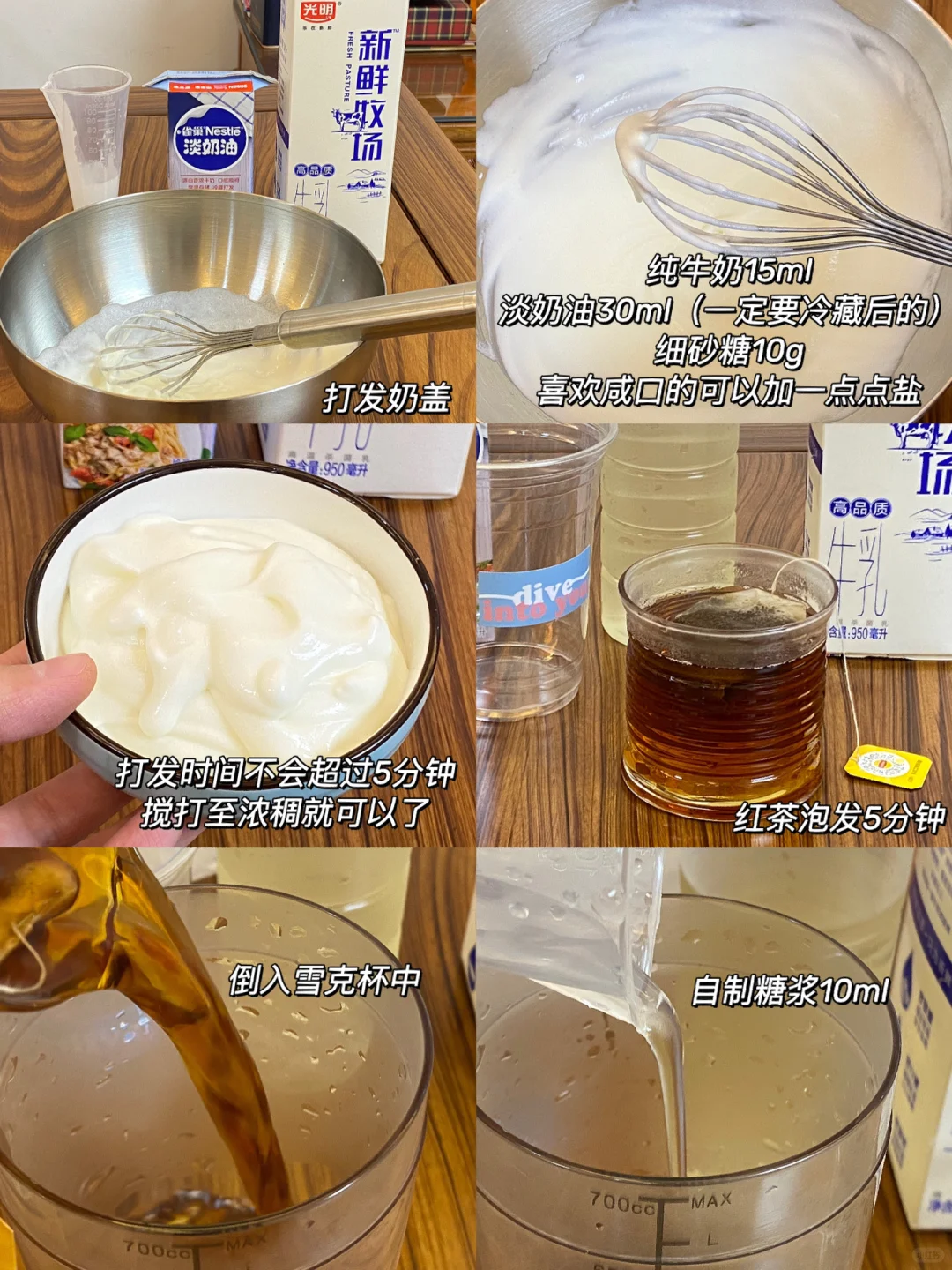🌼奶盖:纯牛奶15ml,淡奶油30ml(牛奶、淡奶油都一定要冷藏12小时以上,才好打发哦)细砂糖10g(喜欢咸口的可以加一点点盐)手动顺时针搅打(搅打的容器一定要无水无油哦)不会超过5分钟,做出来是一人份的。