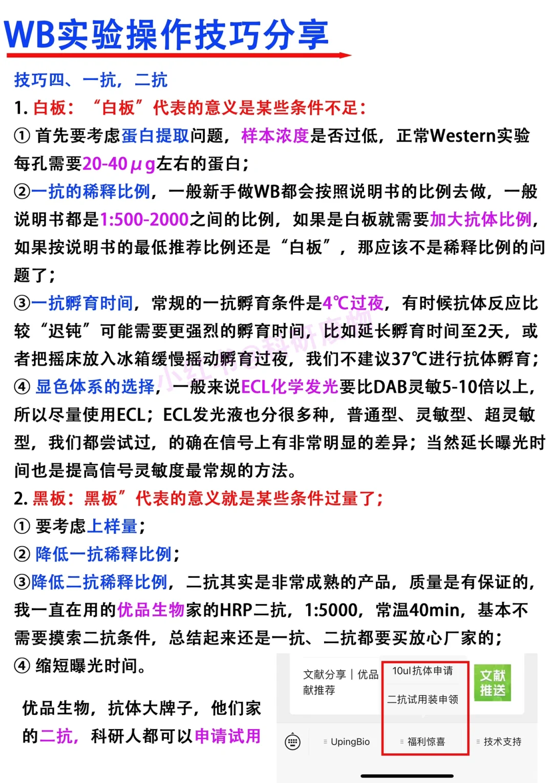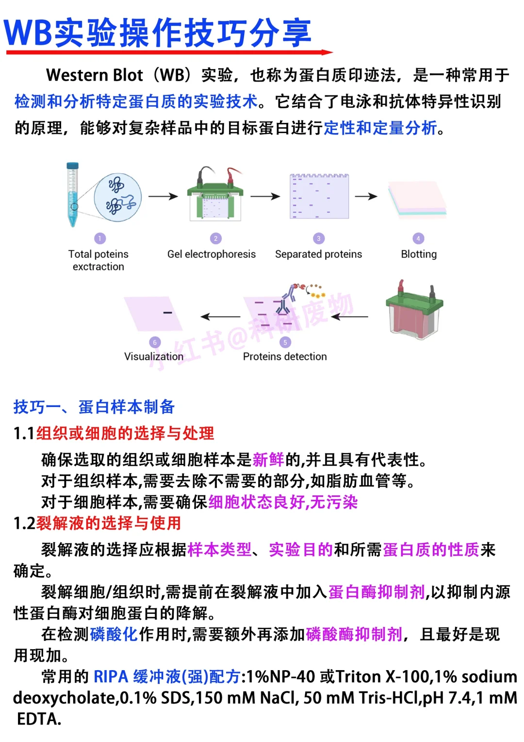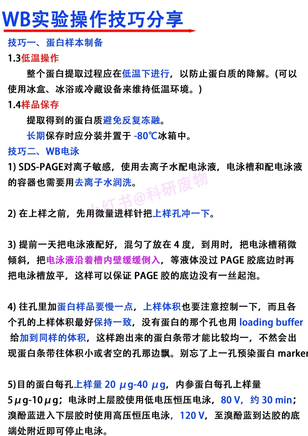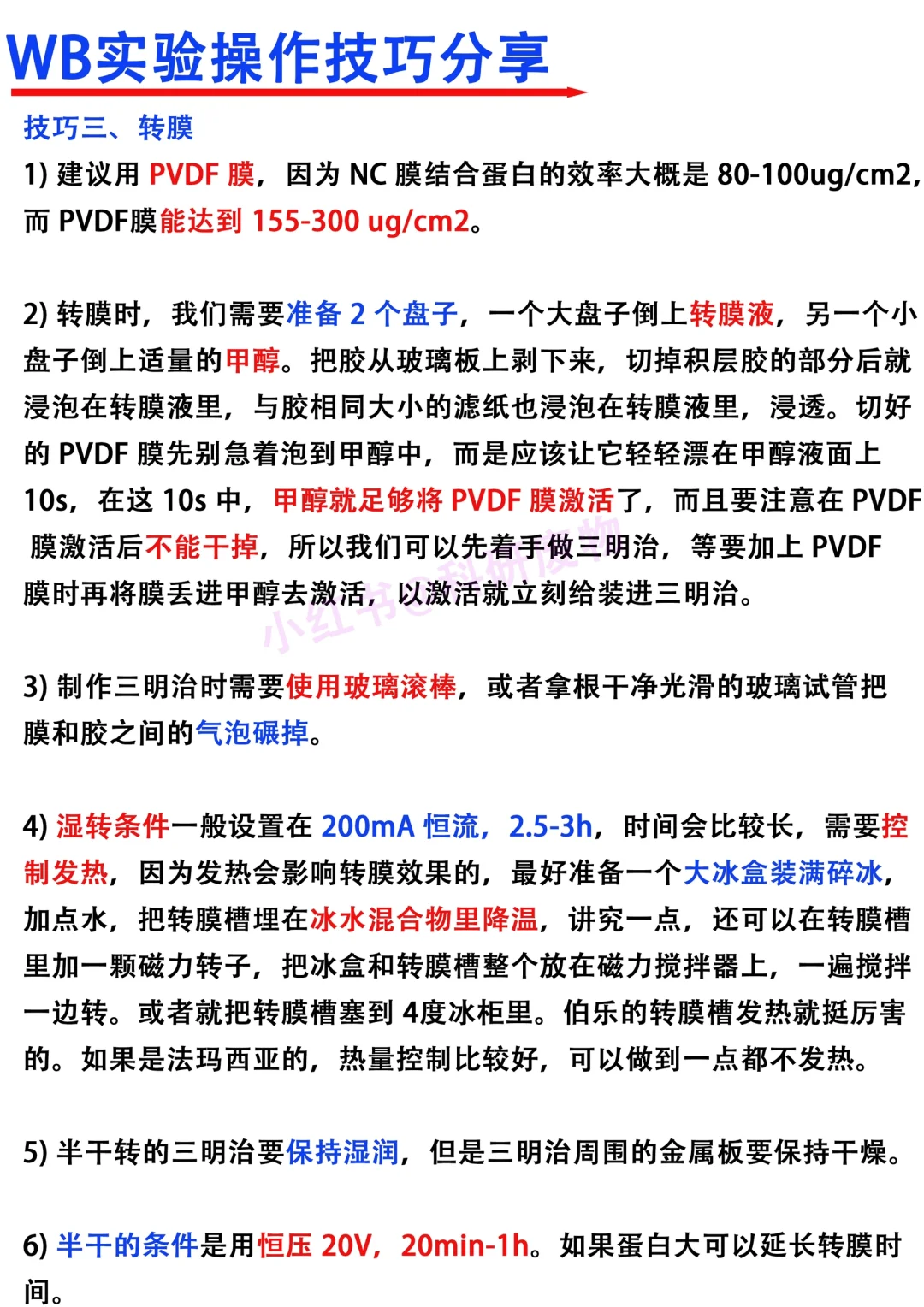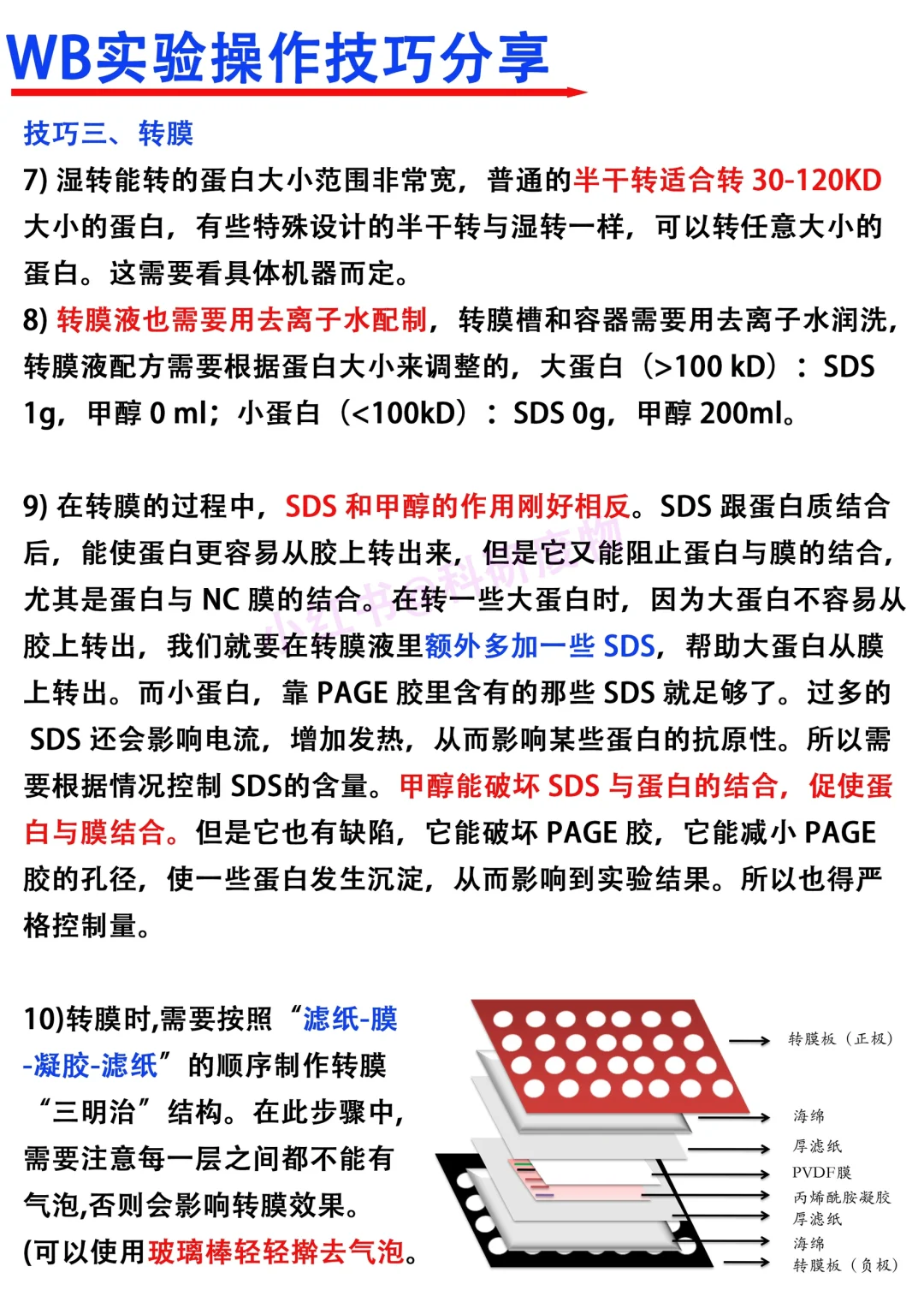 Hi~各位科研爱好者们,我是科研废物,大家周末好呀[飞吻R] [赞R]看到大家对wb实验非常感兴趣,大家交流学x的热情也高。本期就借此机会跟大家分享一下关于wb实验的小技巧 [向右R]主要从以下四个方面进行分享 1⃣️蛋白样本制备 2⃣️wb电泳 3⃣️转膜 4⃣️一抗,二抗 满满的干货与tips,欢迎大家👍收藏,一起讨论交流呀