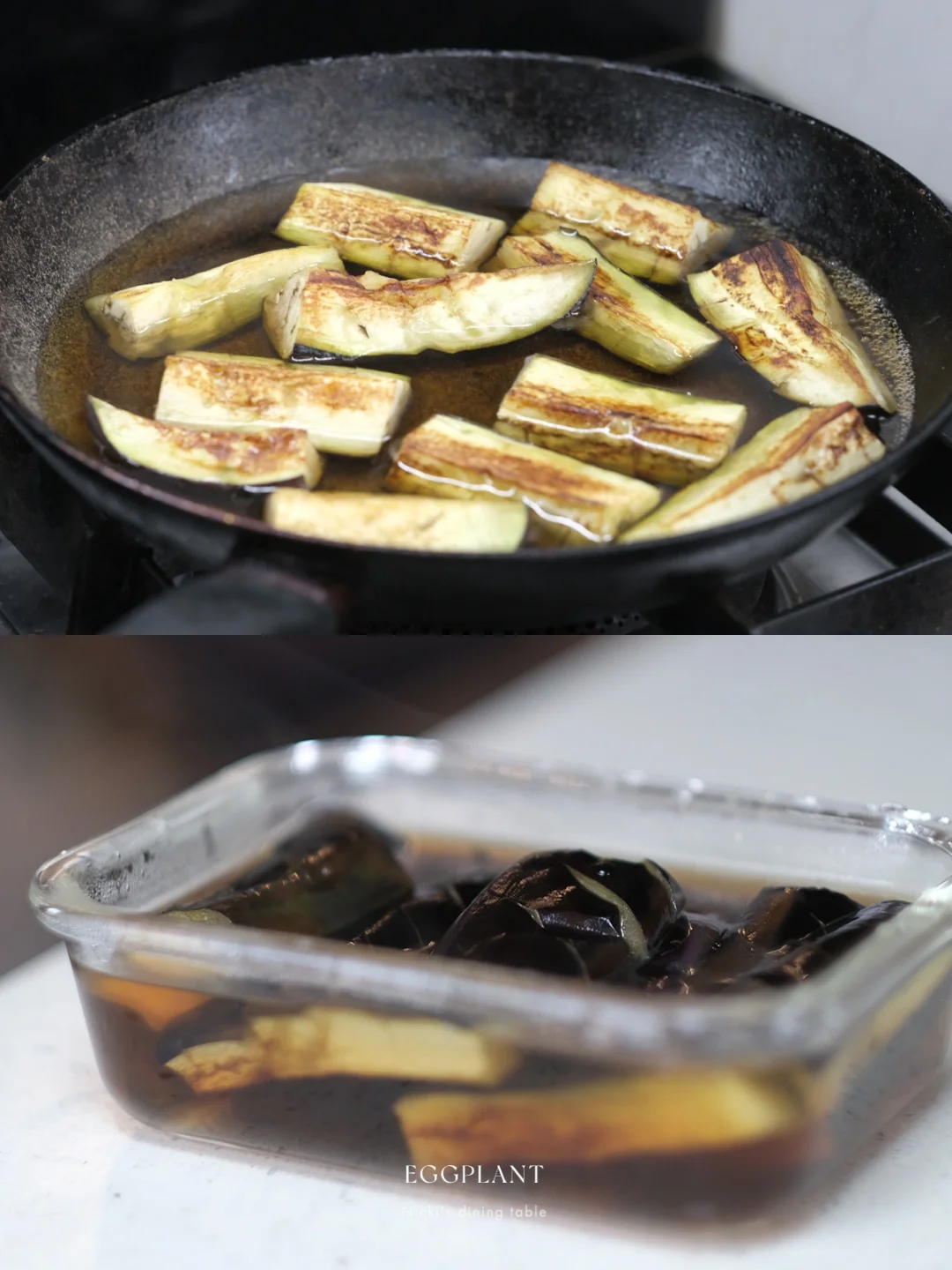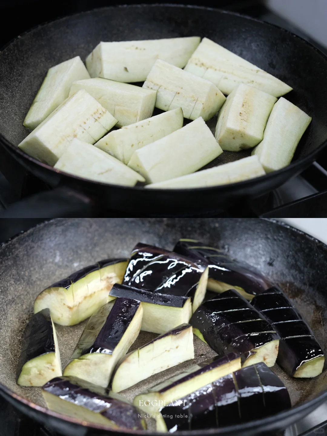 🔺煎茄子一定不要着急,小火慢慢煎,油也不需要很多,再多的油,它都能吸饱。