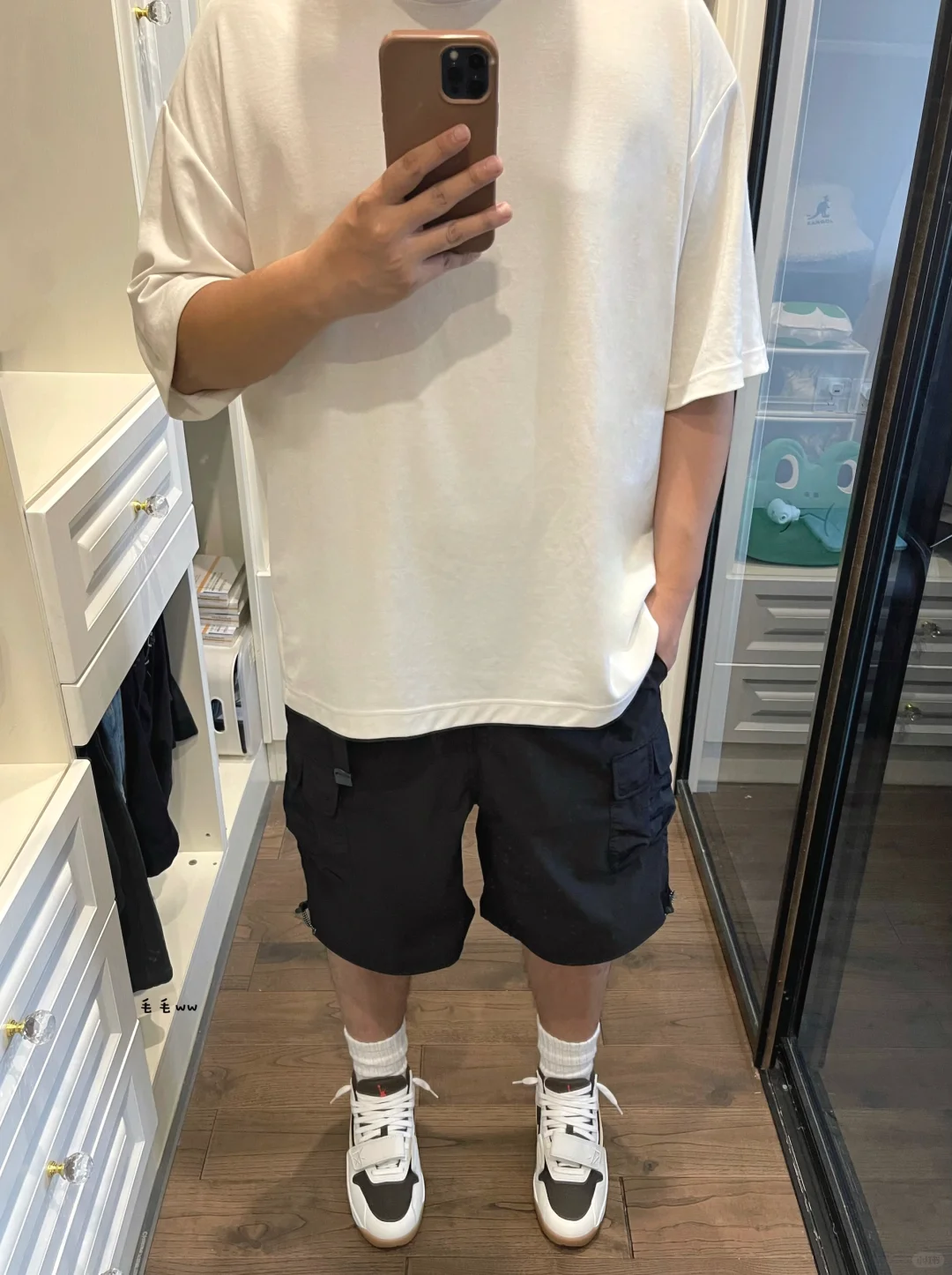 -从五分裤穿到较短的美式,再到今年,七分长度的短裤终于又流行回来了 . -简洁黑白色系,夏季同样有效,白Tee黑短裤&白袜黑白鞋,公式直接照搬 . —————— . ✏️本人178cm75kg 球鞋尺码265mm(正常EU42) . 💭以上均为我个人观点,不喜勿喷,欢迎讨论。