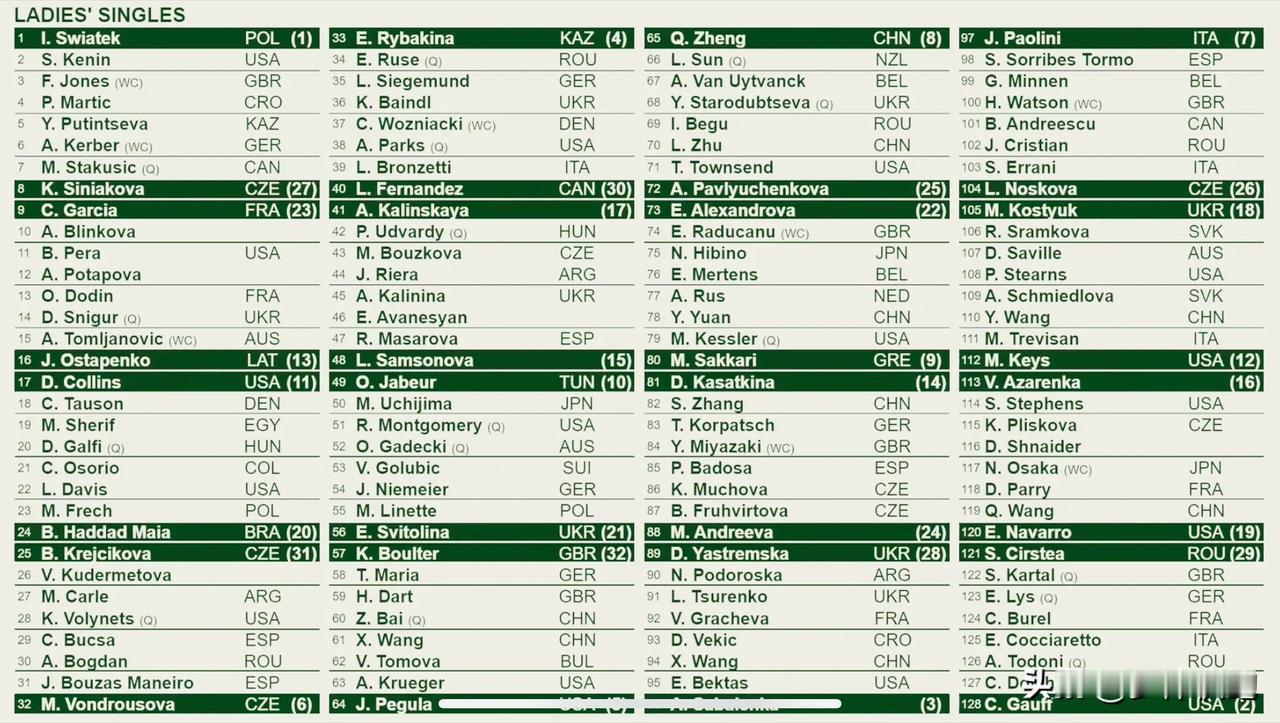 温网女单签表出炉,中国金花9人出战,🇨🇳8号种子郑钦文签表最好,大概率晋级八强;用保护排名参赛的张帅和王蔷第一轮就遭遇恶战,且看且珍惜! 温网首轮对手: 郑钦文VS 🇦🇺孙璐璐 袁悦 vs 🇳🇱鲁斯 王欣瑜VS 🇧🇬托莫娃 王曦雨 VS 🇭🇷维基奇 朱琳 VS 🇷🇴贝古 王雅繁 VS 🇸🇰施米德洛娃 张帅VS 🇷🇺卡萨金娜【14】 白卓璇VS 🇬🇧达特 王蔷 VS 🇺🇸纳瓦罗【19】 #温网# #宝藏兴趣攻略# #网球#