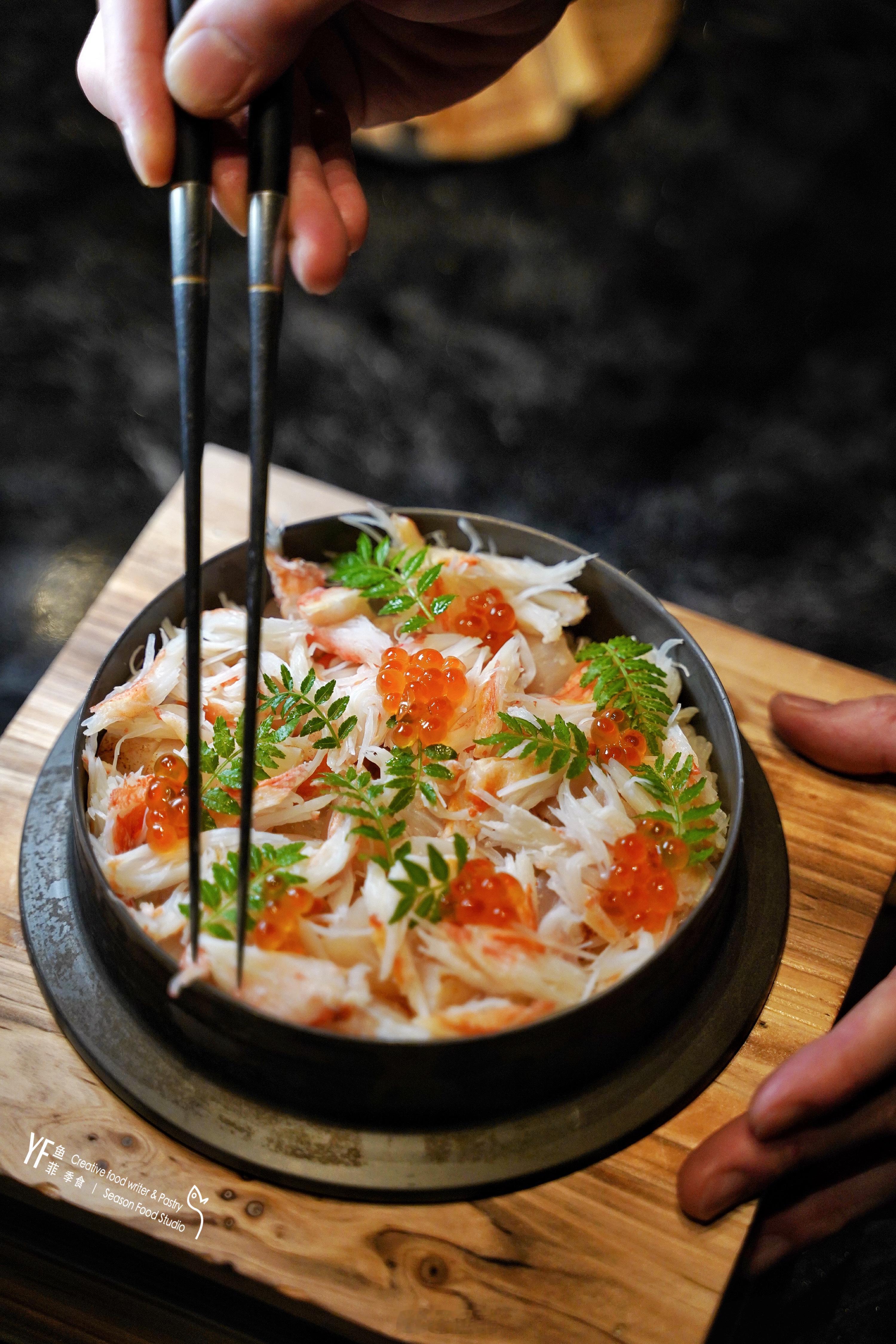 🦀釜饭也是我偏爱的料理之一,师傅们先用蟹肉与高汤炊饭,帆立贝用酒麴腌渍后再慢煮引鲜,最后在铁板上煎香入釜饭里蒸焗。帆立贝、雪蟹相互促鲜,鲜味更甚,入馔釜饭的三文鱼籽,清新爆破的口感,亦为釜饭多添了一丝丰富口感。