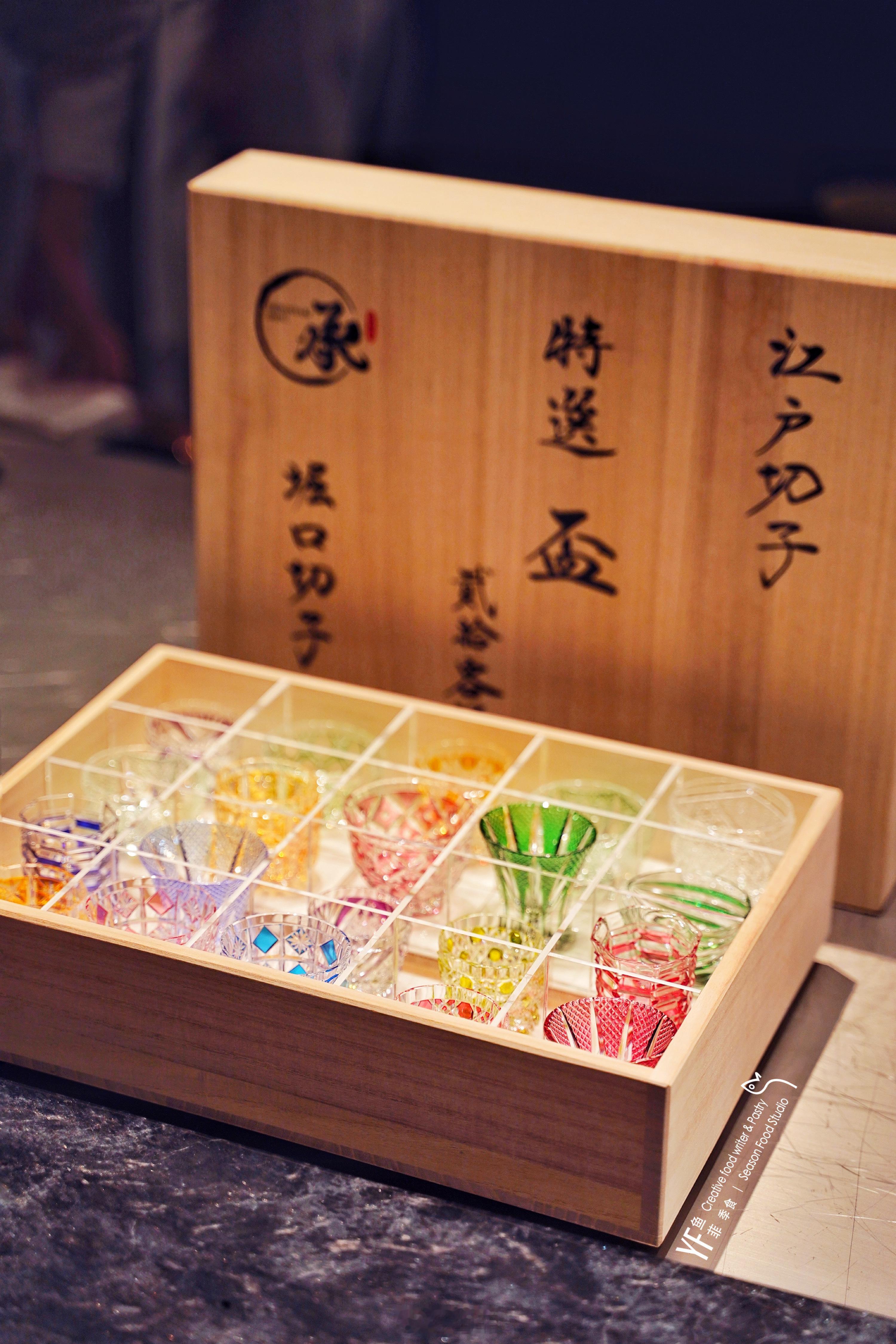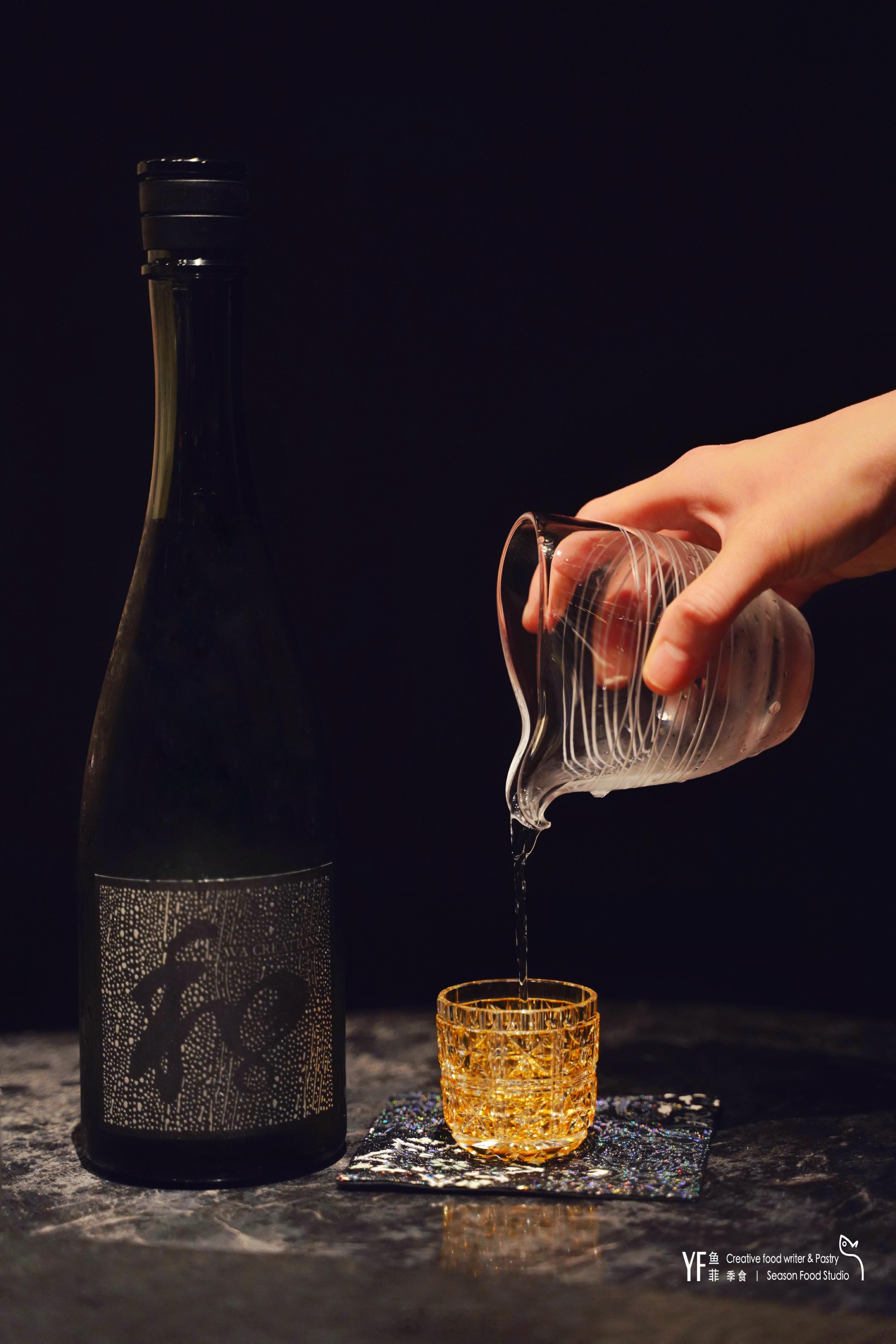 🍶配酒亦讲究,挑选的清酒杯,由堀口切子大师为餐厅量身定制,20款各具含义。那盏橙金色独入我眼,寓意生命力很旺盛的植物。大米抛光率为38%的和银纯米大吟酿入杯,两层玻璃切割的杯壁,在酒韵光影的映衬下,似一口酒泉,清爽甘甜,在每一道食物之后小酌,恰到好处的增鲜解腻。