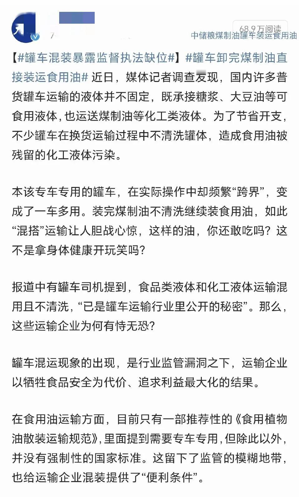 一,这个事儿在7月2日就被爆出来了,为何等到7月7日和8日才被炒上热搜?按道理,一条爆炸性的消息应该当天就上热搜啊! 二,某些博主对小日子排放核污水的危害闭口不谈,甚至还试图淡化影响把核污水改成核废水。可这些博主为何对油车装食用油这个还没有完全实锤的事儿却表现的非常义愤填膺,大有为民请命的架势?你们说,这奇怪不奇怪。 三,某报在爆料此消息的时候,为何只提中储粮,但是却对运油的私人公司只字未提,按理说运油的私人公司问题才是最大的啊?另外,对这些油流向那些销售端也没有跟踪报道?所以我感觉这爆料也不是很全面啊! 四,其他媒体在跟进报道的时候,只是关注油车在换油之前有没有清洗罐体?但是本人不才,刚好读过《食用植物油散装运输规范》,里面有这么一句话,运输食用油应使用专用容器,不得混用。所以我感觉,一些媒体在跟进报道的时候压根就没有做好功课。 五,了解近期国际局势都清楚,世界各地的战火已经影响到了全球粮食产量,一些国家也慢慢的出现了粮荒,所以在这个时候针对中储粮是什么意思呢?我想,有些不需要我多说你们也应该理解这是什么意思了吧? 六,为何这个事儿刚爆出了,还没有完全实锤,具体的原因以及一些细节也还没有查清楚,就有人出来大喊,让外资进入粮食领域?我在想,难道外资进来以后会为了我们的健康着想? 七,我看到一些理性思考的网友也提出要追查运油公司以及销售端,结果却被说成是给中储粮洗地。我在想,难道不应该追查运油公司以及销售端吗?毕竟这两个的责任都比中储粮大。 八,当年为了对抗国际市场上的四大粮商,我们成立了中储粮,而且取得了不错的成绩,所以这件事的背后有没有国际四大粮商的参与呢?我觉得可以调查一下。 九,国外的资本一直都想控制我们的饭碗,为此他们会不惜一切手段,包括栽赃、陷害,以及扰乱视听,甚至还会通过商业手段打压我们的粮食企业。而我们要记住两句话,一句是,手里有粮,心里不慌。还有一句则是,守护好我们自己饭碗。
