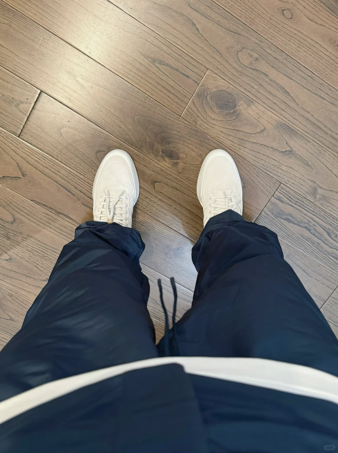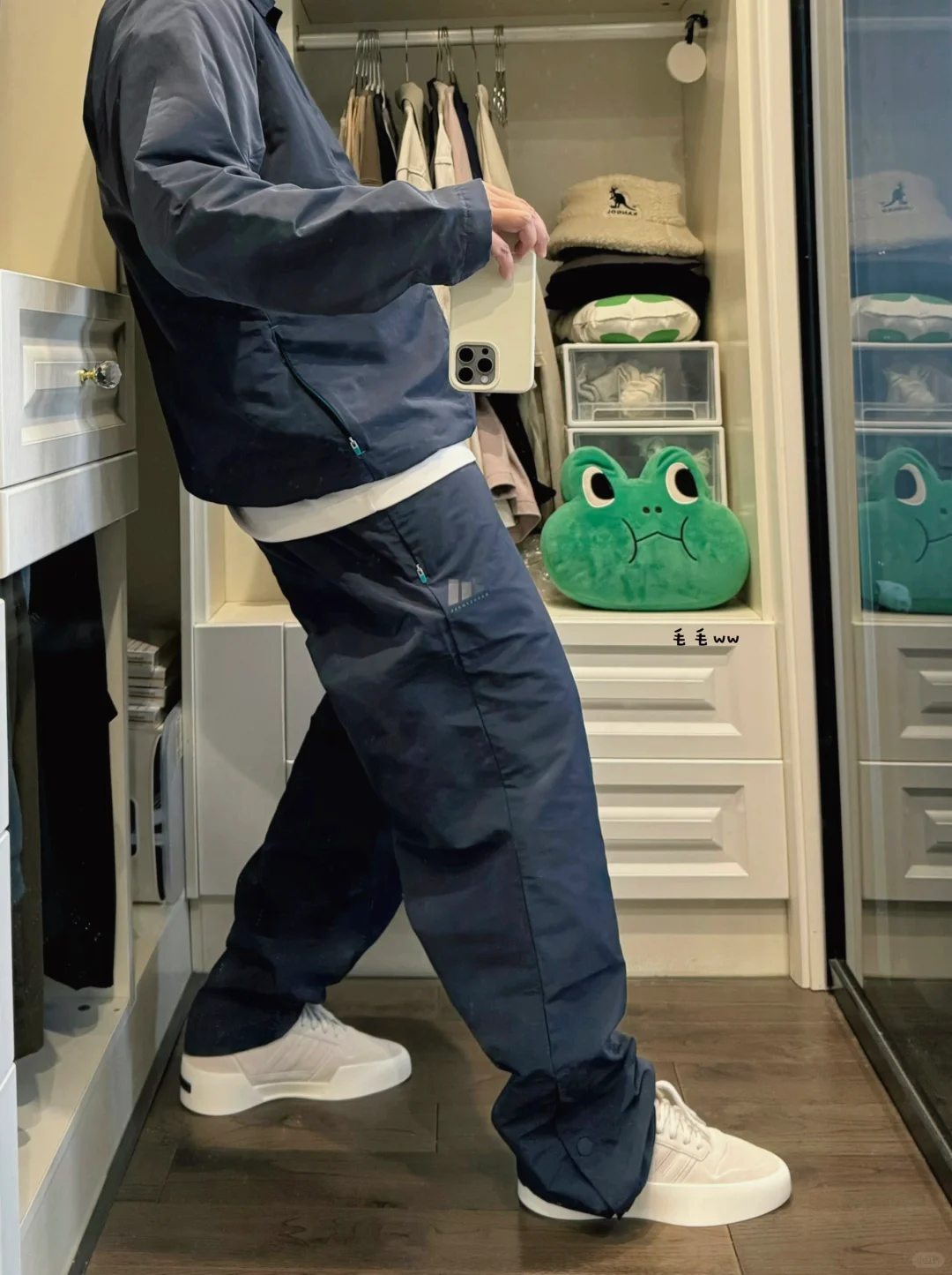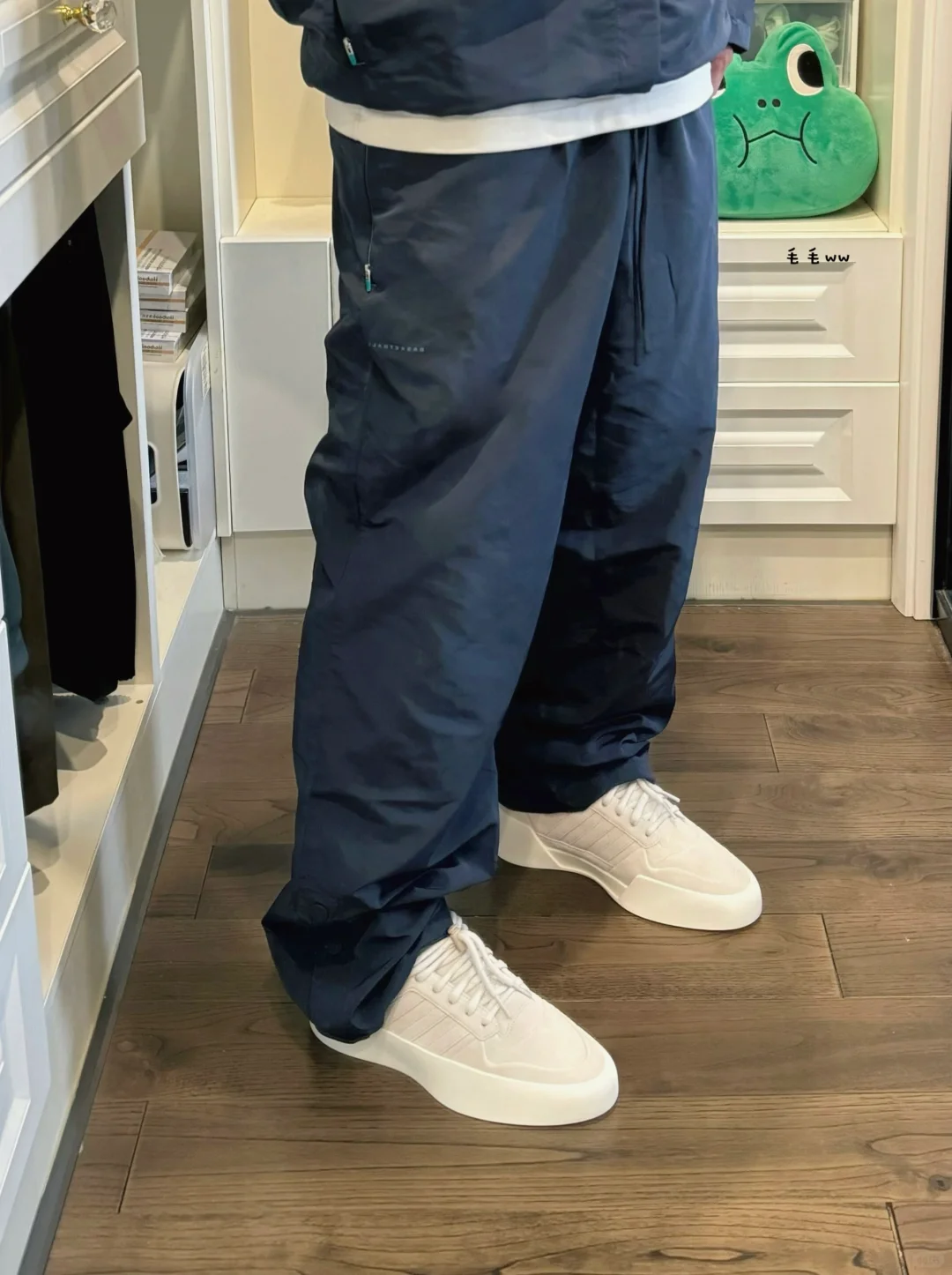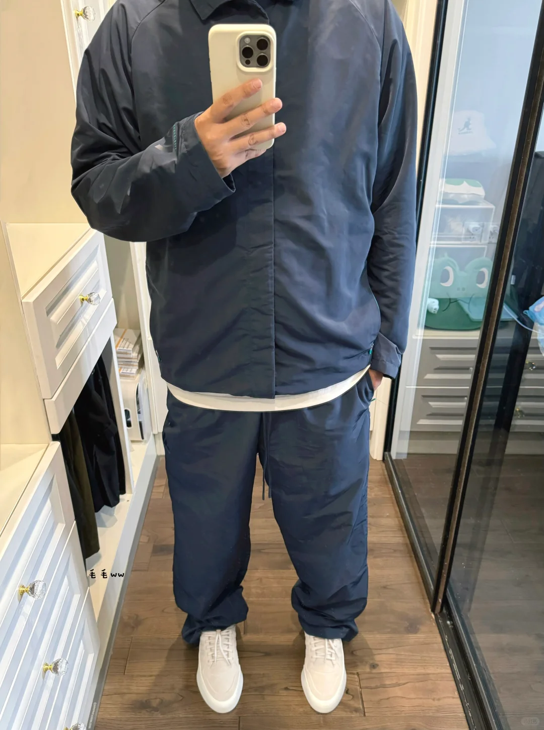 -上一季Chapter 02,这套组合就引起了我的注意,教练夹克搭配排扣长裤;可惜配色仍然单一,从棕灰变成了夜空蓝(navy) . -整体没有大变动,版型一致,抽绳下摆,排扣裤脚;细节调整令人欣慰,解决了之前所有问题:夹克过于冗长,排扣制作反向 . —————— . ✏️本人178cm75kg 球鞋尺码265mm(正常EU42) . 💭以上均为我个人观点,不喜勿喷,欢迎讨论。