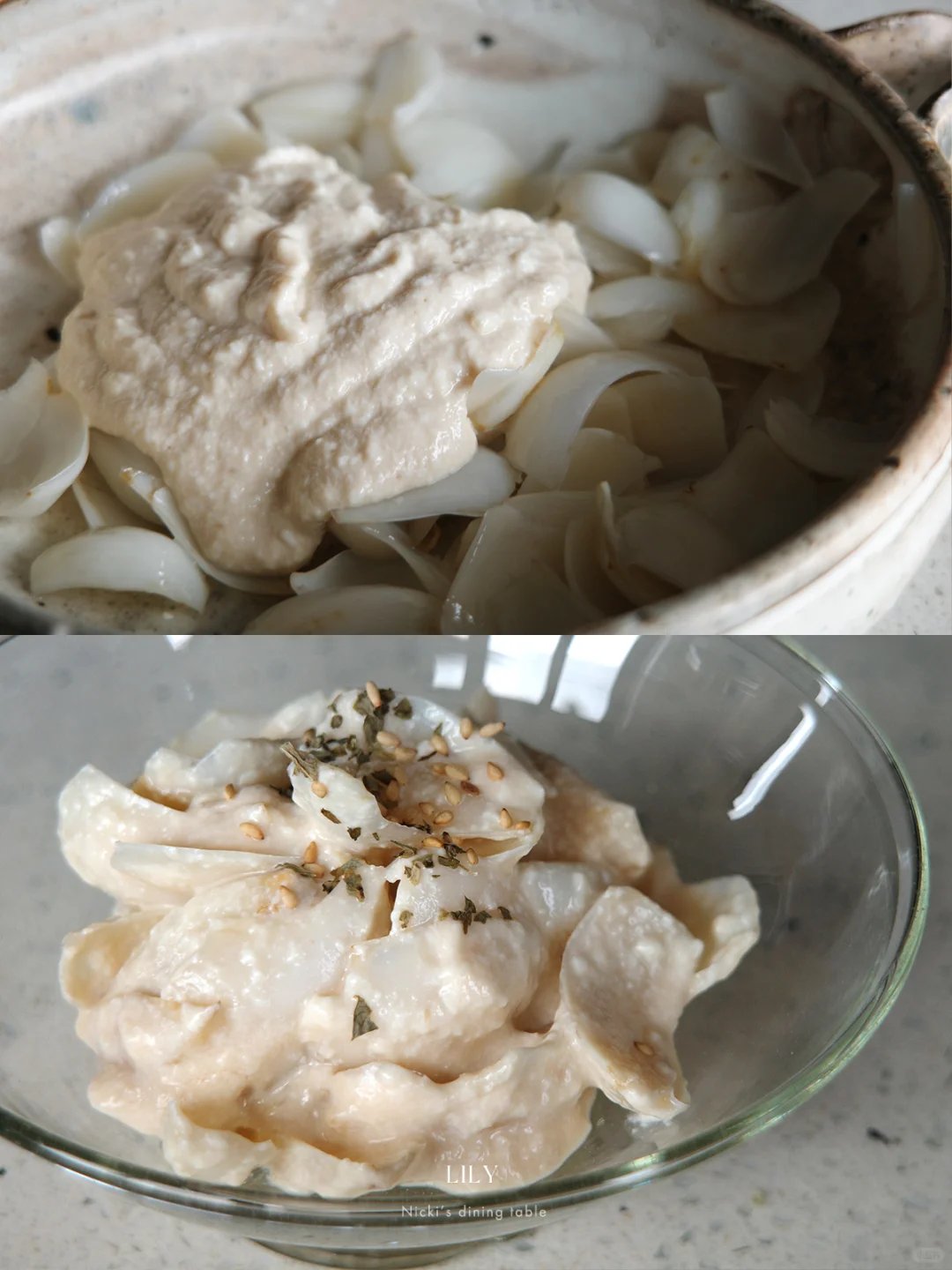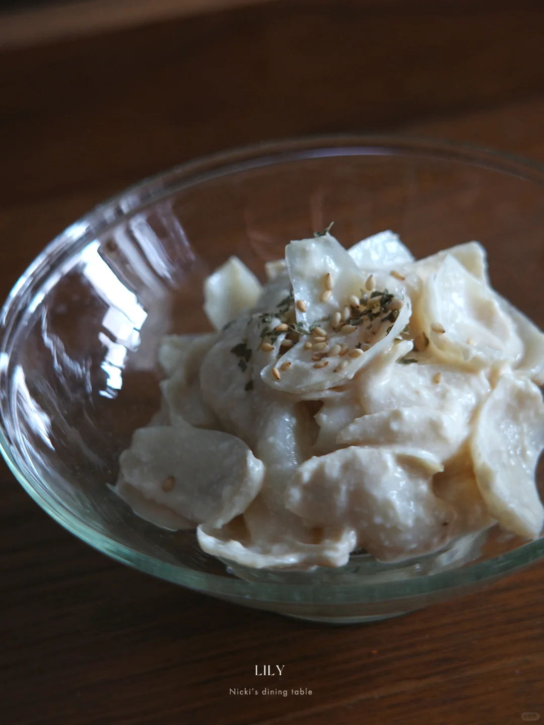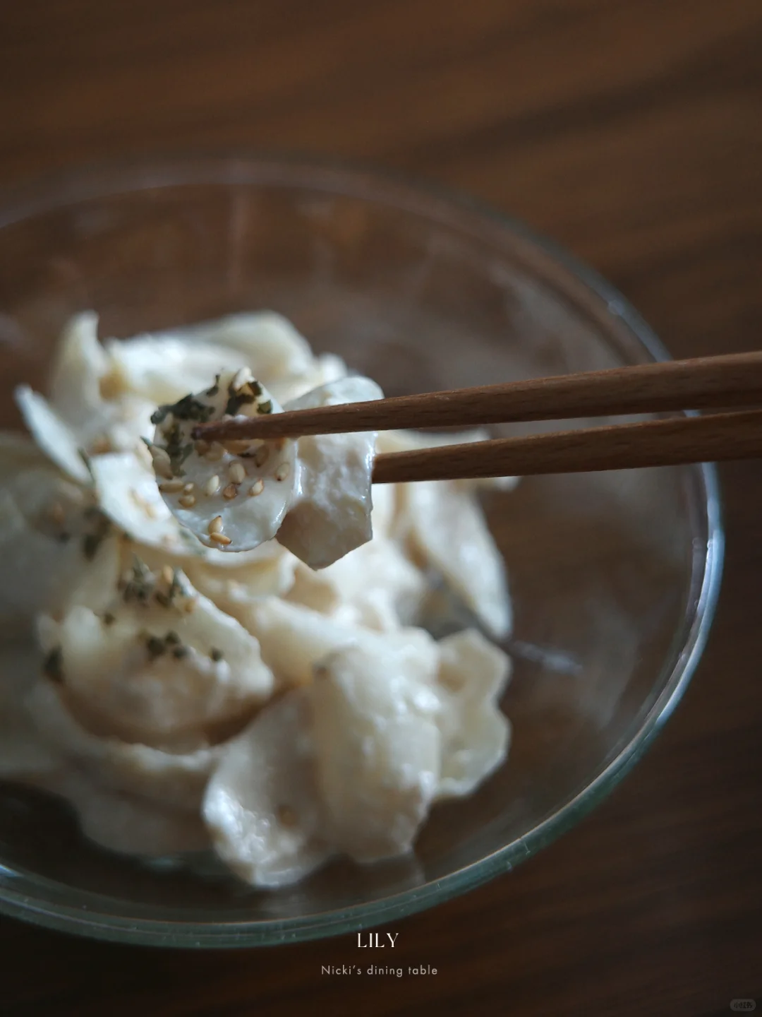 豆腐做涼拌酱是日式夏季料理中经常会出现的,豆腐去除掉多余水分,用研钵搅拌上劲,不论是拌百合或是时令蔬菜都是非常不错的,放入冰箱冷藏片刻,口感更清爽。