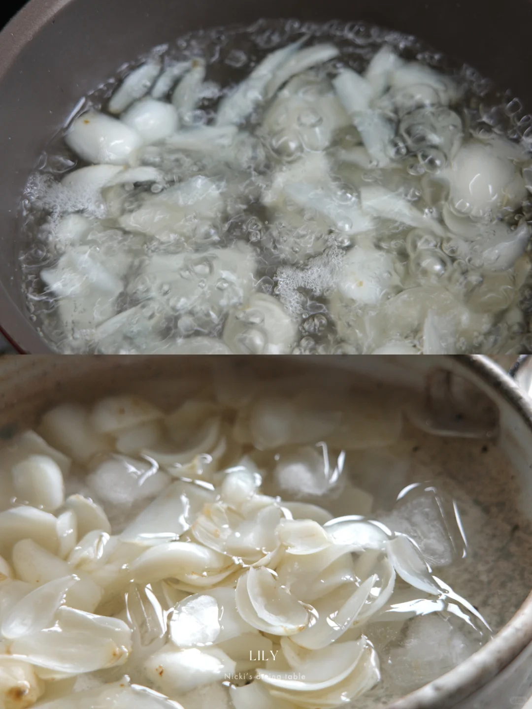 •百合一片片剥开洗净,锅中水煮开加少许盐,放入百合煮1分钟左右捞出浸冰水中。