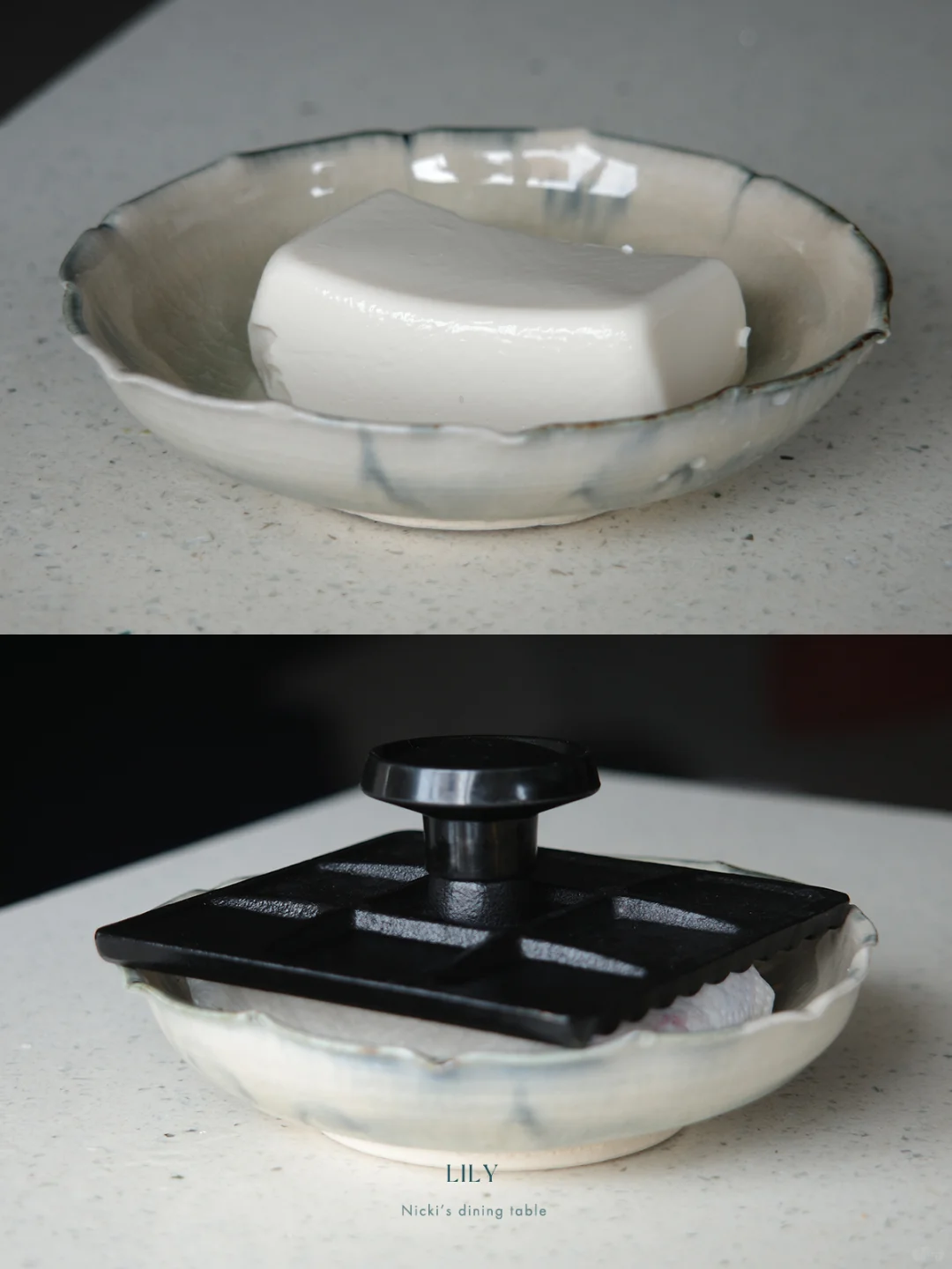 •豆腐用厨房用纸或者棉布包起,用重一些的器具或是盘子压住,挤出豆腐中多余水分。