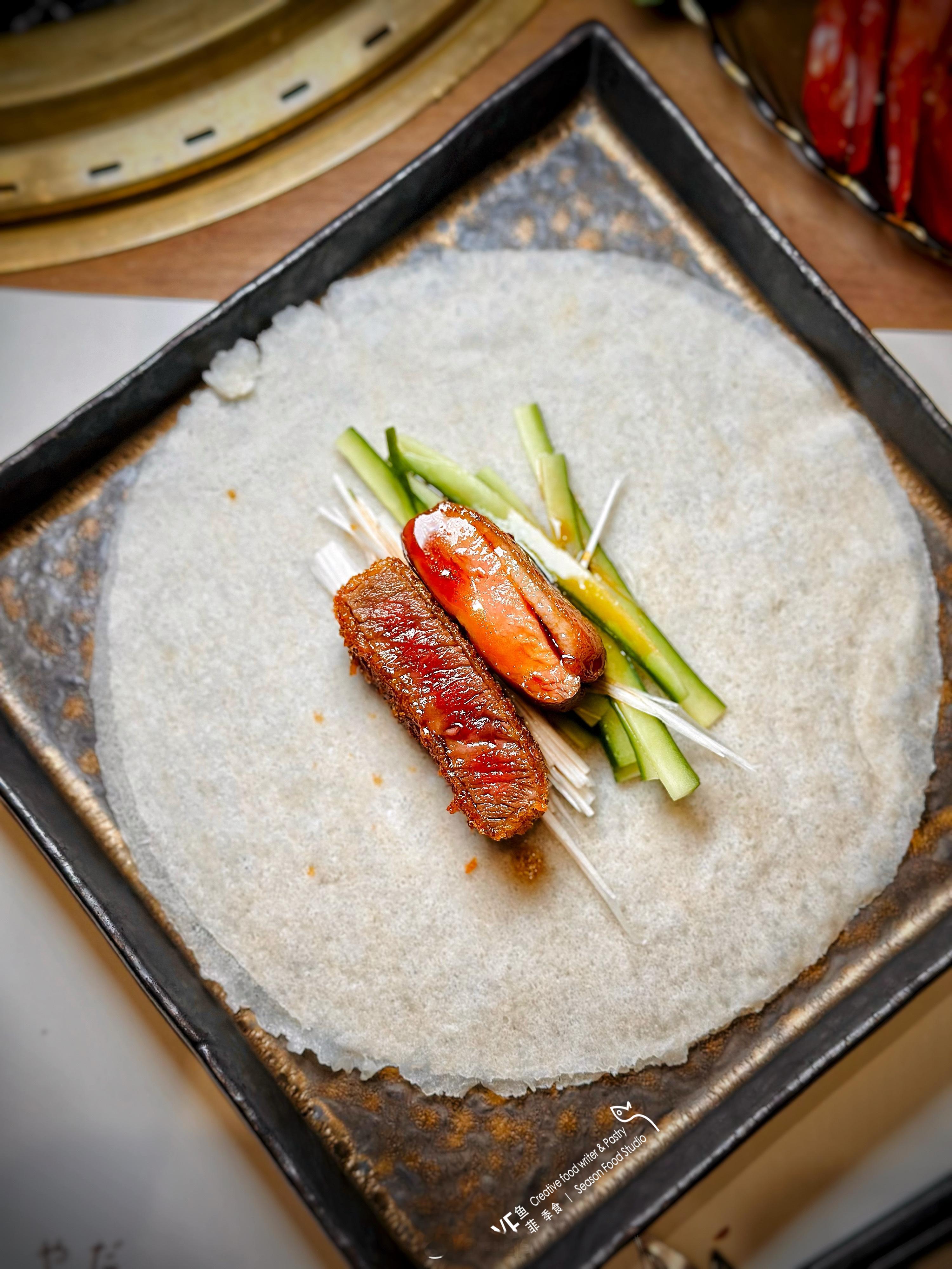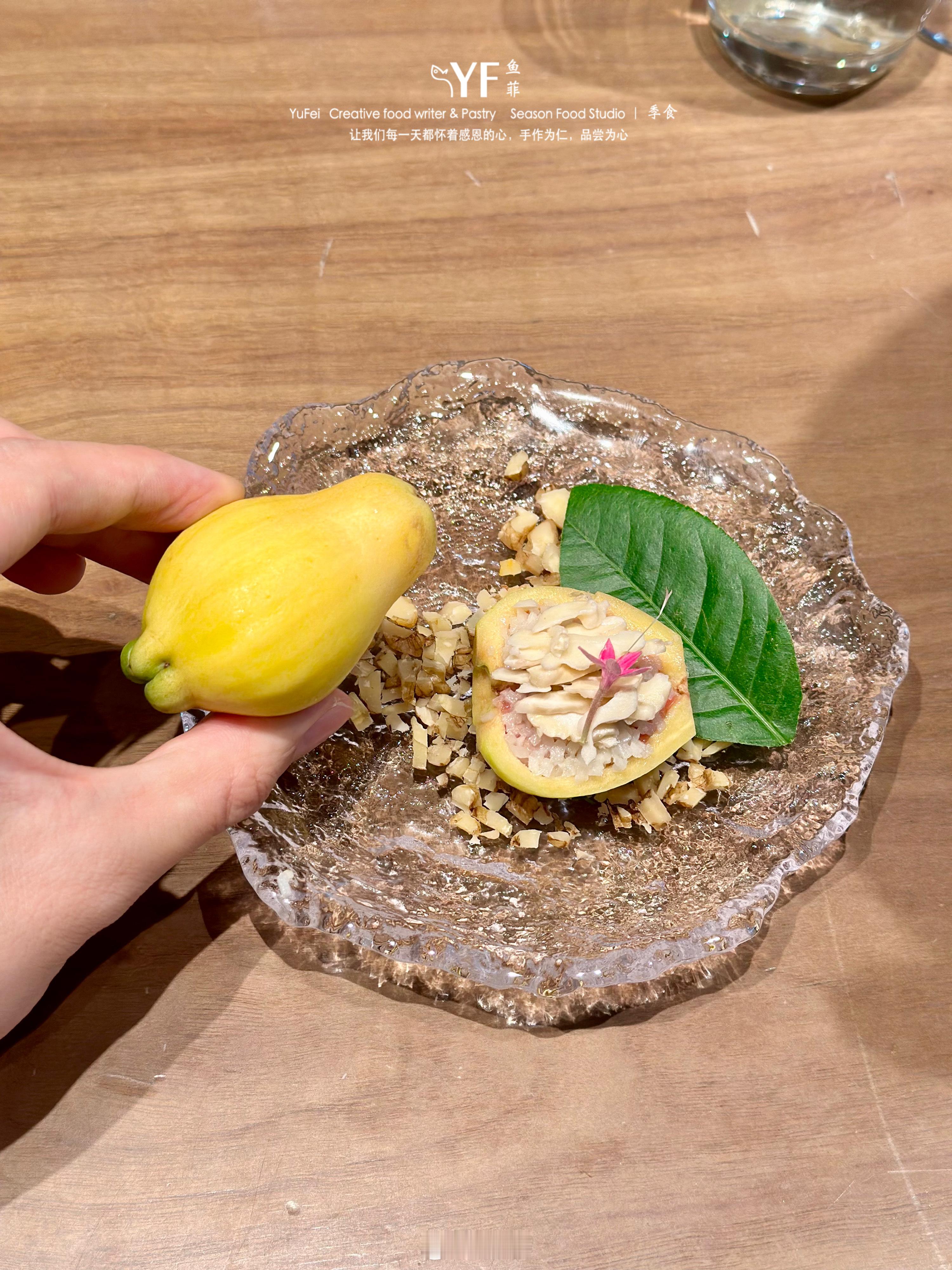 以及用四川宜宾水蒲桃佐味的和牛肉泥佐坚果碎、熟成鸭胸配菲力卷饼都是当季的新菜。