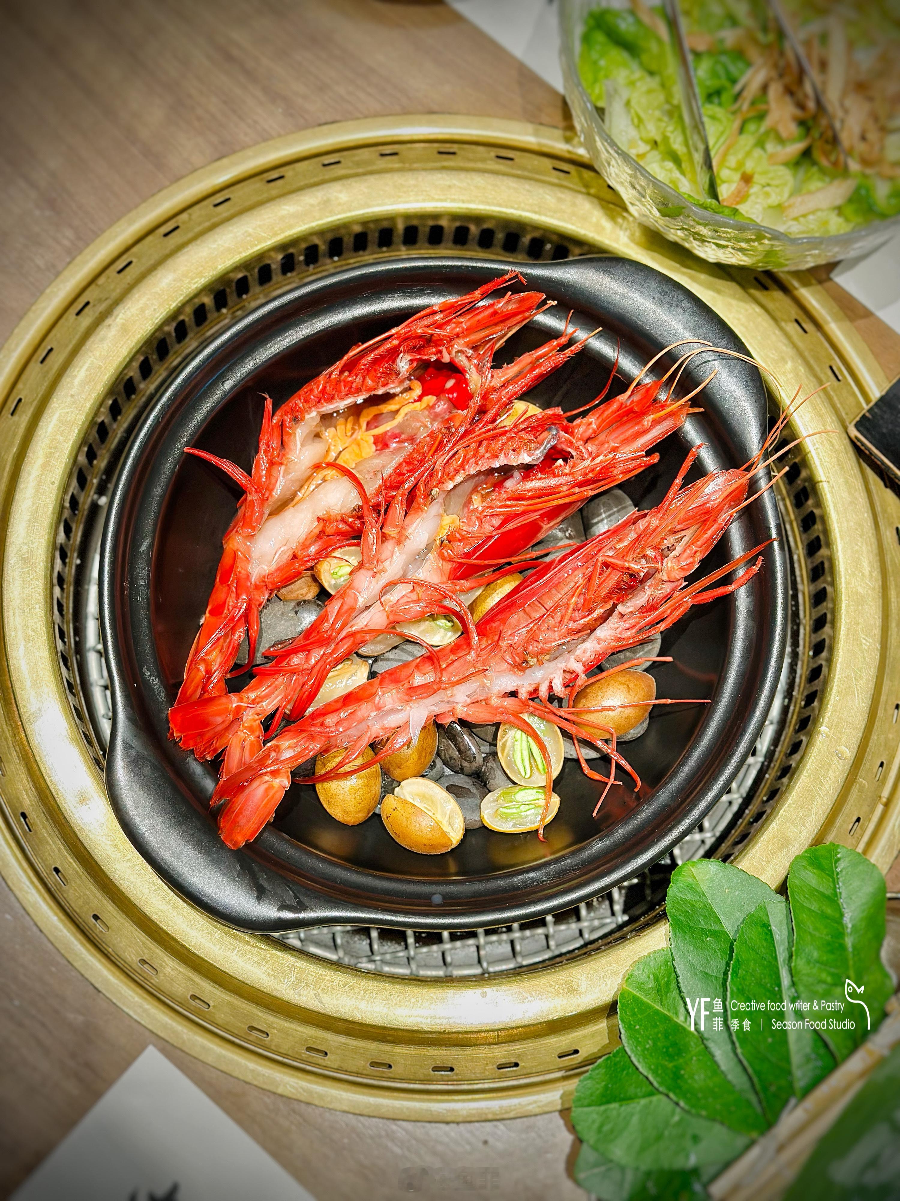 西班牙红魔虾,肥美健硕,与广东鸡心黄皮果搭配焖蒸。砂锅铺上黄皮果,加入纯果汁和红魔虾,以柠檬叶盖顶,闷蒸至虾肉半生熟,淋上特制果汁酱,虾膏、虾肉与淡淡的柠檬香和黄皮果香在口中完美融合。