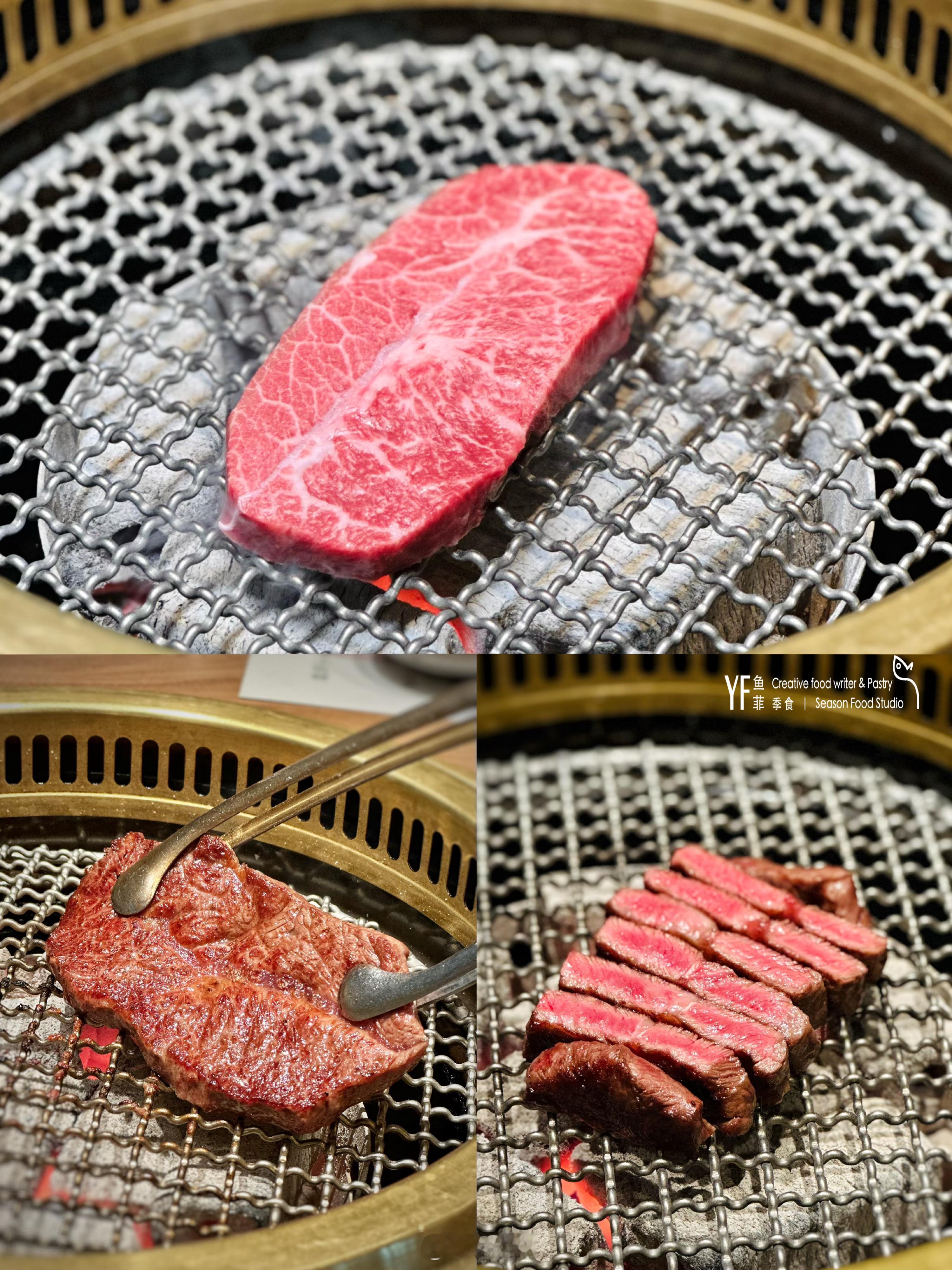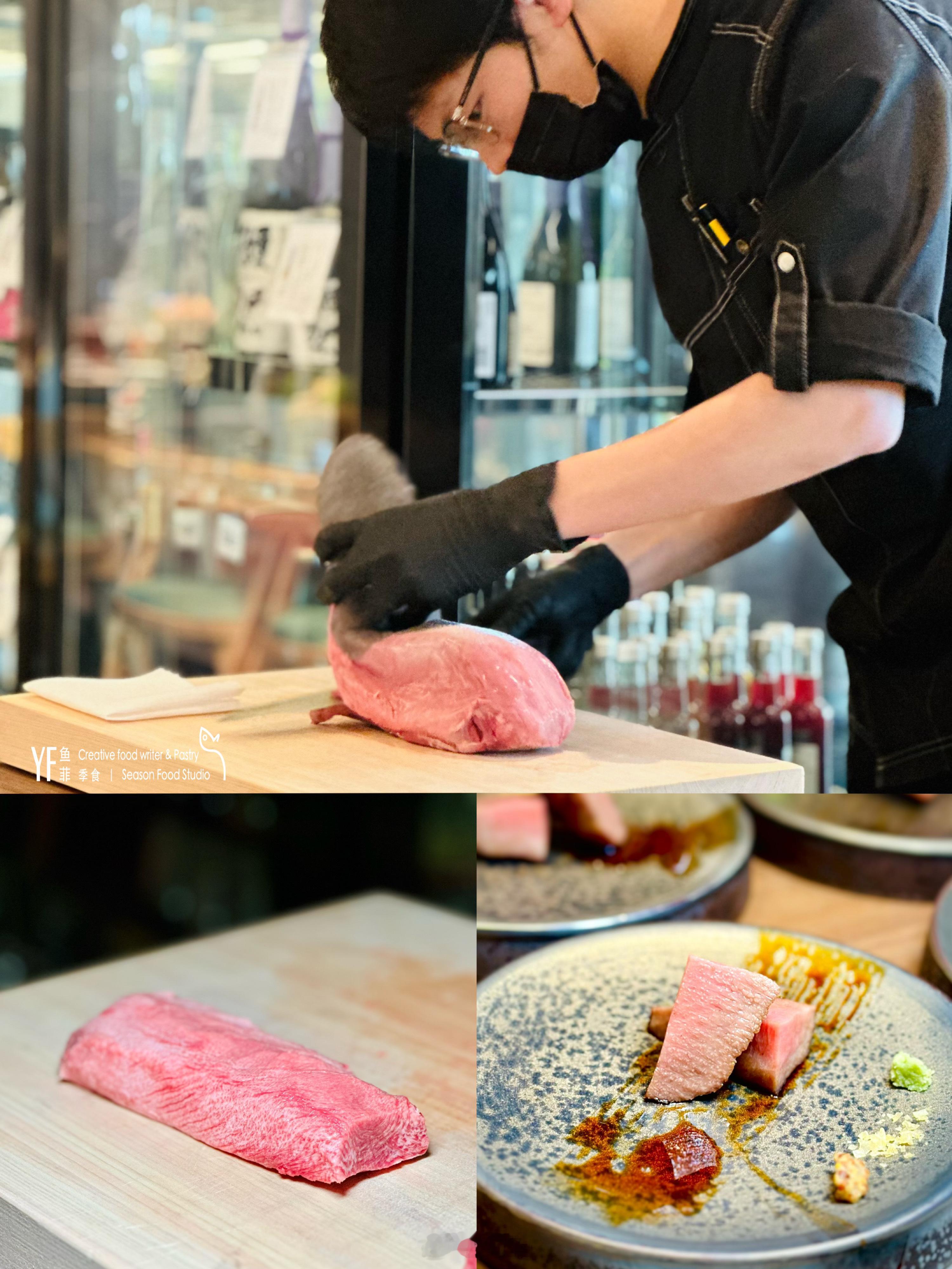 本季的主打菜品之一——冰鲜隆铭和牛牛舌,以青岛隆铭牛的一整根冰鲜牛舌为材料,在桌边即开即修,仅保留最精华的尾段部分。尾段肉质细嫩,油脂丰富,炭烤至六分熟,外层焦香,内里肉色粉红,口感Q弹,汁水饱满。