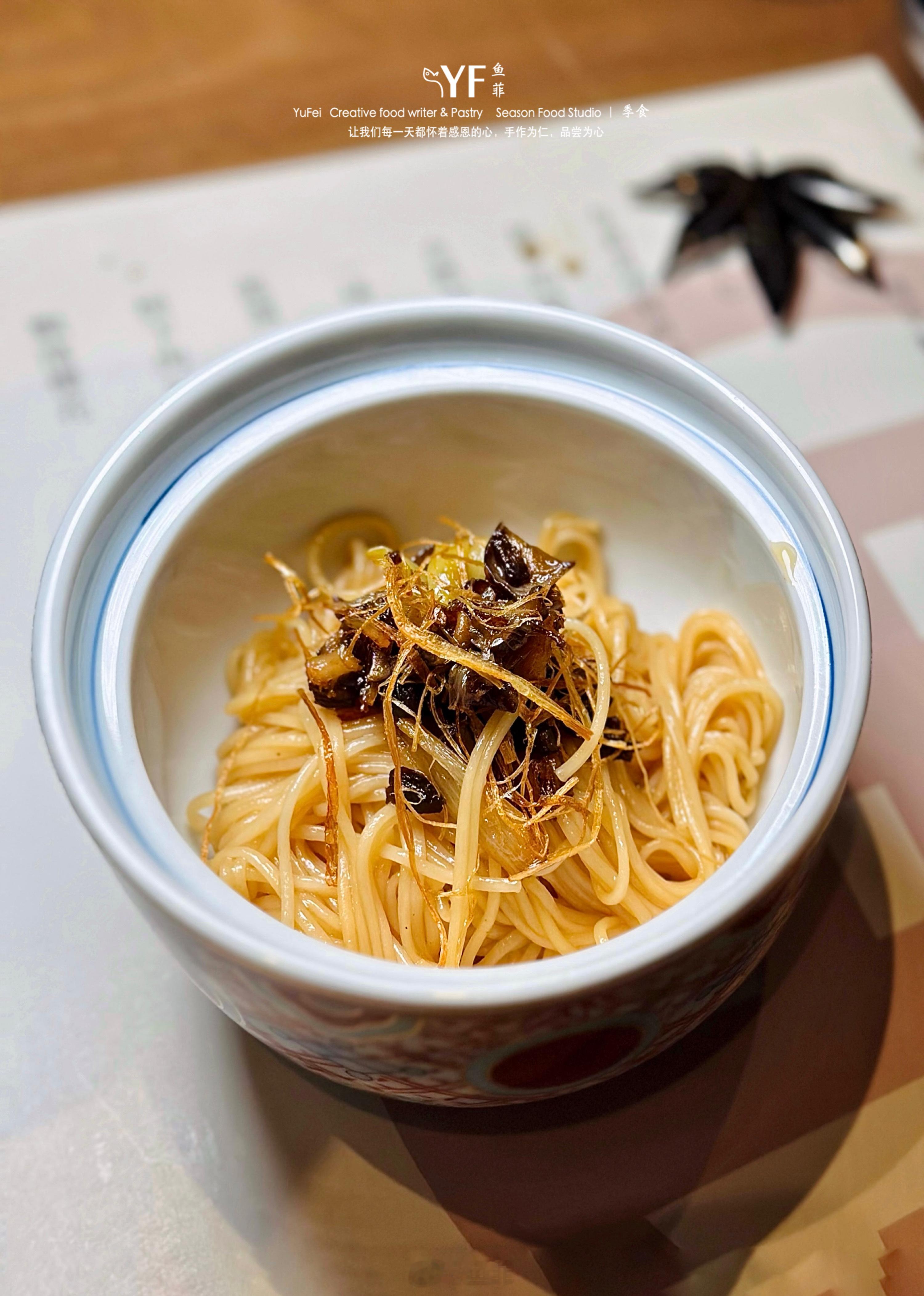 云南见手青牛肝菌,野性十足,与和牛肉粒、瑶柱一起慢炖,熬成浓郁牛肝菌酱,再点缀葱油、京葱丝,成就一碗日式素面版本的“葱油拌面”,朴素中自有华丽之味。