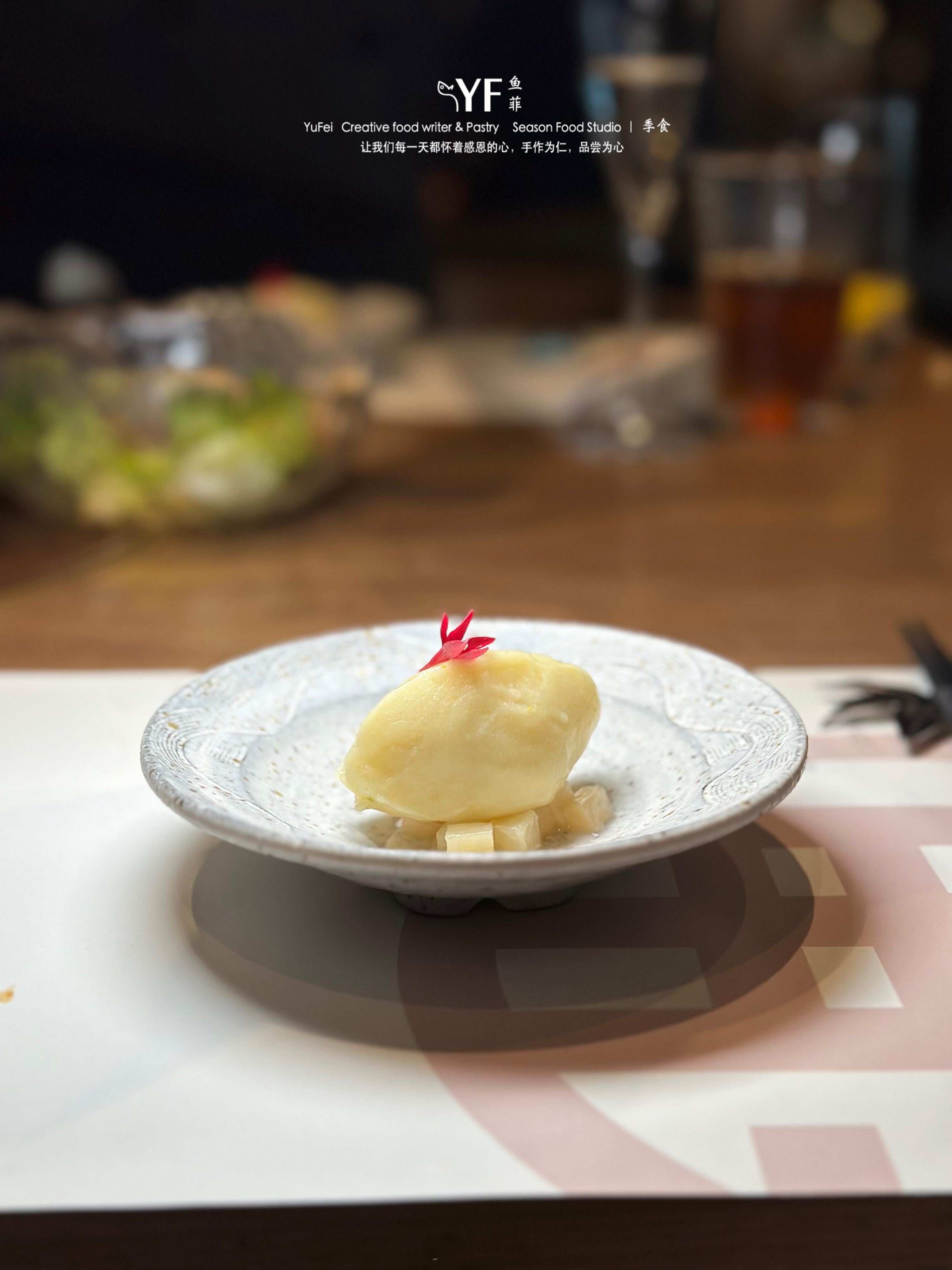 入口清新柔润,冰鲜的章红鱼经过莳萝草及柠檬的12小时腌渍,香气和酸度渗透鱼肉,再用熟成柜风干72小时,收获独特风味。熟成章红鱼切片炙烧至2-3分熟,搭配攀枝花椰香芒果果肉,章红鱼的鲜香和芒果的甜美在唇齿间交织,令人陶醉。