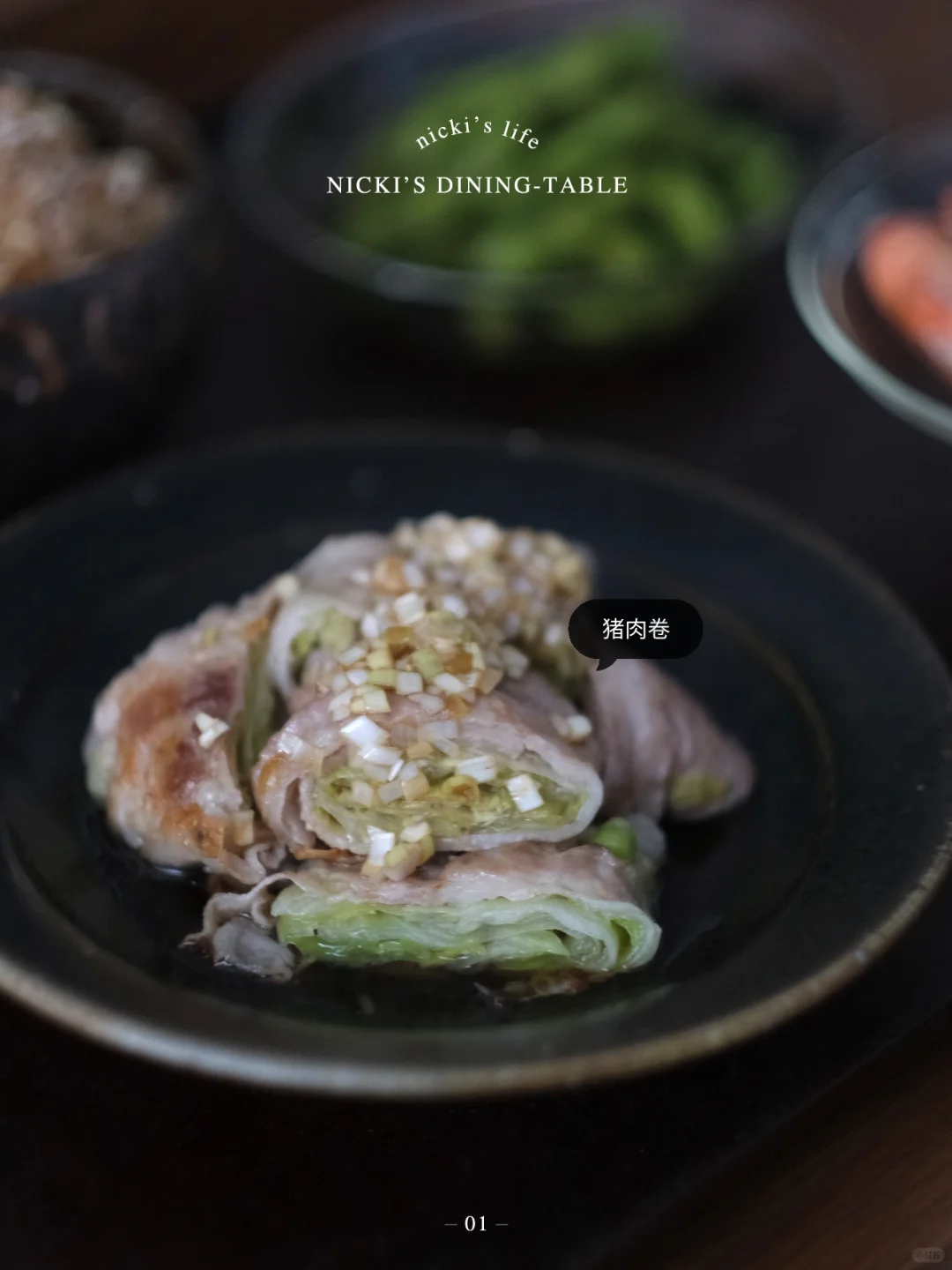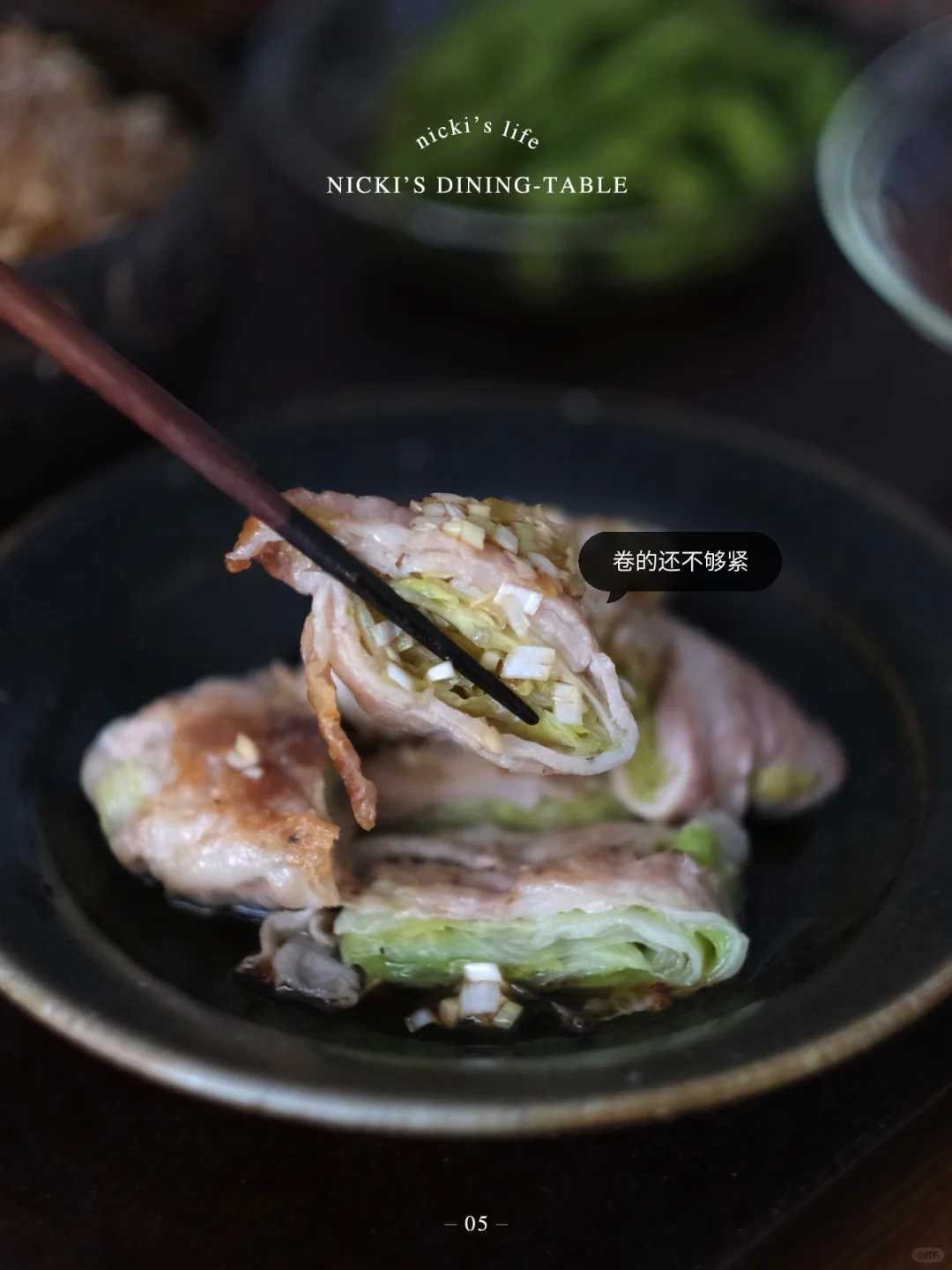 ·最后制作酱汁:大葱末+2勺生抽+2勺柚子醋+少许芝麻油+少许糖稀,搅拌均匀淋在肉卷上即可。