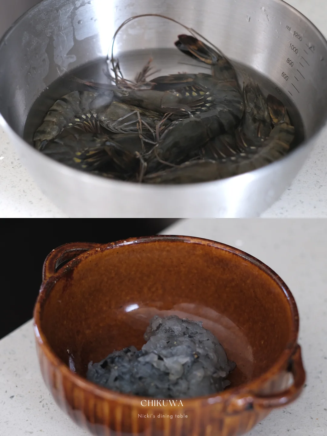 •黑虎虾去头去壳去虾线,剁成泥,加入1勺盐、少许黑胡椒搅拌均匀。
