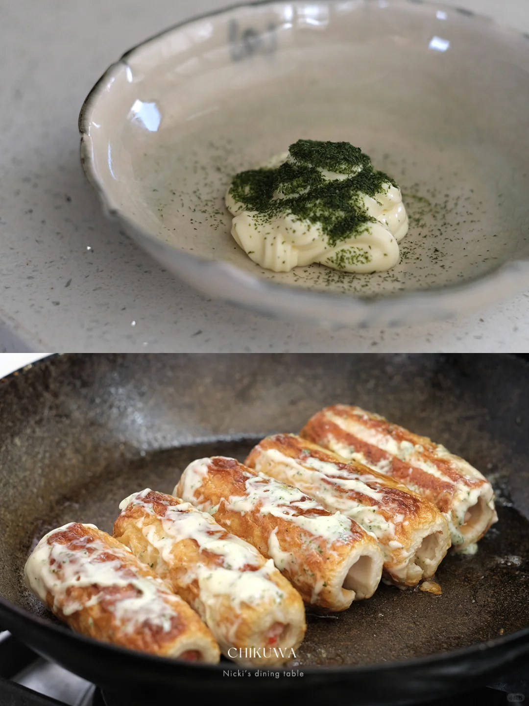 •2勺美乃滋加1勺海苔粉,调匀后,将煎好的竹轮均匀裹上,再放入锅中,小火煎至美乃滋微微融化即可(这样美乃滋不会太过于厚重,卖相也会更好一些)