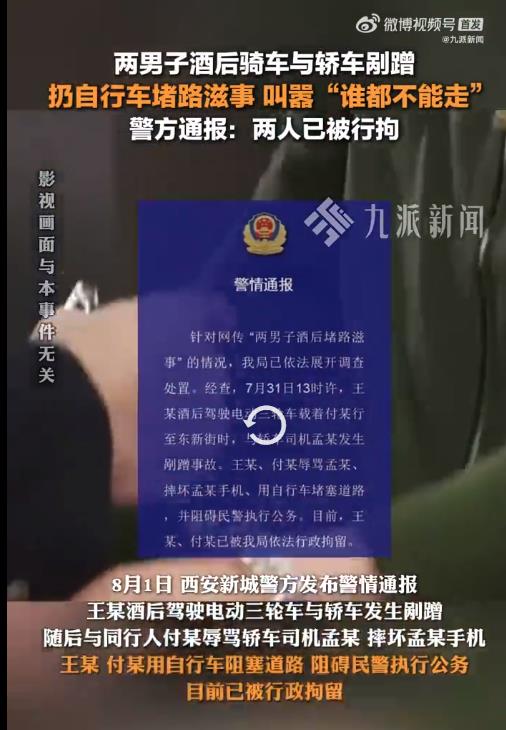 【警方通报2男子用共享单车堵路:已被行政拘留】8月1日,西安市公安局新城分局。经查,7月31日13时许,王某酒后驾驶电动三轮车载着付某行至东新街时,与轿车司机孟某发生剐蹭事故。王某、付某辱骂孟某、摔坏孟某手机、用自行车堵塞道路并阻碍民警执行公务。目前,王某、付某已被我局依法行政拘留。