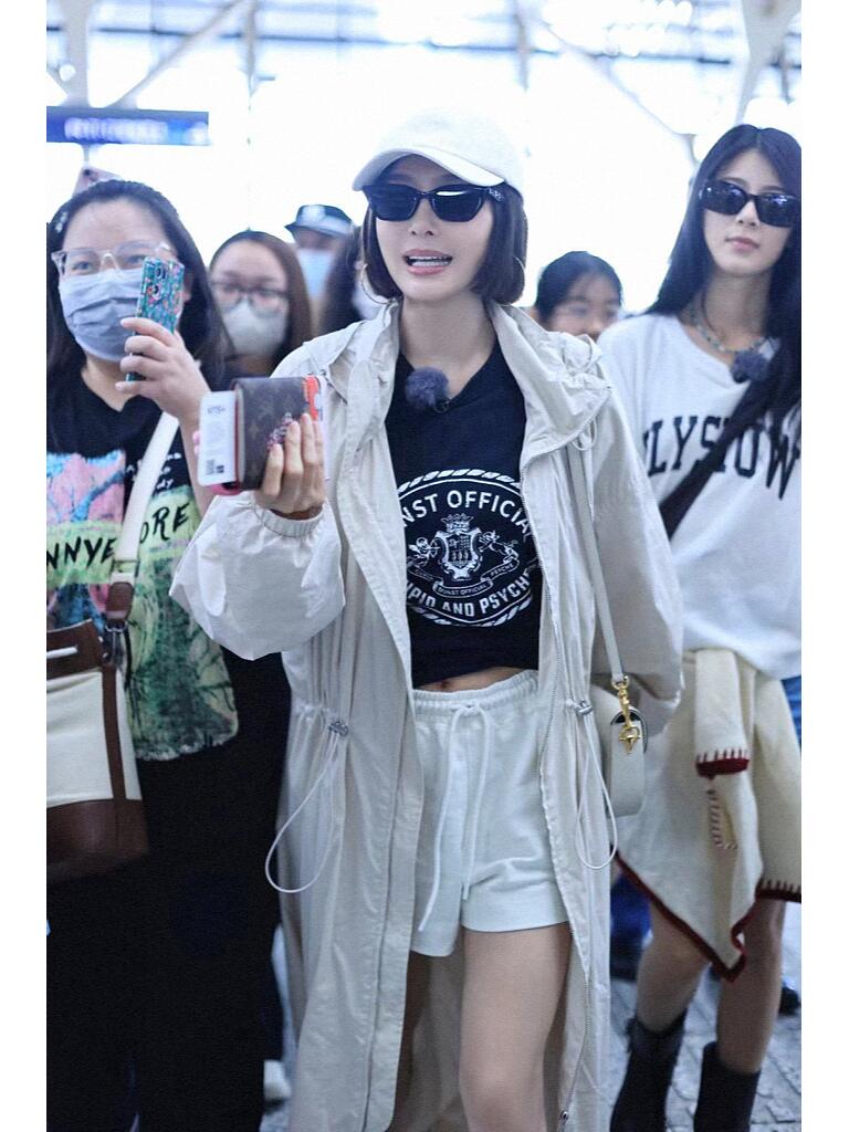 戴一顶白色的棒球帽,穿一件灰白色的休闲风长款风衣,内搭黑色圆领印花T恤,搭配白色的短裤,休闲随性又自在,而且很有青春感。