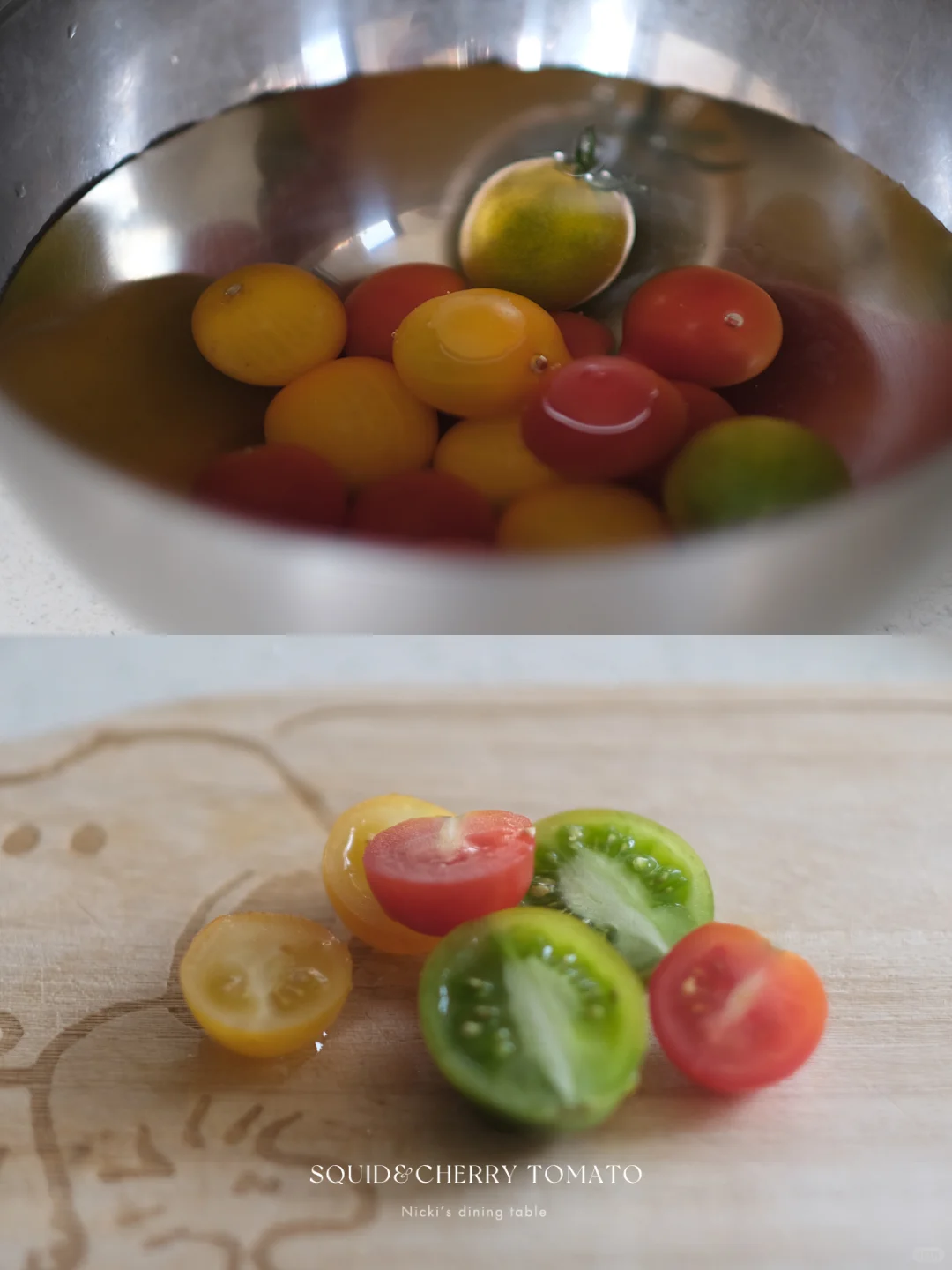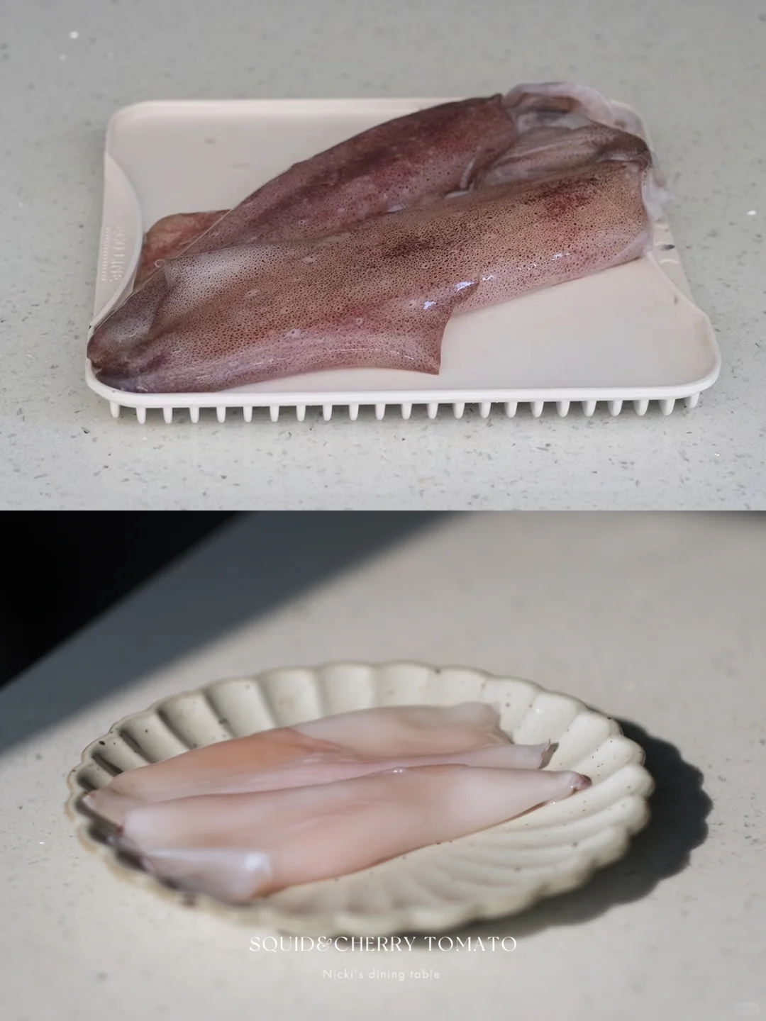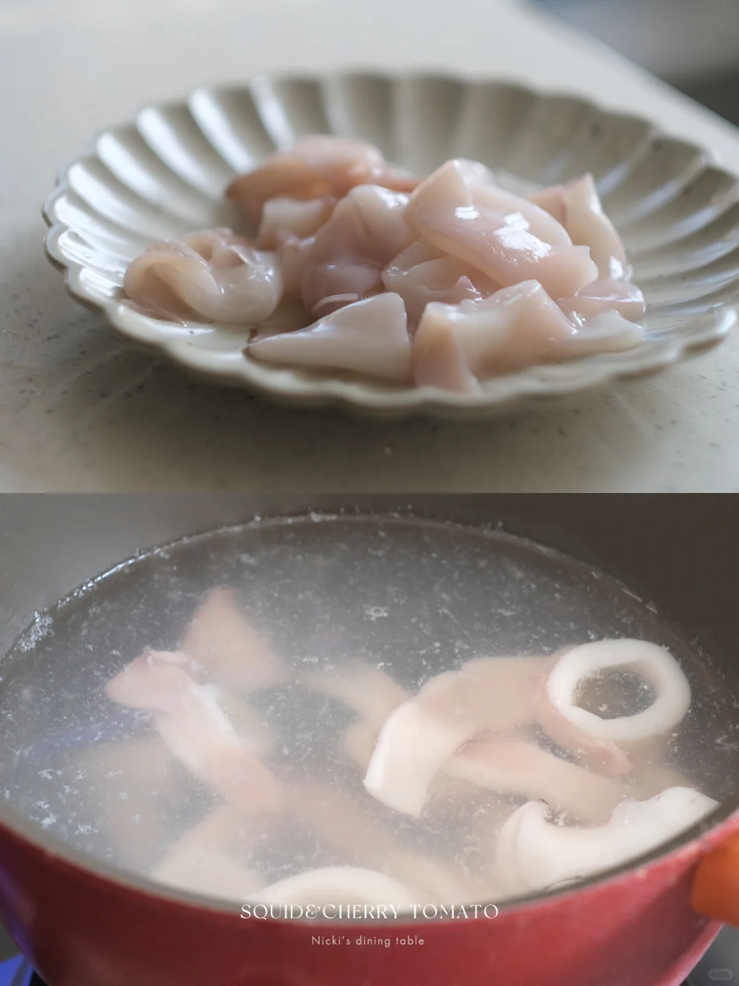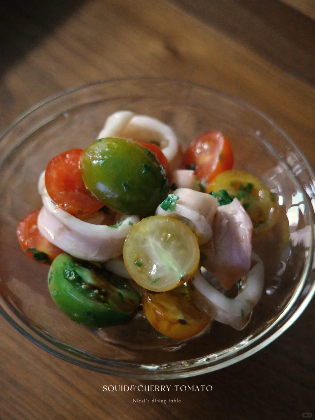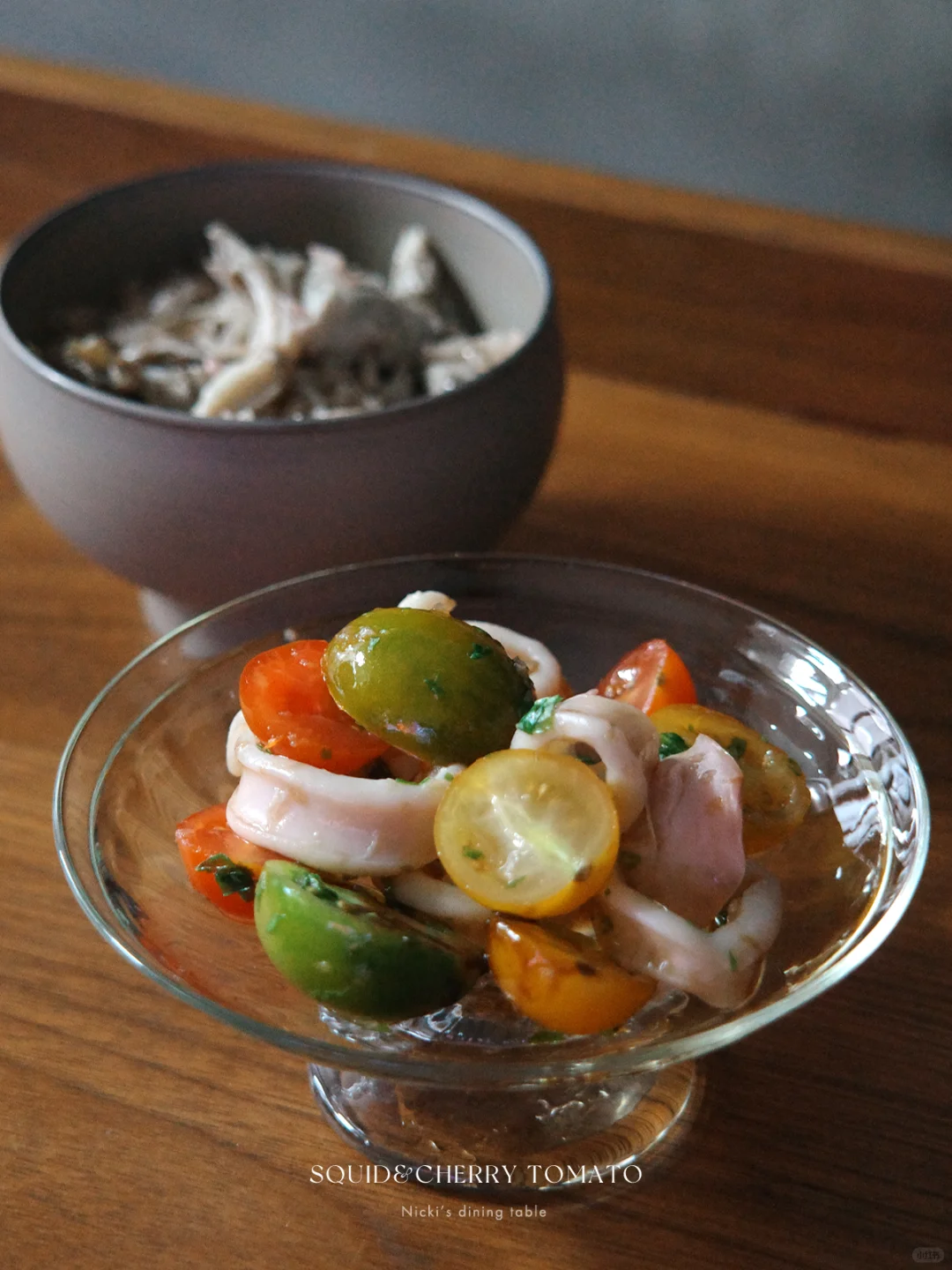 虽说到了立秋,但温度还依旧停留在炎夏,连着几天吃不同糟卤,今天换换口味。 - 菜谱:凉拌鱿鱼小番茄 🔅做法: •鱿鱼去头、去软骨、去皮膜,切1cm的圈。 •锅中把水煮沸后,加2勺味霖,关火,放入鱿鱼圈,鱿鱼圈紧实变色即可捞出。 •小番茄洗净对半切开,加入汆烫好的鱿鱼圈,倒入酱汁拌匀后放入冰箱冷藏即可。 🔺酱汁:2瓣蒜末➕3勺黑醋➕1勺盐➕2勺蜂蜜 日式餐桌|家庭料理| 器物之美|日本作家器|家常菜|晚餐吃什么|夏季餐桌