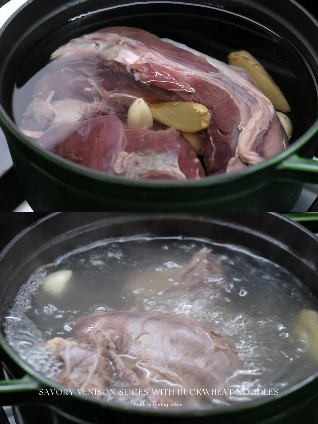 ·鹿腱肉去血水后,冷水下锅,加入蒜、姜,中火煮沸,用勺子捞去浮沫,转小火煮2个小时左右。
