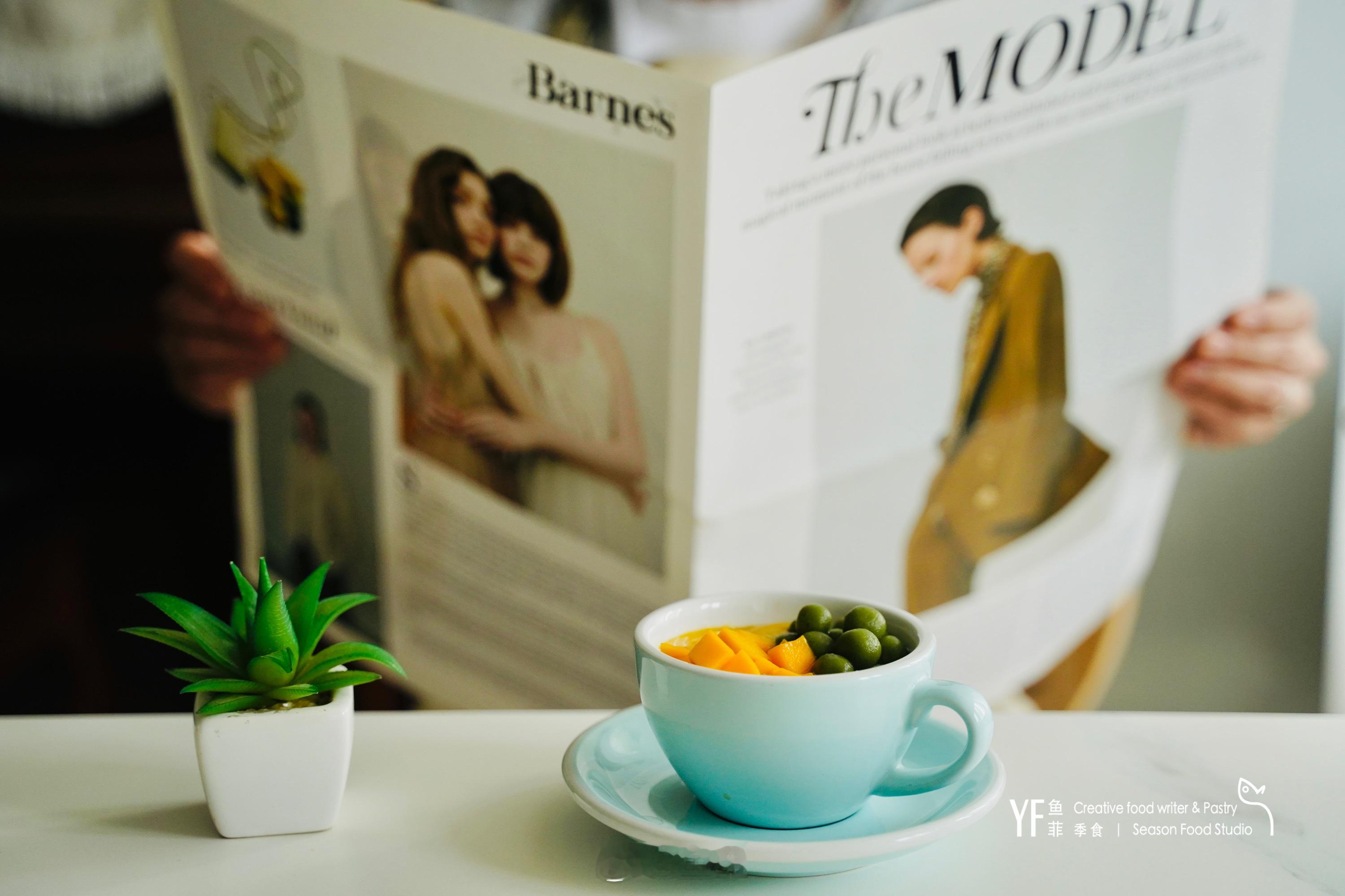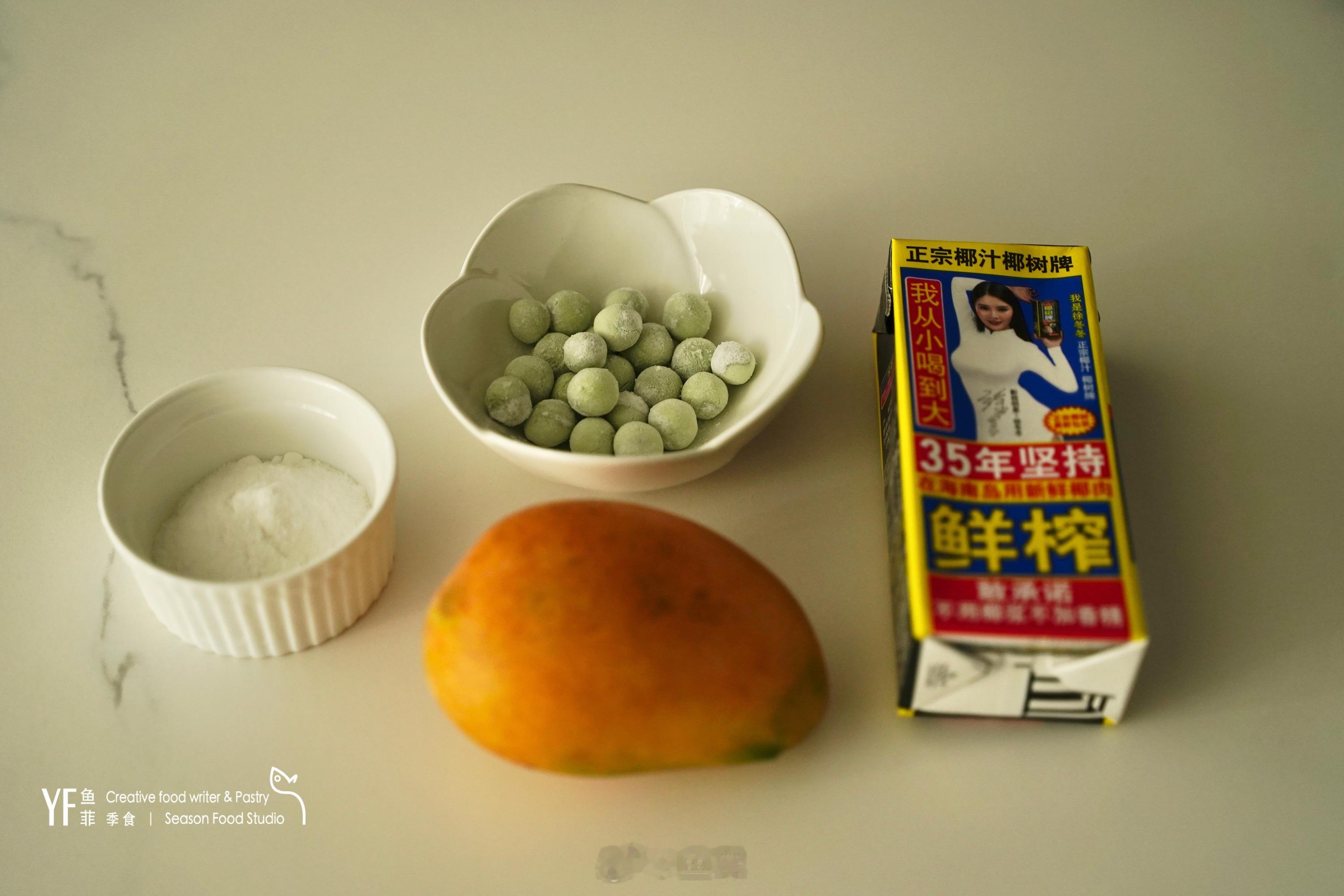 4、椰奶冻凝固后脱模,切成长条,装入拿铁杯中,然后倒入芒果果泥,再放上适量芒果肉和小圆子即可