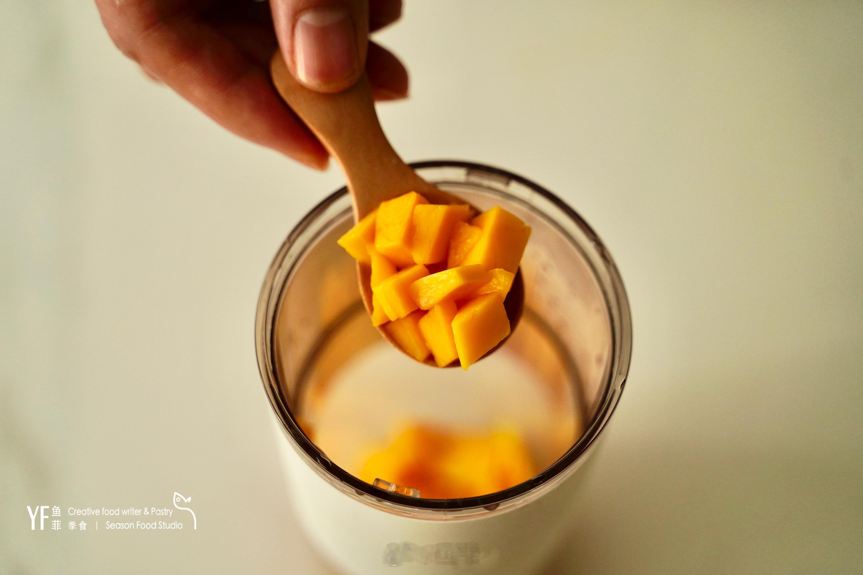 3、芒果去皮切丁,倒入料理杯中,加入少许清水,混合打成芒果果泥备用