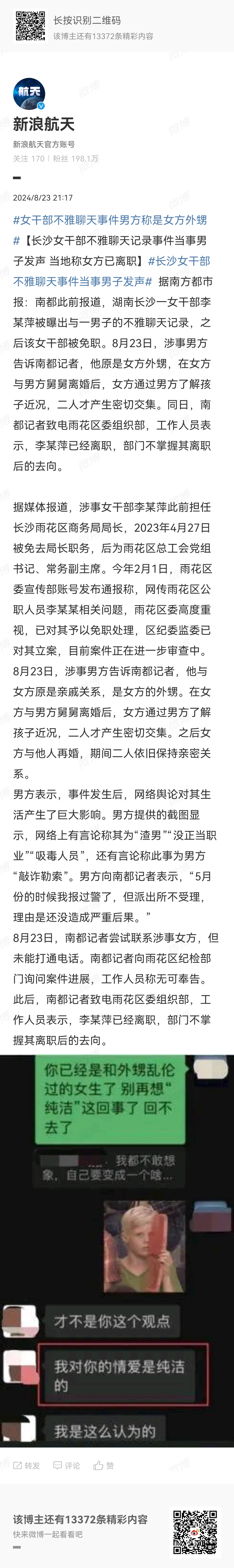 【长沙女干部不雅聊天事件男方称是女方外甥 当地称女方已离职】据南方都市报:南都此前报道,湖南长沙一女干部李某萍被曝出与一男子的不雅聊天记录,之后该女干部被免职。8月23日,涉事男方告诉南都记者,他原是女方外甥,在女方与男方舅舅离婚后,女方通过男方了解孩子近况,二人才产生密切交集。