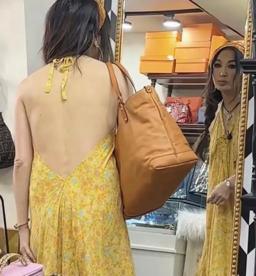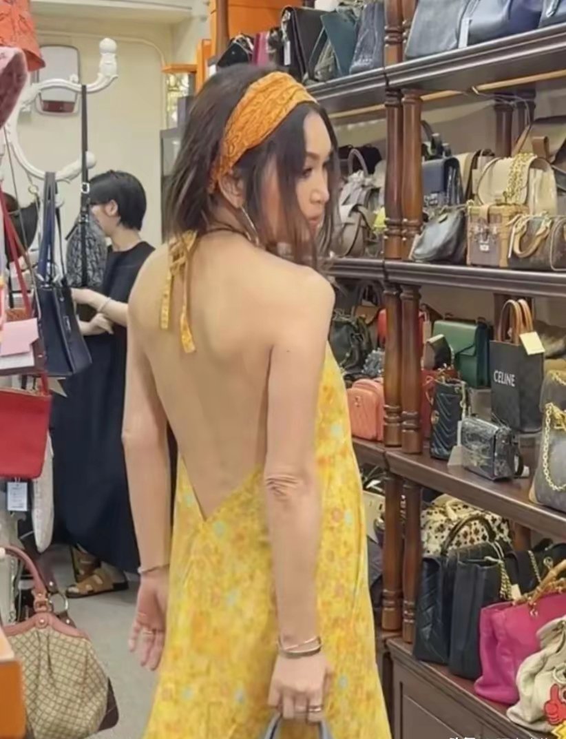 年近花甲的温碧霞穿大露背吊带裙逛中古店,身材依然火辣,就是面部医美痕迹明显,不服老也不行啊,手臂关节的皱褶和背部已然松驰的肌肉已经显示不是年轻人了