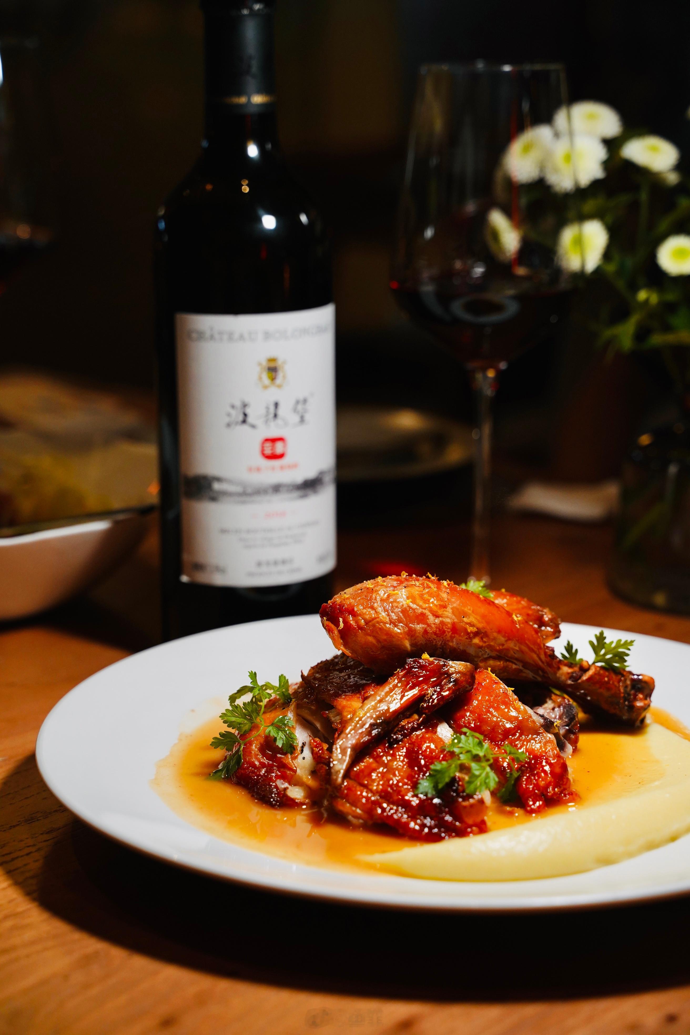 炼舍烤鸡做的妙,外皮润香,鸡肉入味,佐餐的土豆泥丰腴细腻。小酌一口波龙堡至尊有机干红,赤霞珠、美乐混酿的优雅温润,每一口与舌尖碰撞,都能感受到其复杂的力量感。除梗破碎后入罐控温发酵,自然苹乳发酵,法国橡木桶陈酿12个月。