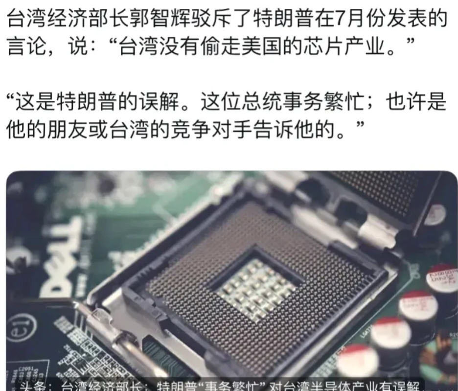 台湾不干了! 台湾方面表示,特朗普关于台湾偷走了美国芯片产业的说法是错误的。 有评论表示,面对特朗普咄咄逼人的态度和说法,台湾也是不再忍受了。此前,特朗普表示,台湾靠芯片产业赚到盆满钵满,而这是偷走了美国的芯片产业。所以台湾要交纳更多的保护费,否则美国何必再保护台湾? 事实上,对于特朗普来说,能从台湾身上榨取更多的金钱,就绝对不会放过。毕竟对于特朗普来说,其美国优先的战略理念,早就多次亮明了。