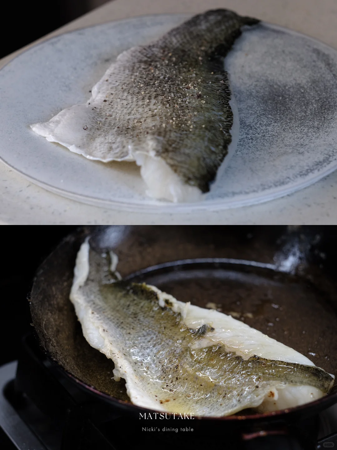 •取一个平底锅,鲈鱼片抹上胡椒盐,下锅煎熟。