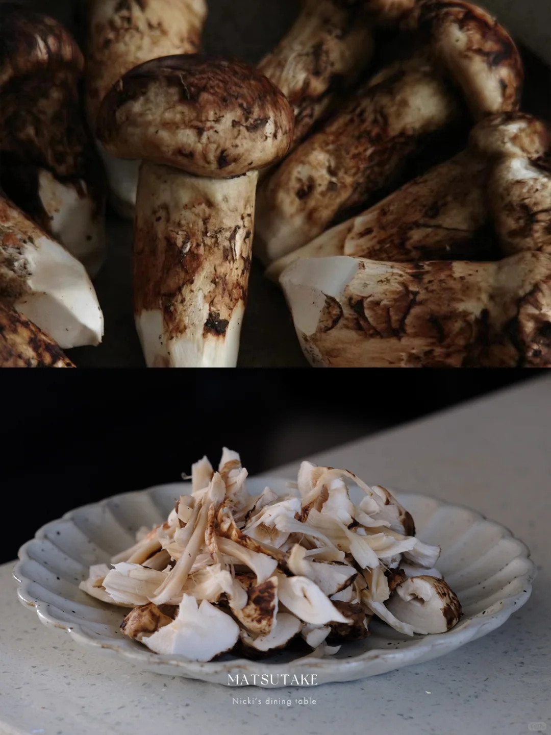 •松茸用陶瓷刀把表面泥土刮去,再用湿布轻轻擦拭一下,沿着松茸纹理撕开。
