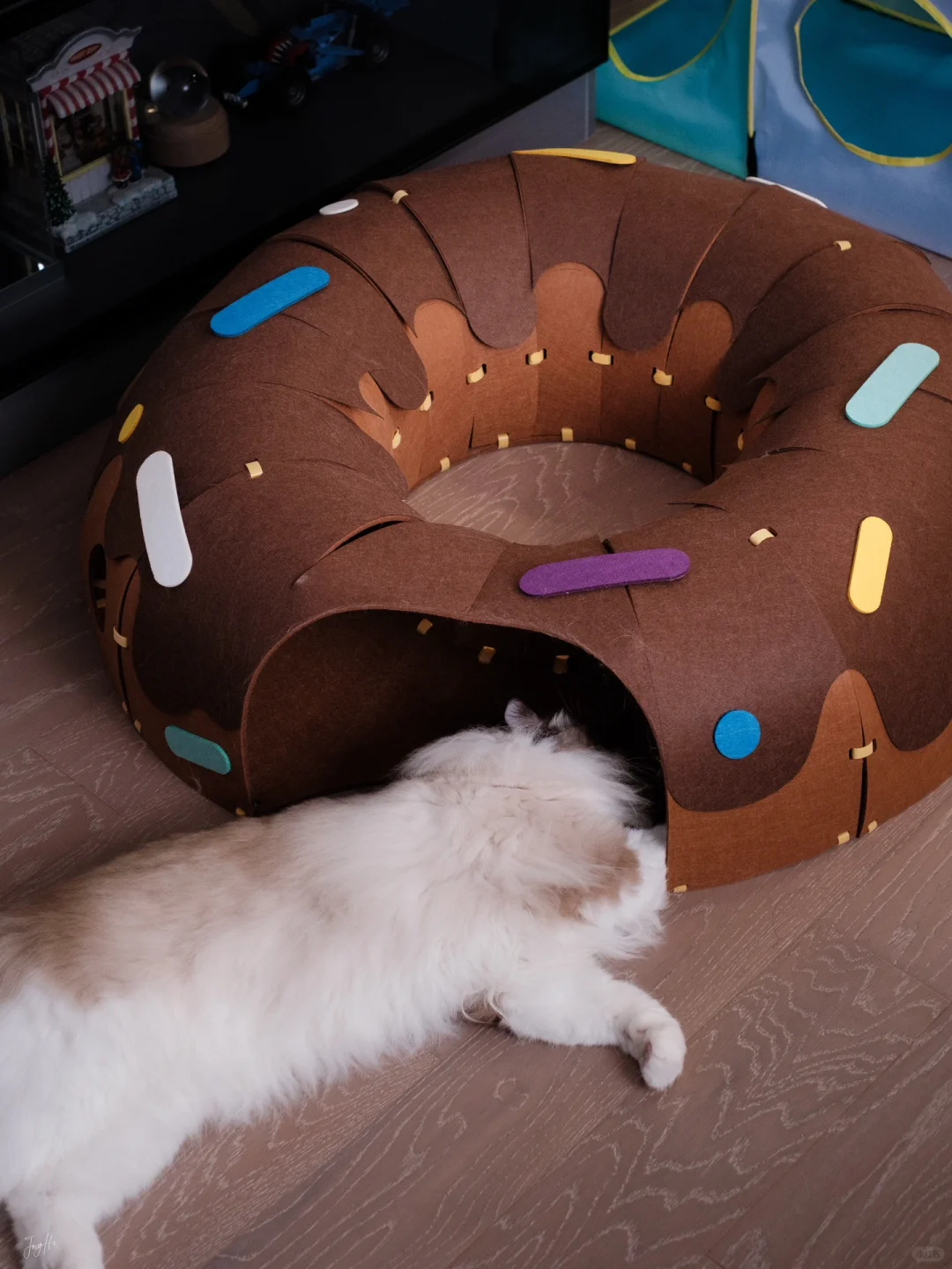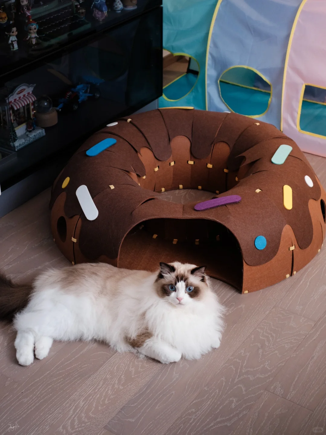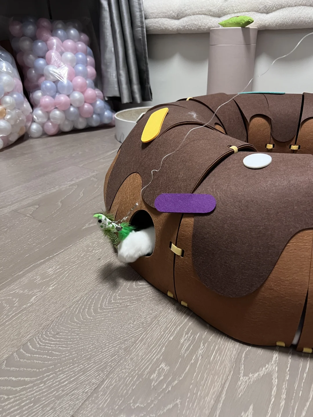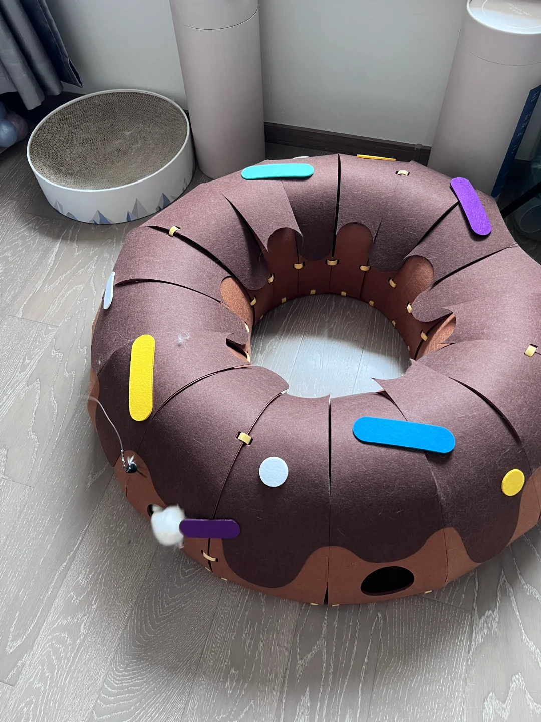 安装有点费劲,每个小孔都要自己手动绑带 装饰点缀也需要自己设计一下 但成品真的很值得!! 颜值很高的一款隧道!! 寿司很爱钻进去躲着 或者直接在里面睡觉 玩逗猫棒配合甜甜圈也更好玩了 总之隧道类玩具真的太符合猫咪天性了 怎么买都不会出错! 唯一缺点是太粘毛 清理也有点费劲 但孩子喜欢 无所谓! 购于Queen喵的王国