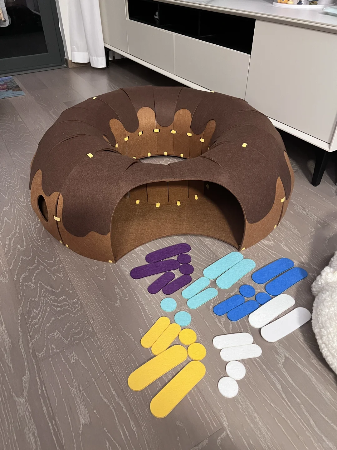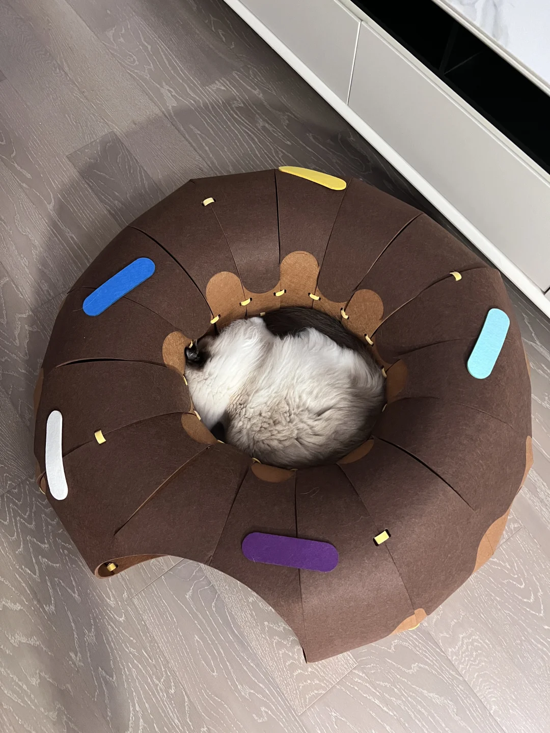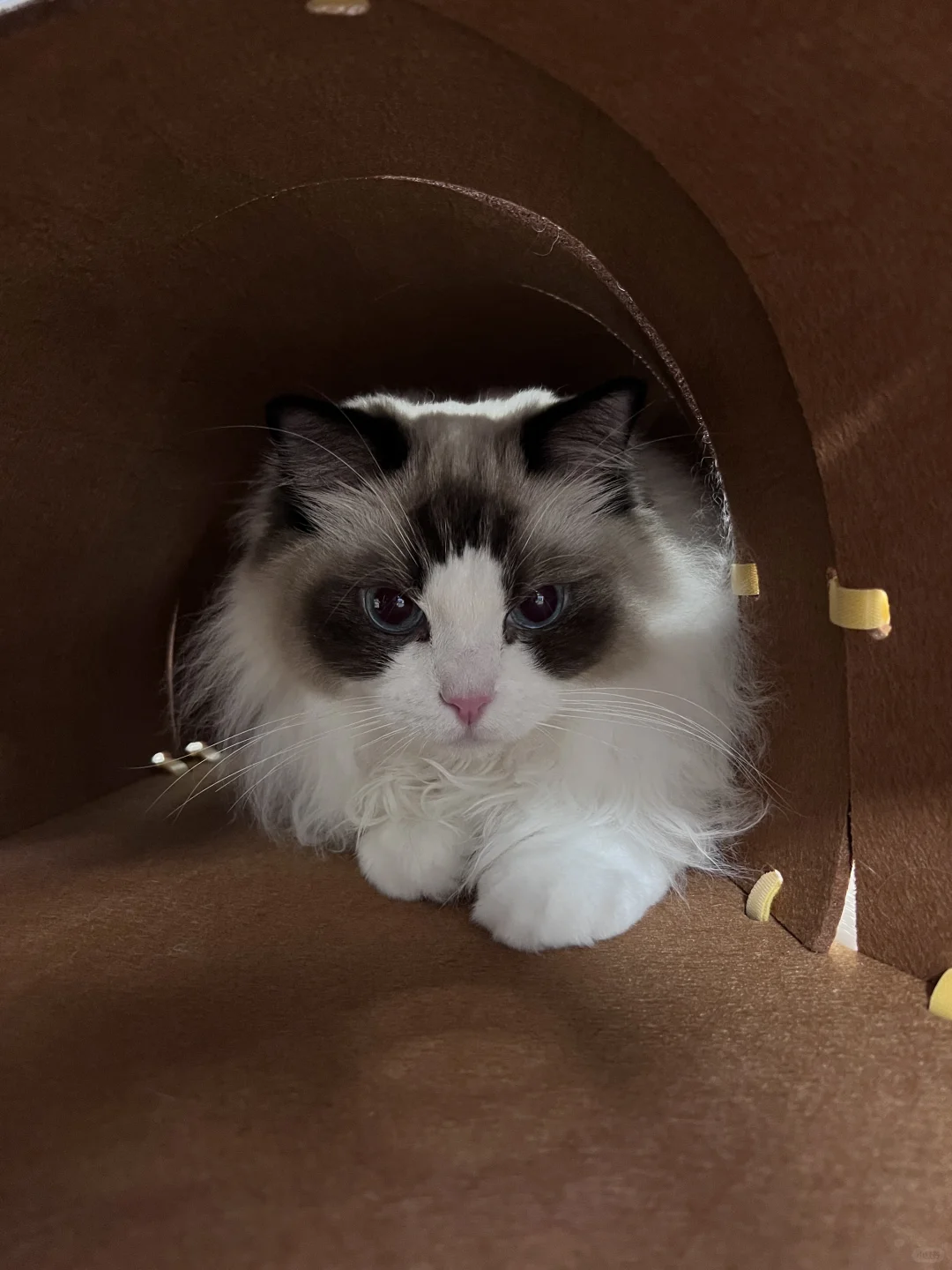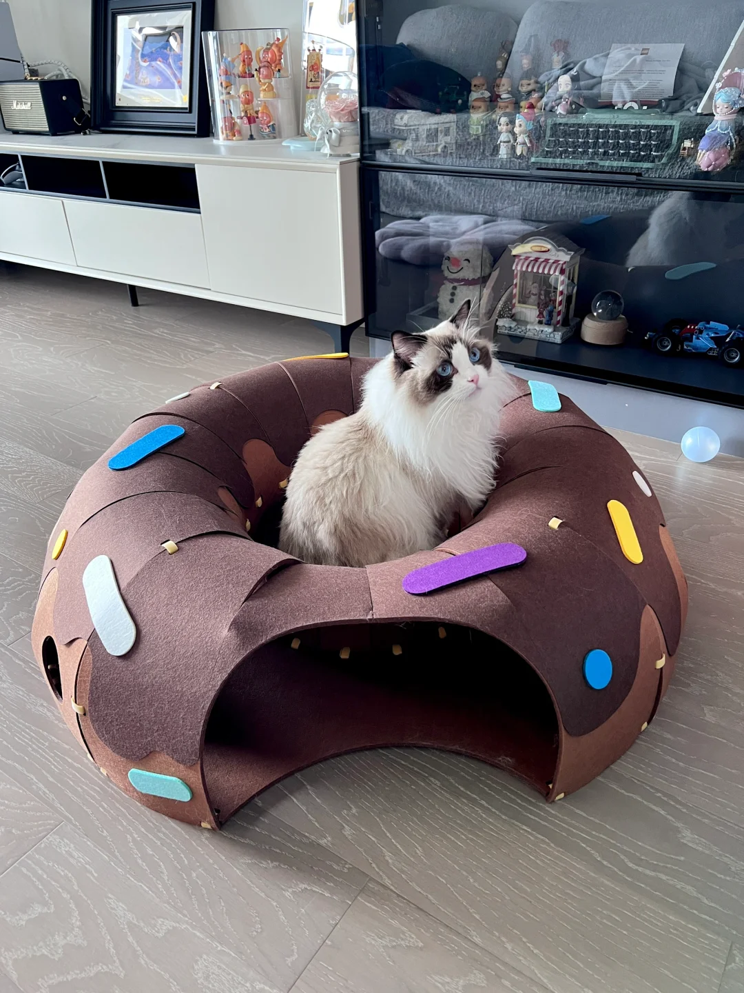 安装有点费劲,每个小孔都要自己手动绑带 装饰点缀也需要自己设计一下 但成品真的很值得!! 颜值很高的一款隧道!! 寿司很爱钻进去躲着 或者直接在里面睡觉 玩逗猫棒配合甜甜圈也更好玩了 总之隧道类玩具真的太符合猫咪天性了 怎么买都不会出错! 唯一缺点是太粘毛 清理也有点费劲 但孩子喜欢 无所谓! 购于Queen喵的王国