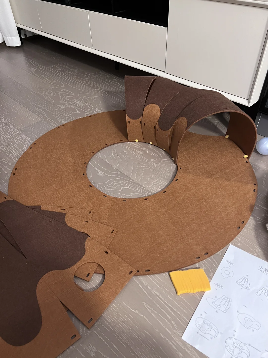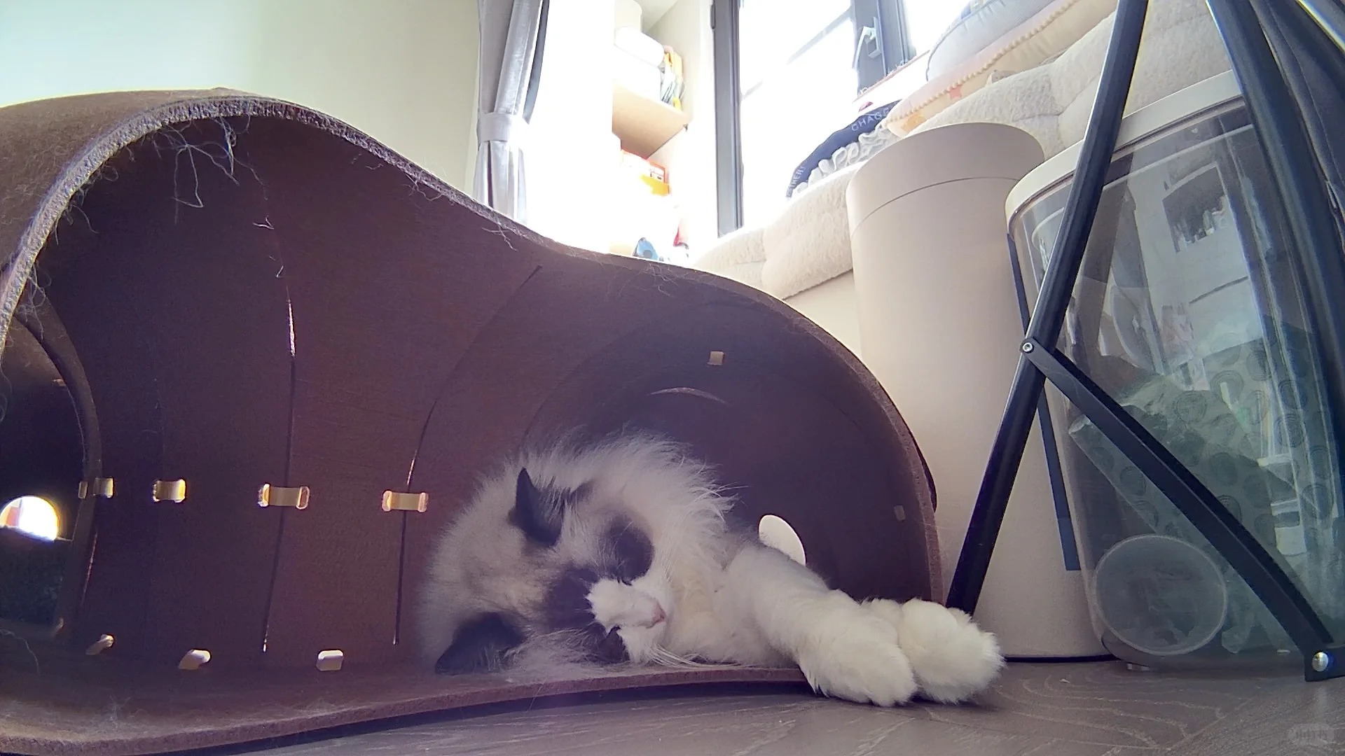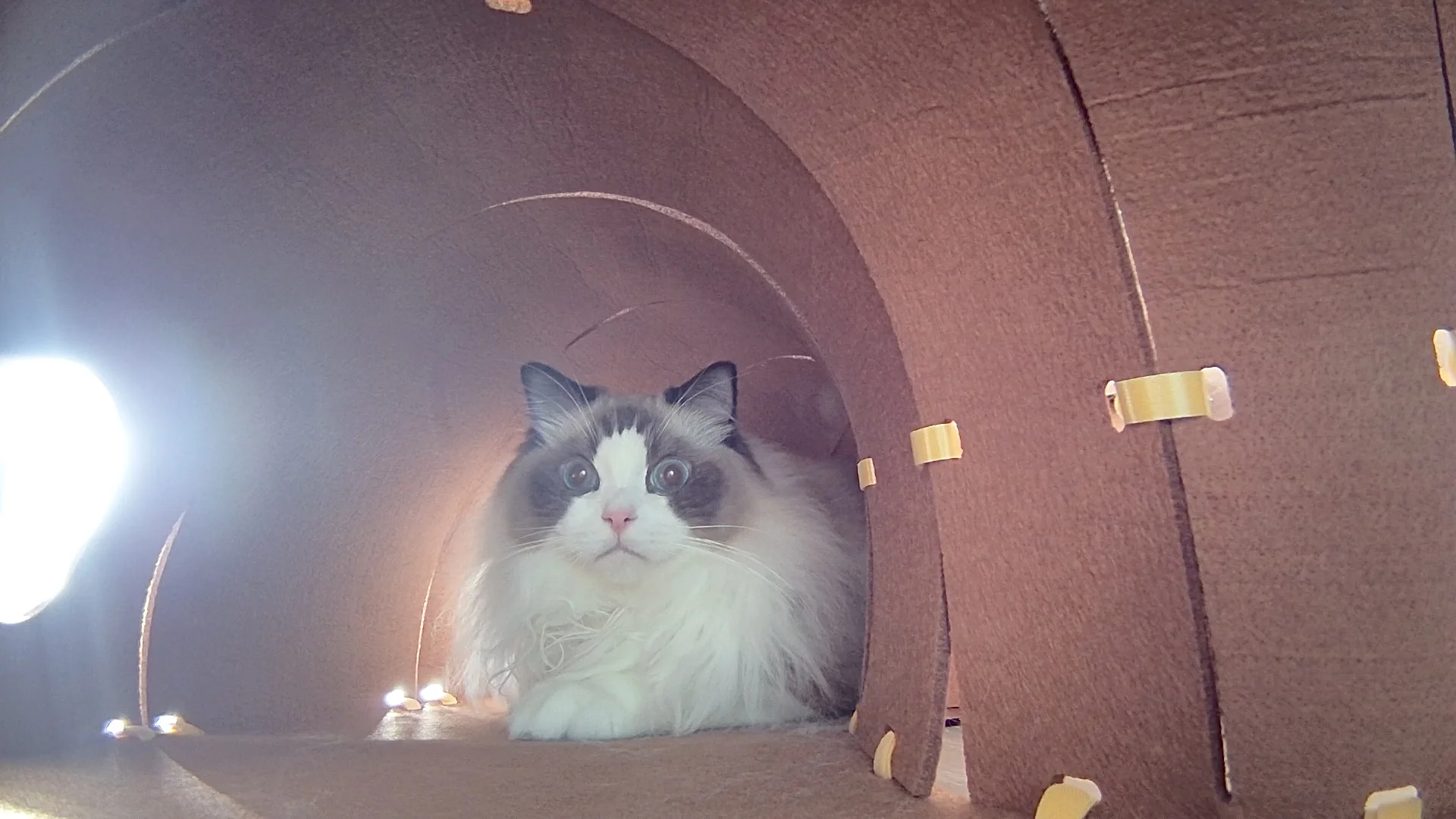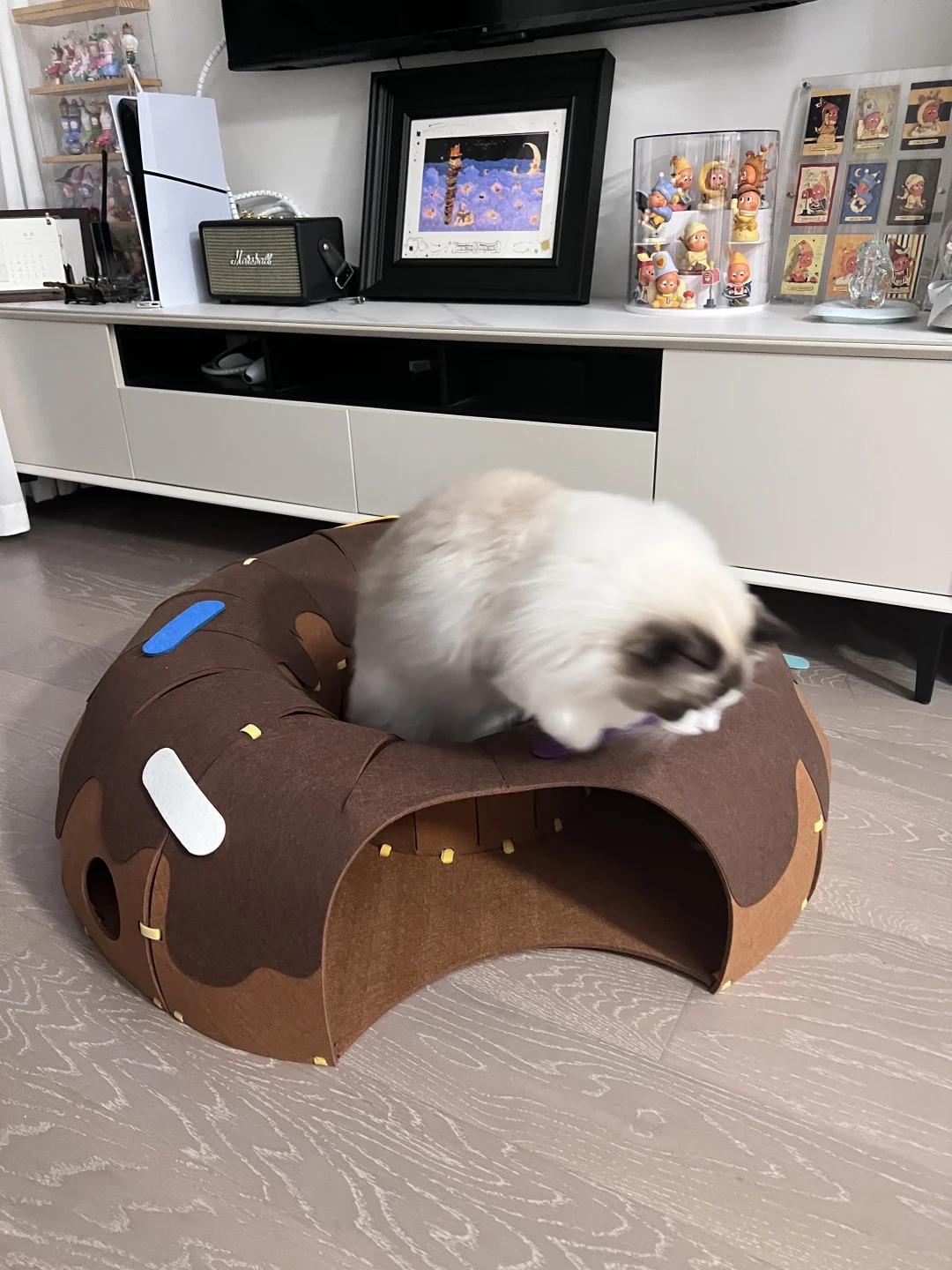 安装有点费劲,每个小孔都要自己手动绑带 装饰点缀也需要自己设计一下 但成品真的很值得!! 颜值很高的一款隧道!! 寿司很爱钻进去躲着 或者直接在里面睡觉 玩逗猫棒配合甜甜圈也更好玩了 总之隧道类玩具真的太符合猫咪天性了 怎么买都不会出错! 唯一缺点是太粘毛 清理也有点费劲 但孩子喜欢 无所谓! 购于Queen喵的王国