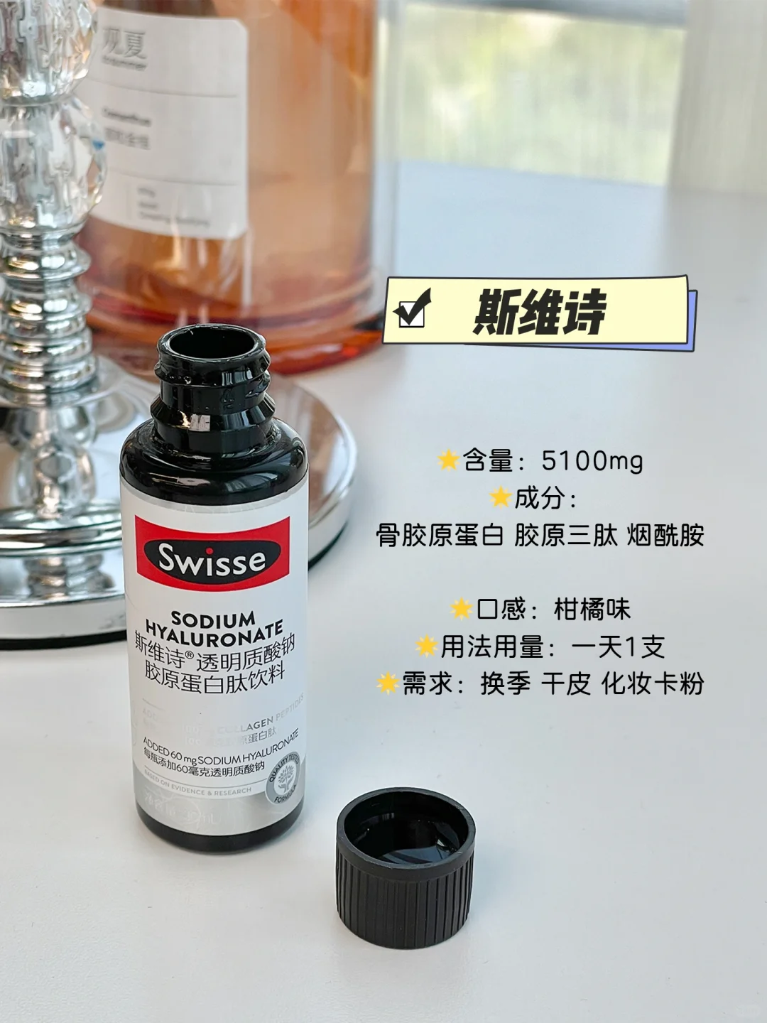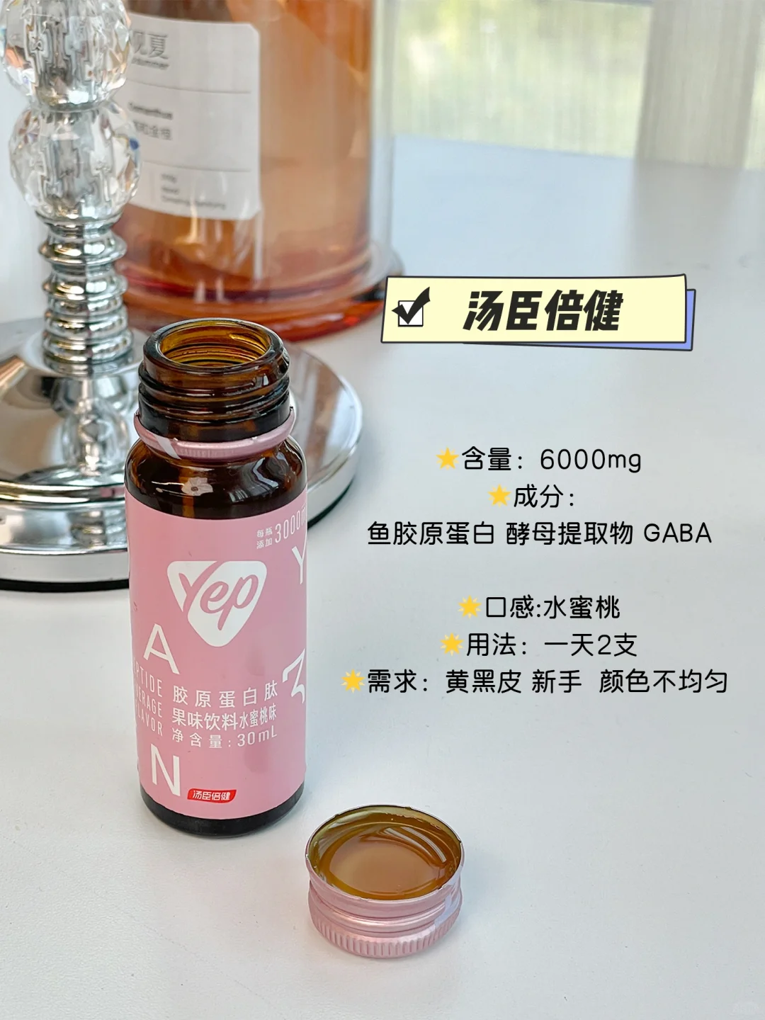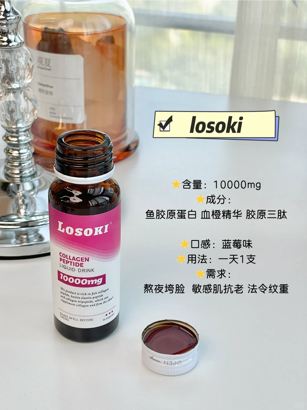 --每天1~2瓶睡前或者随餐喝都可以(促进胶原蛋白吸收)